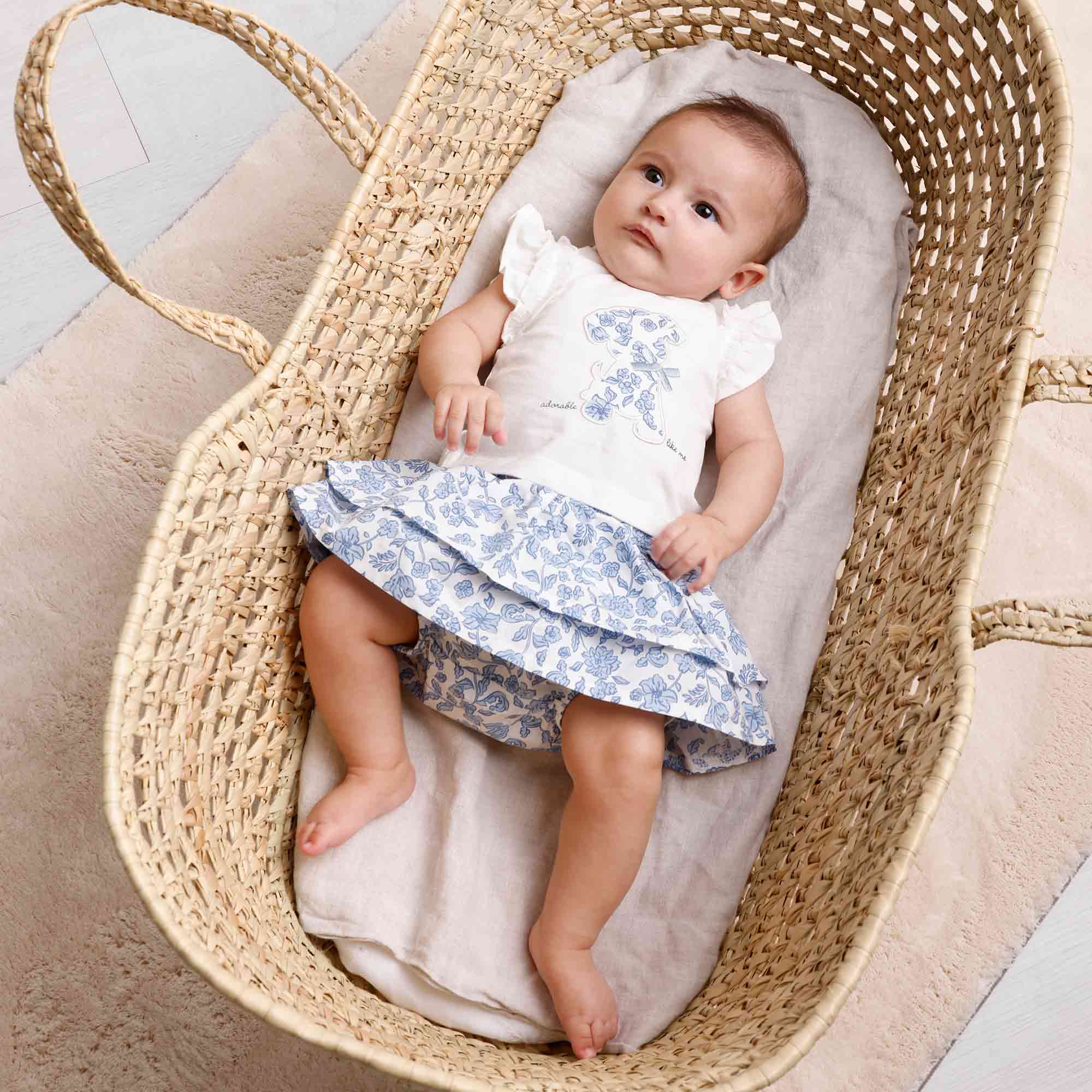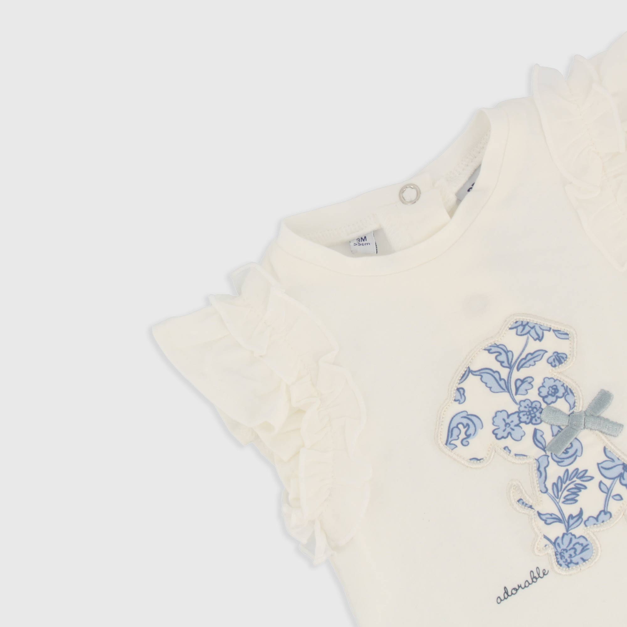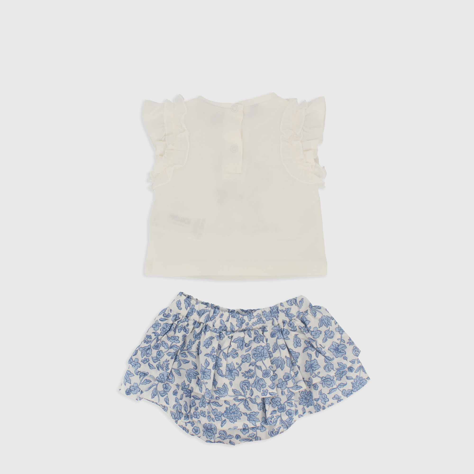 Set bestehend aus zwei Teile. T-Shirt aus Jersey Rundhals, kurzarm mit Rueschen auf der Schulter. Hinterer Verschluss mit automatische Knoepfe. Hunde-Patch vorne. Hoeschen aus bedruckte Baumwolle, mit elastische Taille und doppelt-Volant.