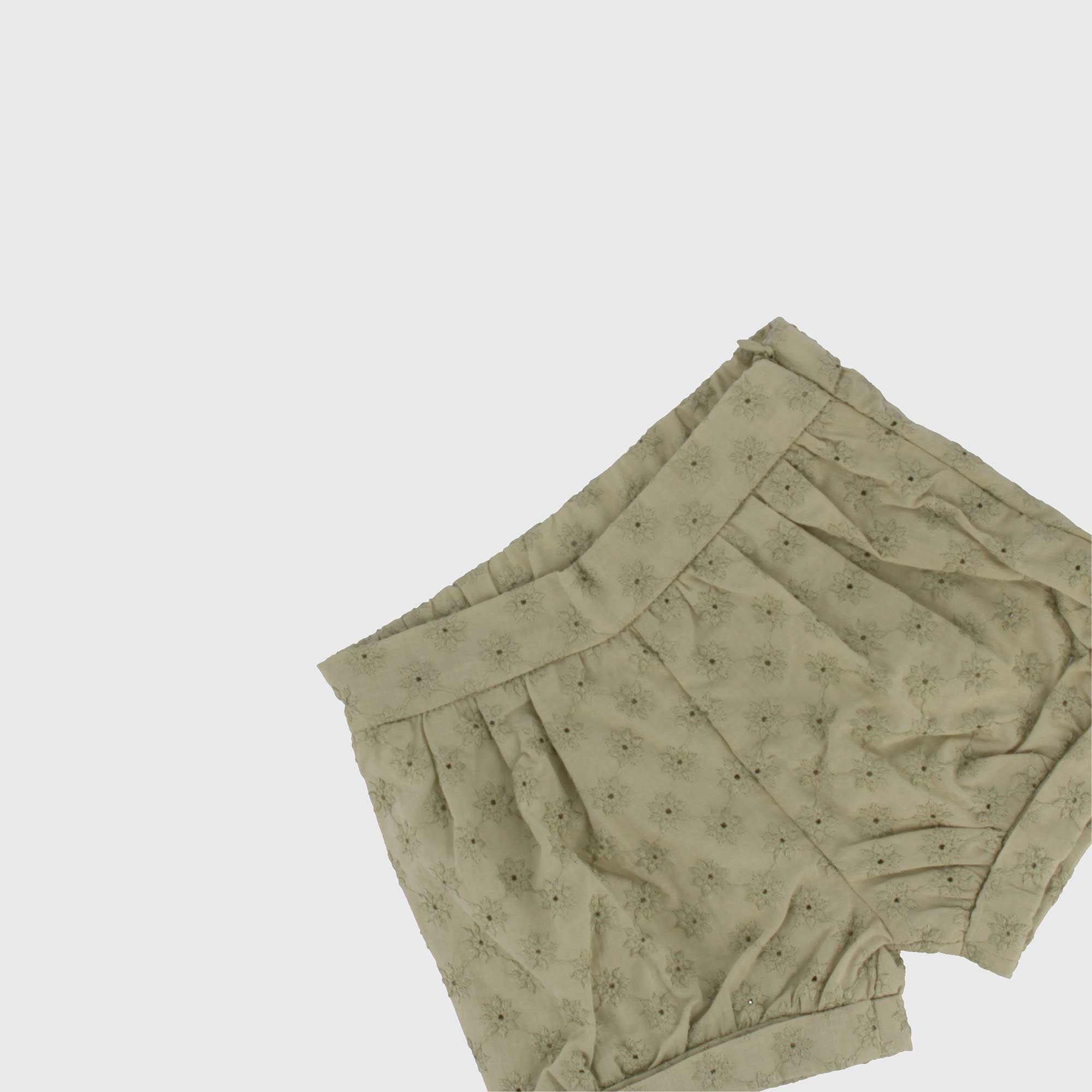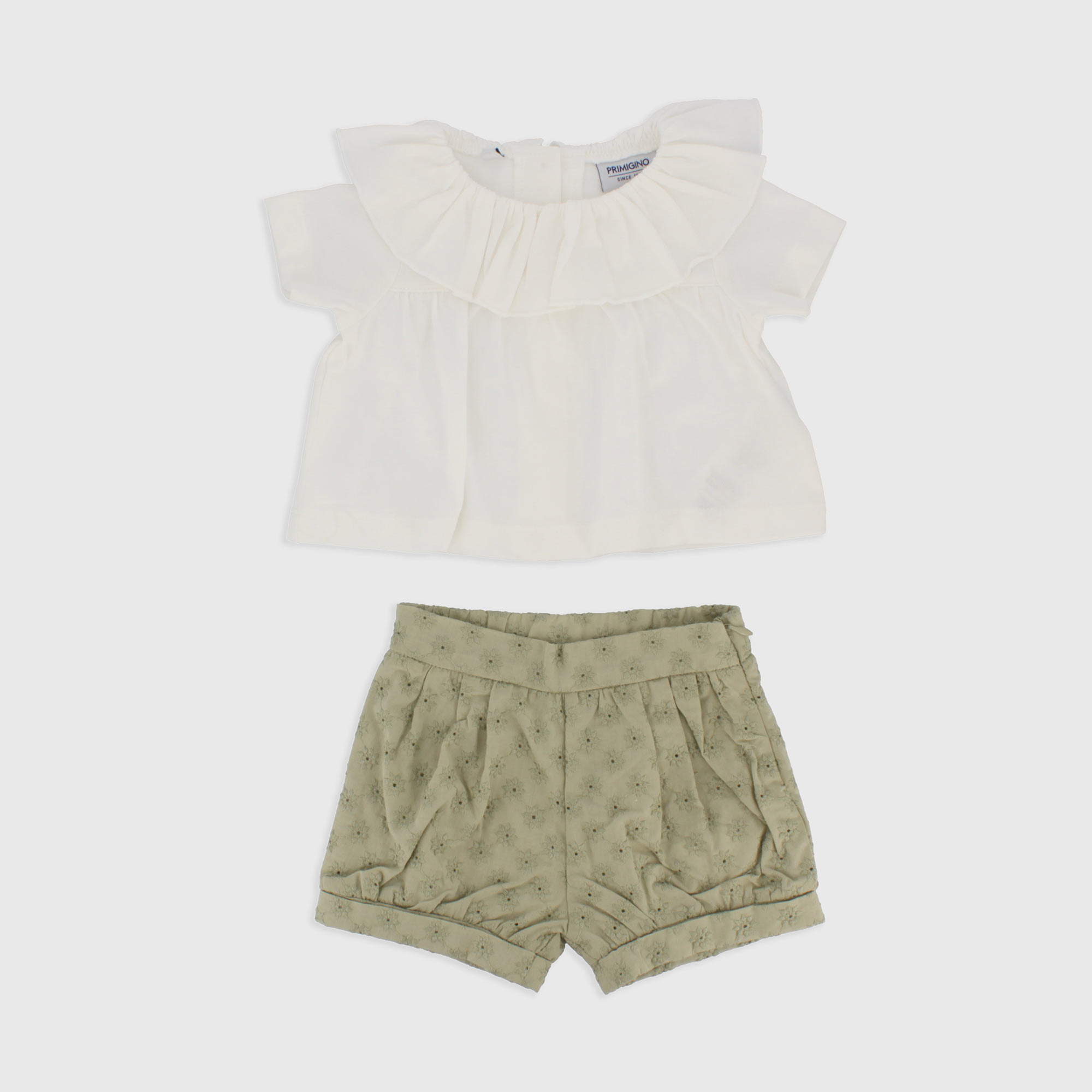 Set bestehend aus zwei Teile. T-Shirt aus Jersey mit Rueschen auf dem Kragen, Kurzarm. Hinterer Verschluss mit Knoepfe. Hose aus San Gallo Spitze mit elastische Taille.