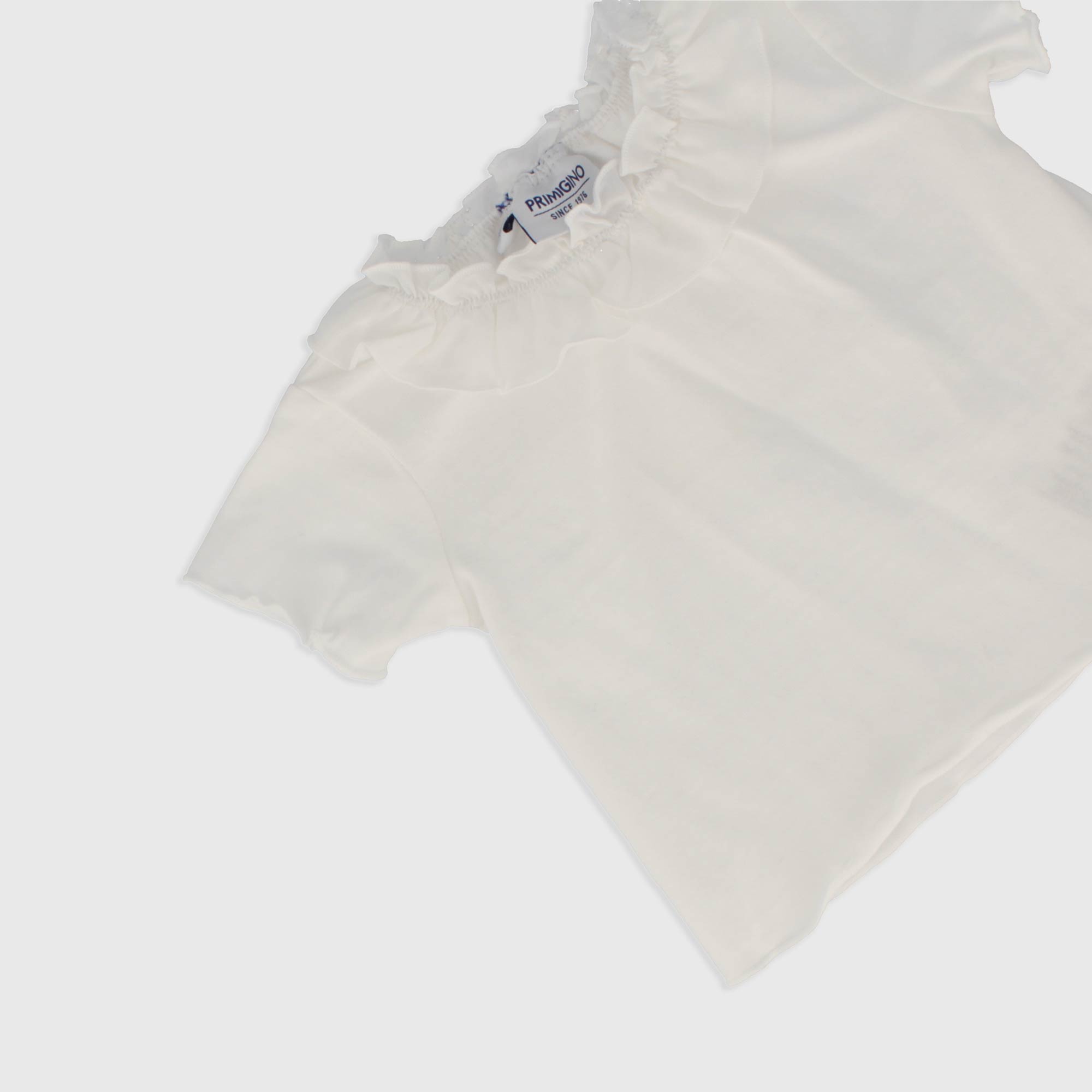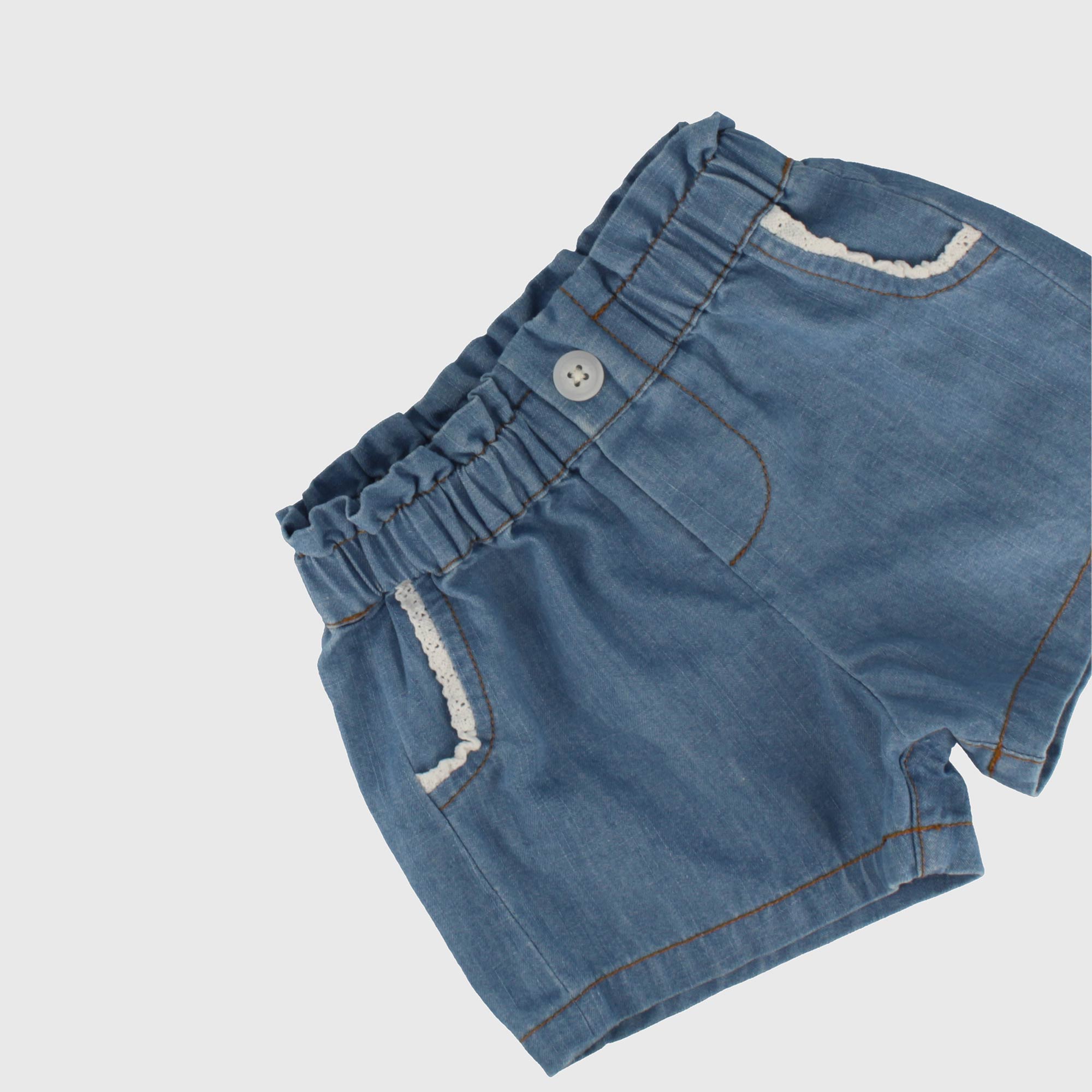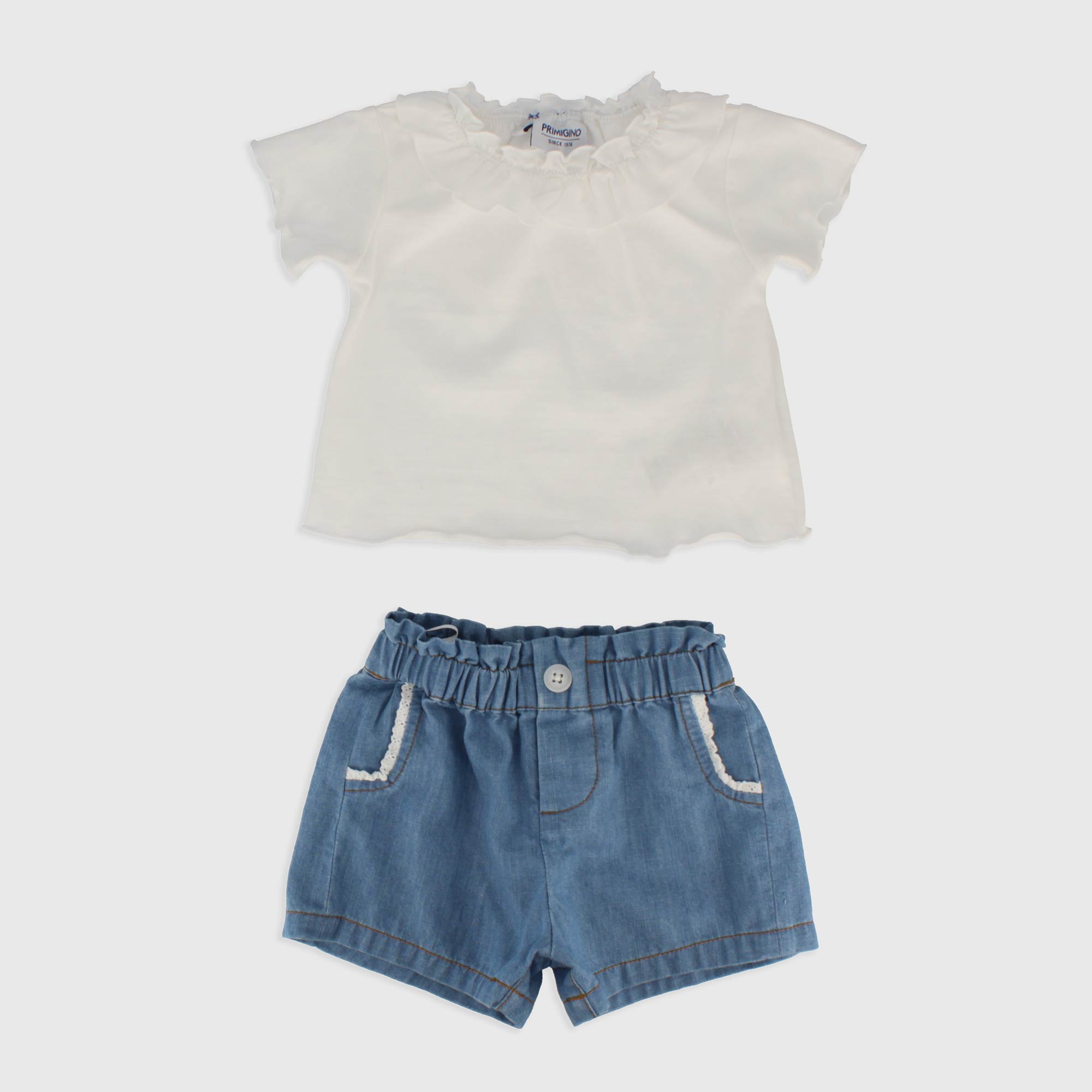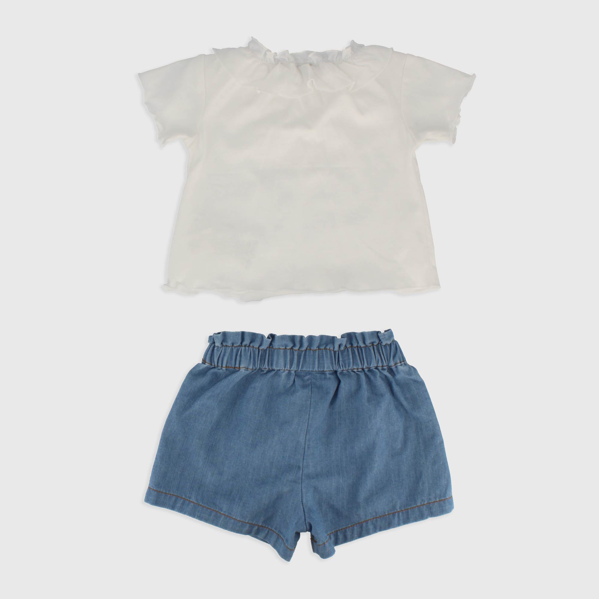 Set bestehend aus zwei Teile. T-Shirt aus Jersey Rundhals, Kurzarm. Applizierten Rueschen am Ausschnitt. Hose aus Jeans mit elastische Taille und Knopf. Fake-Taschen und Profile mit Spitze.