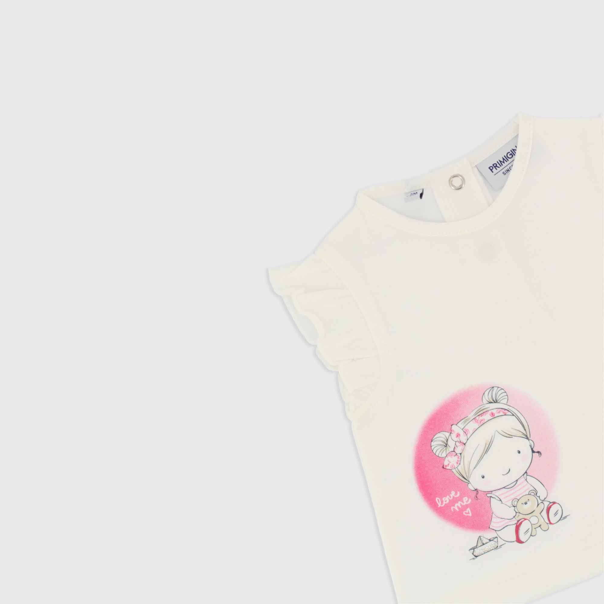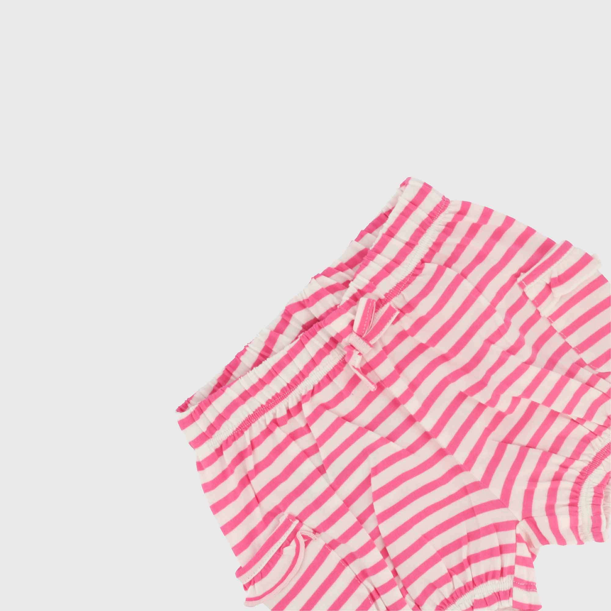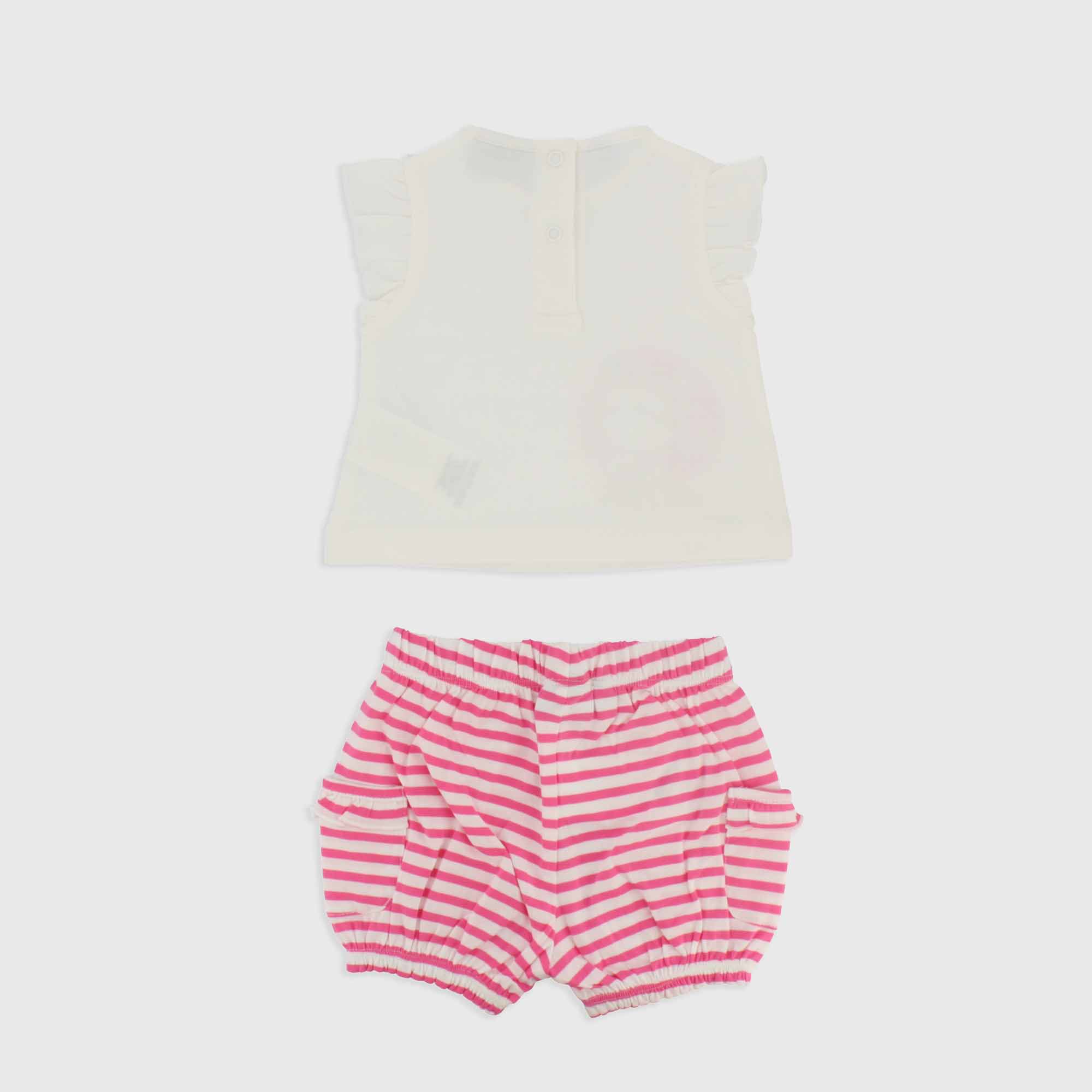 Set bestehend aus zwei Teile. T-Shirt aus Jersey Rundhals, kurzarm mit Volants. Hinterer Verschluss mit automatische Knoepfe. Druck vorne. Shorts aus Jersey, Garn gefaerbter Streifen, mit elastische Taille und Bogen. Patch-Taschen seitlich.