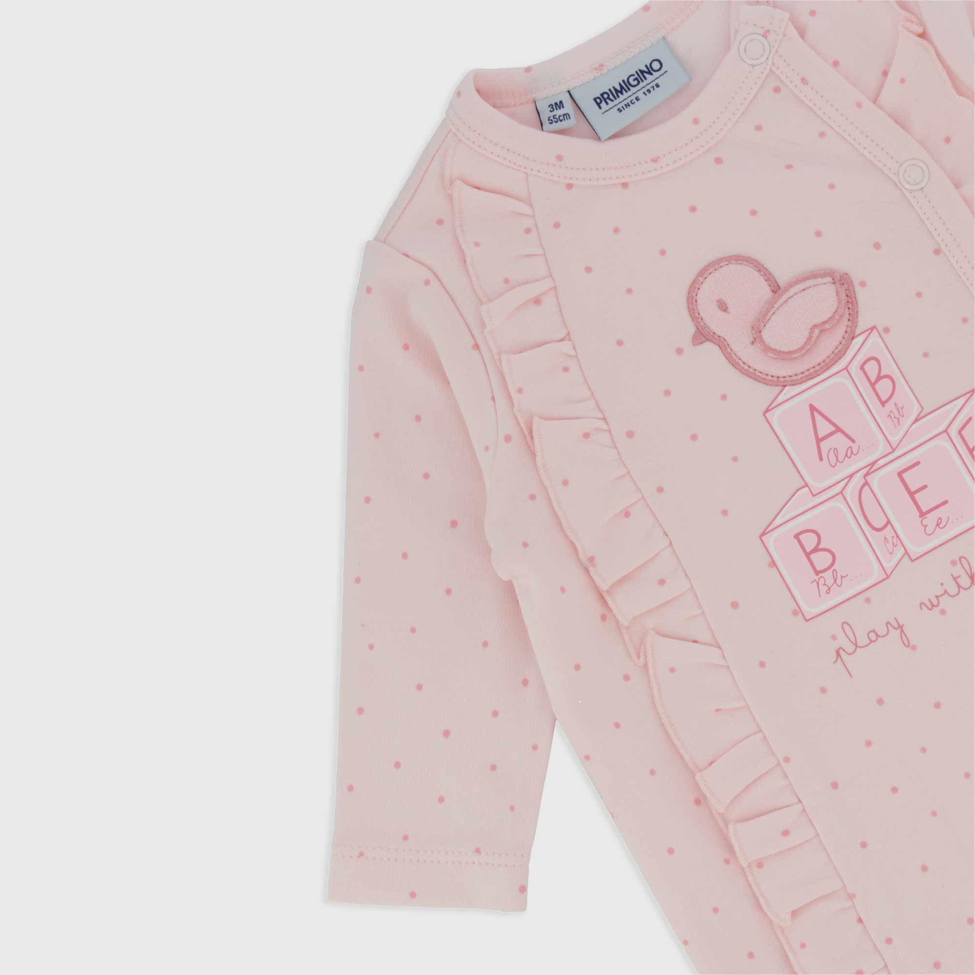Overall aus interlock mit Rundhals, Langarm. Kimono Verschluss. Mit automatische Knoepfe. All-over Aufdruck mit Tupfen. Strickerei mit Druck und Rueschen vorne.