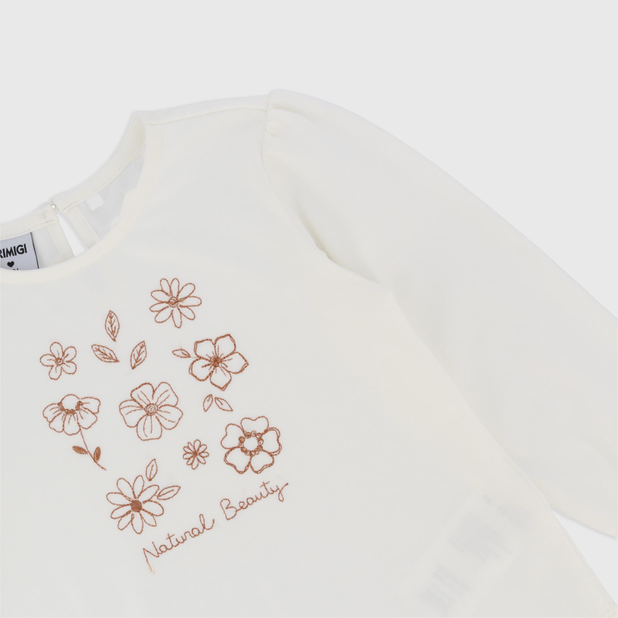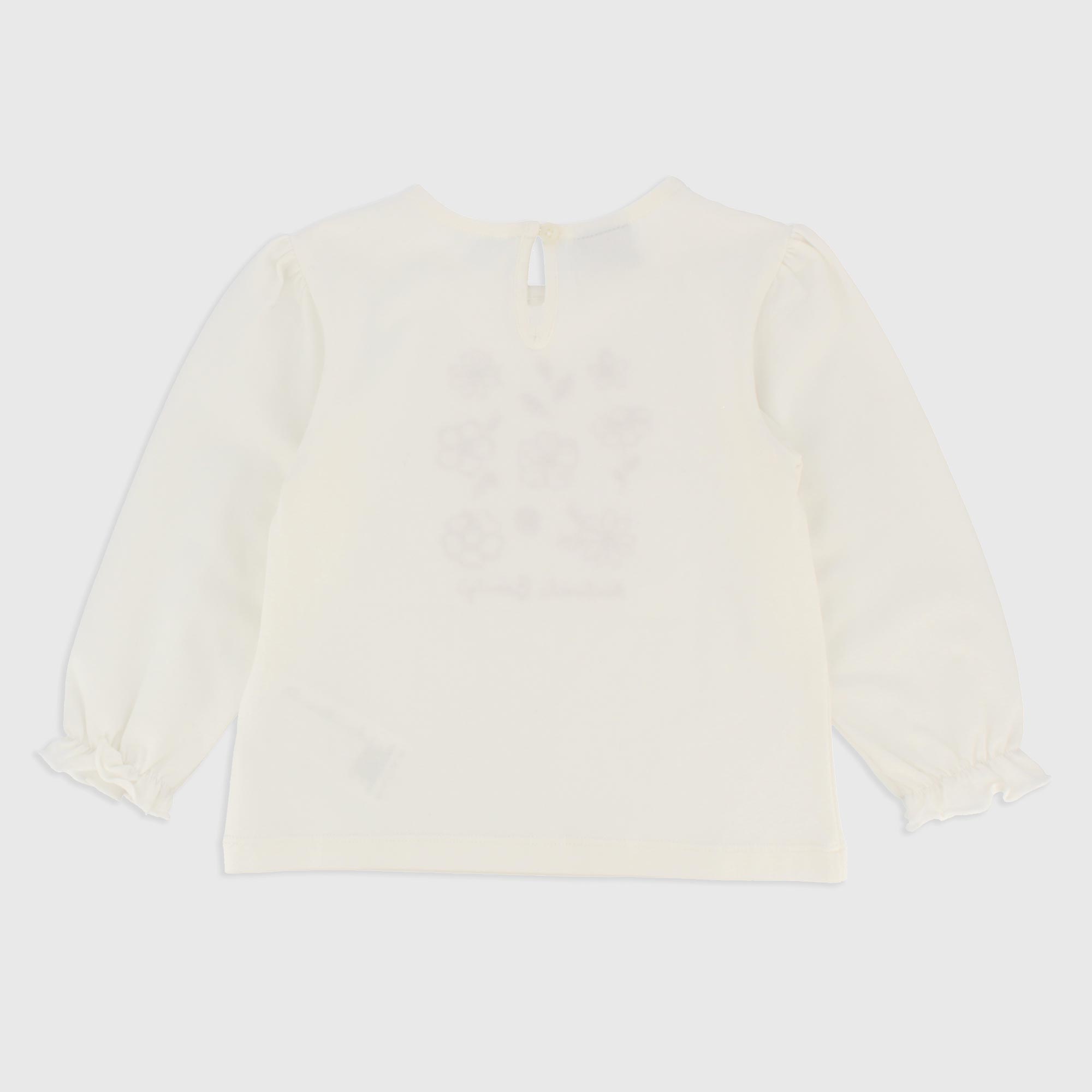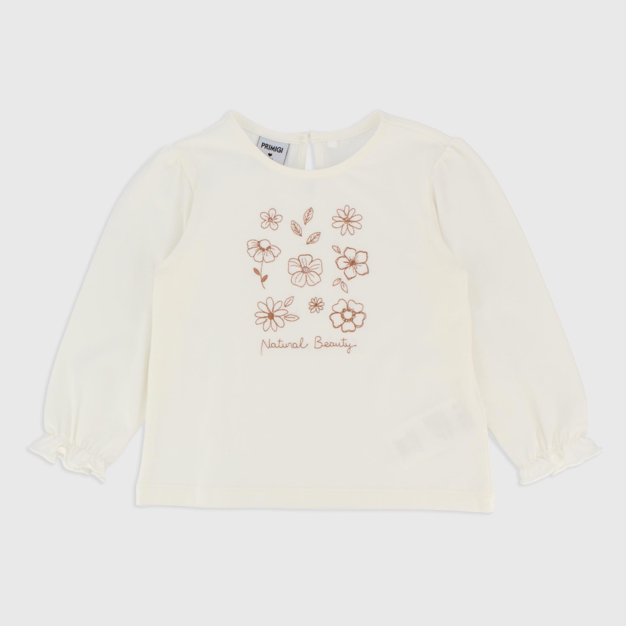 T-Shirt aus Stretch-Jersey, Rundhals, lange Aermel. Tropfenverschluss mit Knopf hinten. Stickerei vorne.