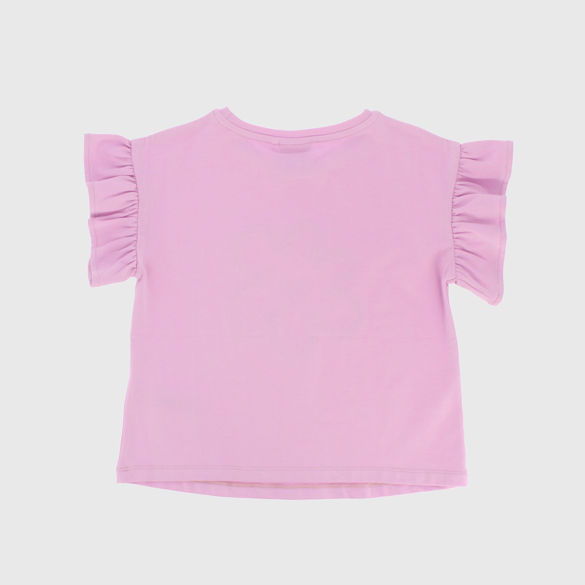 T-Shirt aus Jersey, Rundhals, kurzarm mit Volants. Druck mit Blumen-foermige Applikation vorne.