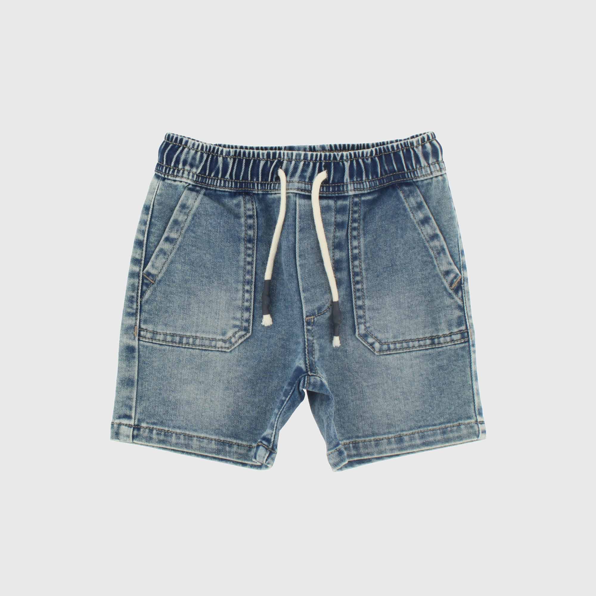 Bermuda aus Jeans mit vordere Schnuersenkel, Franzoesische Taschen vorne und aufgesetzte Taschen, mit Patch hinten.