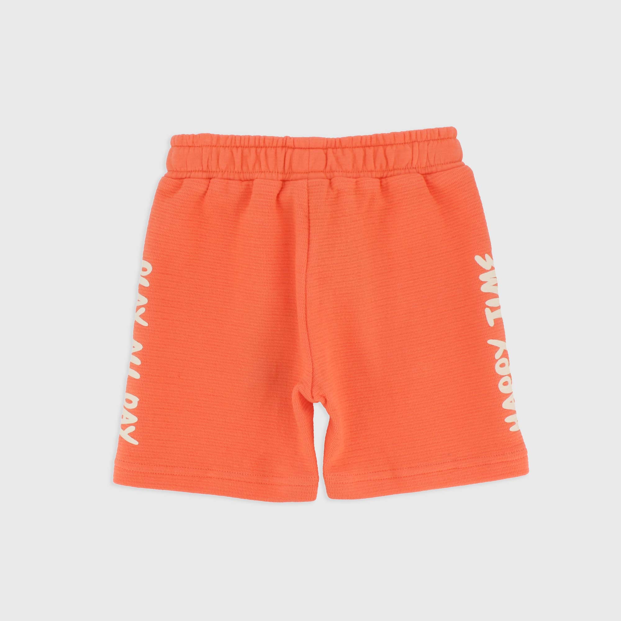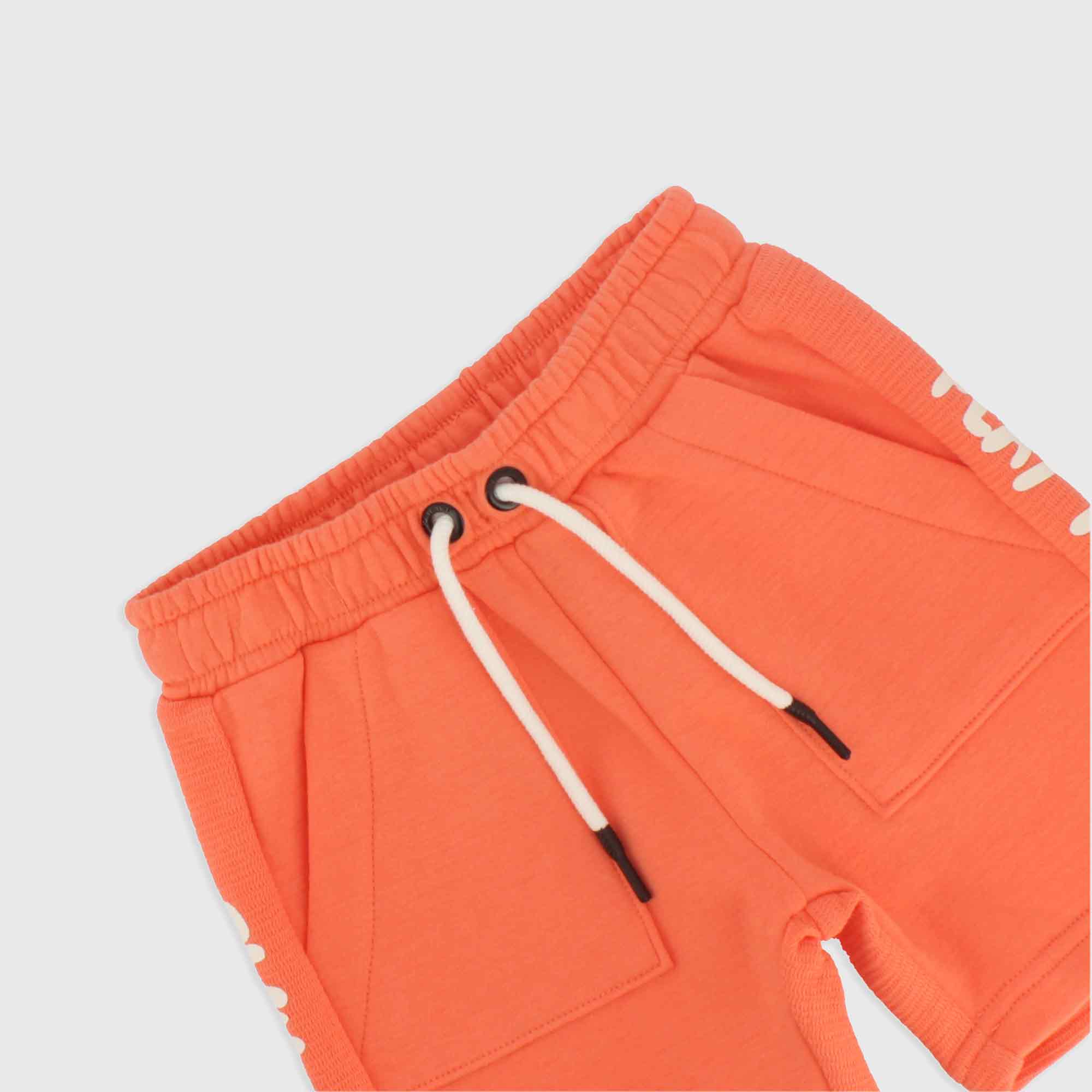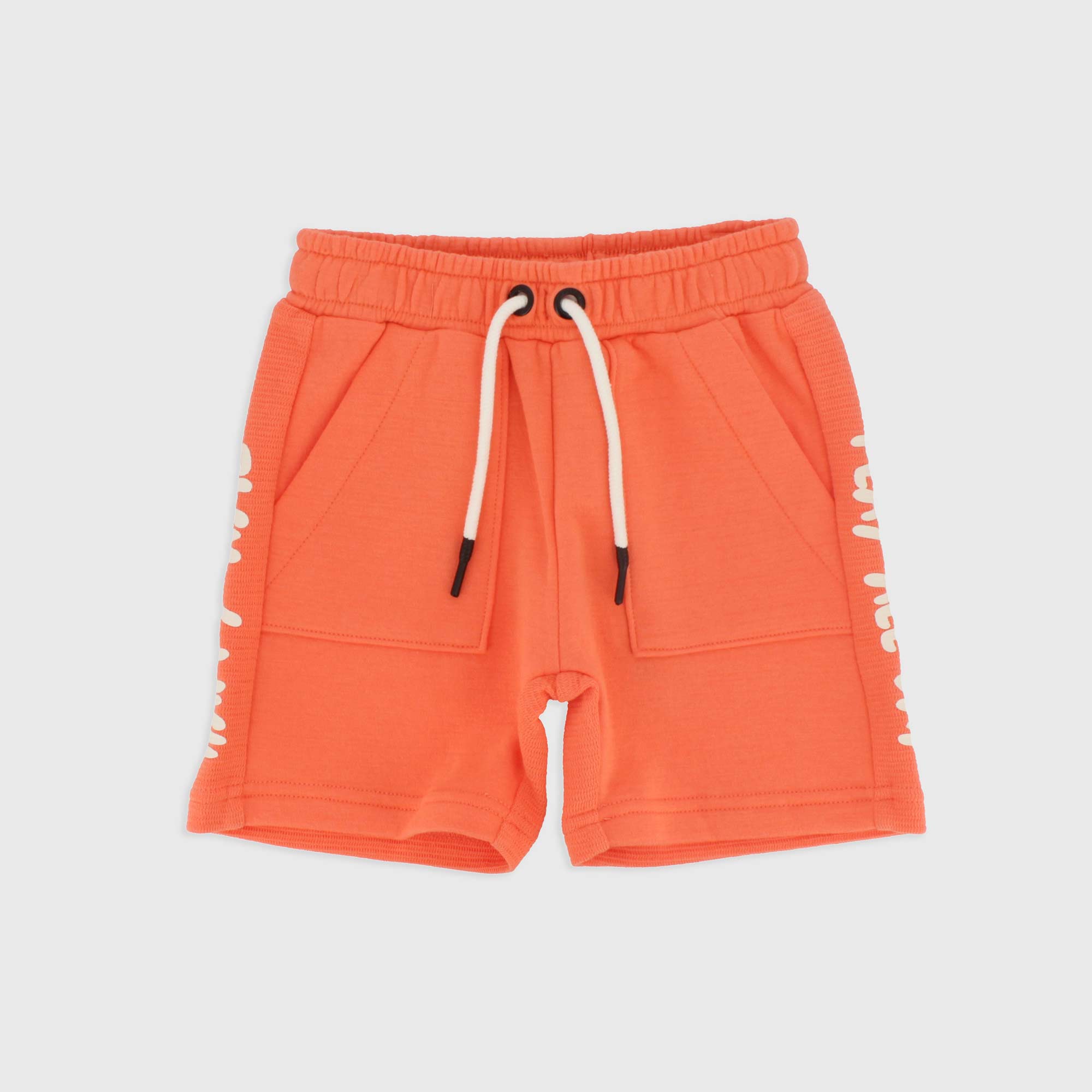 Bermuda aus Fleece mit elastische Taille und vordere Schnuersenkel, franzoesiche Taschen und gedruckte Schrift auf der Seite.