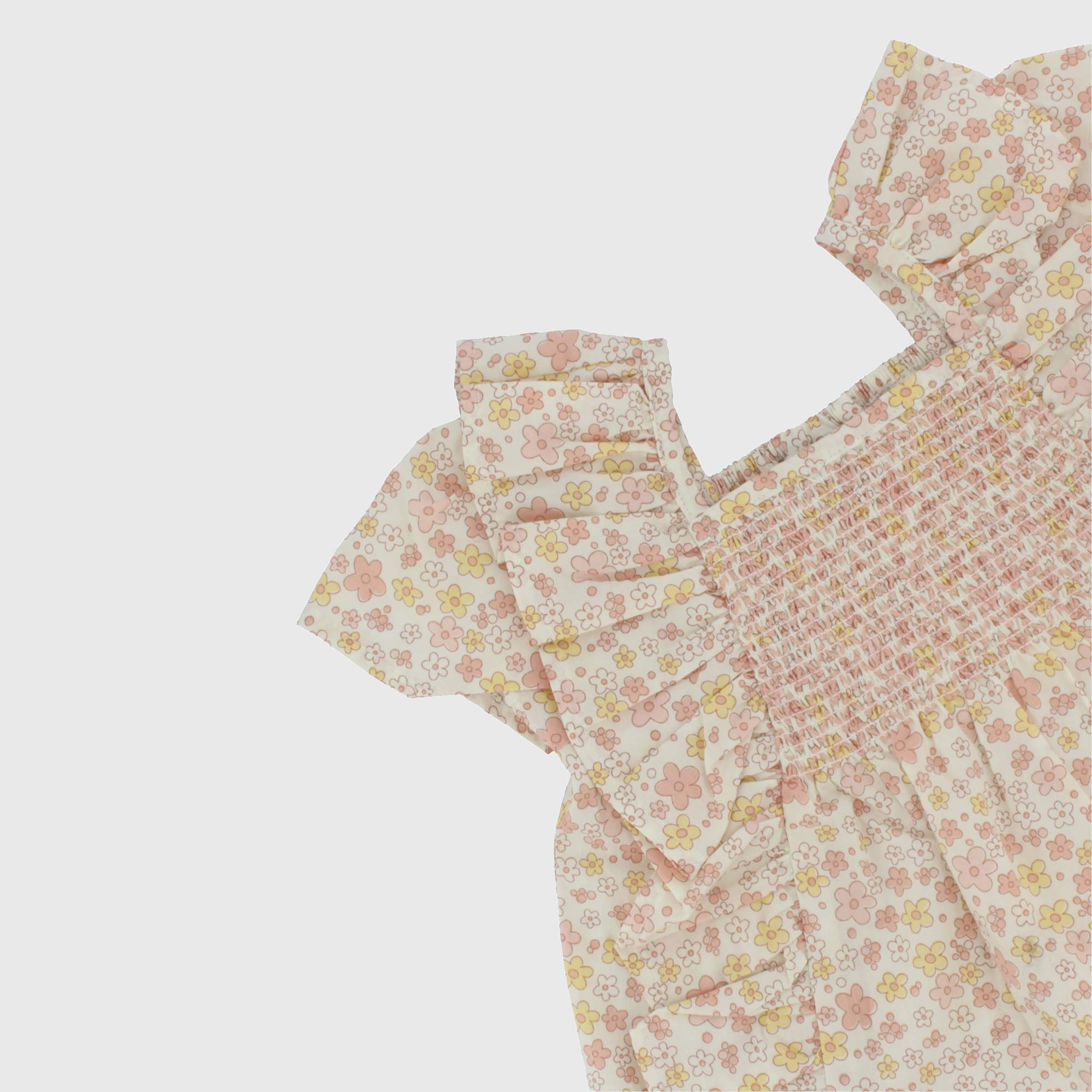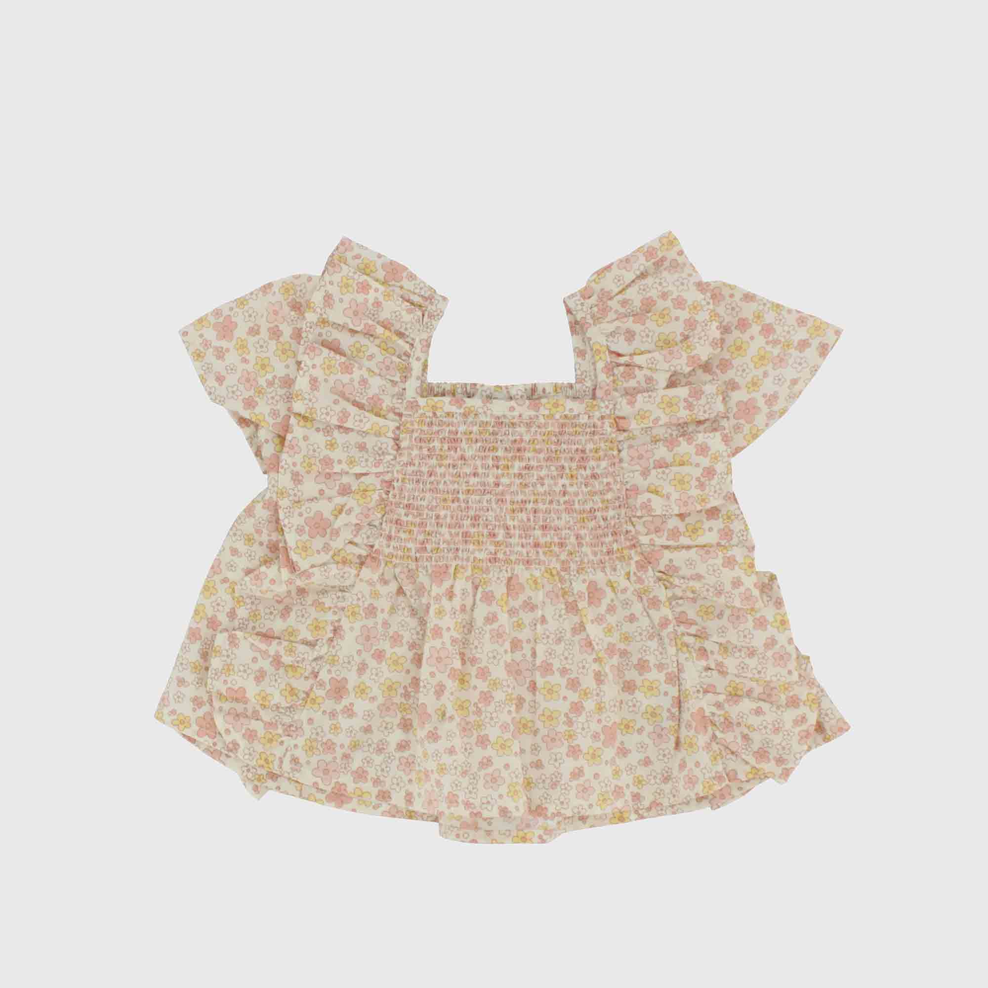 Bluse aus bedruckte Baumwolle, quadratischer Ausschnitt mit Kurzaermel und applizierte Rueschen. Elastische Raffung an Schultern und Ruecken.