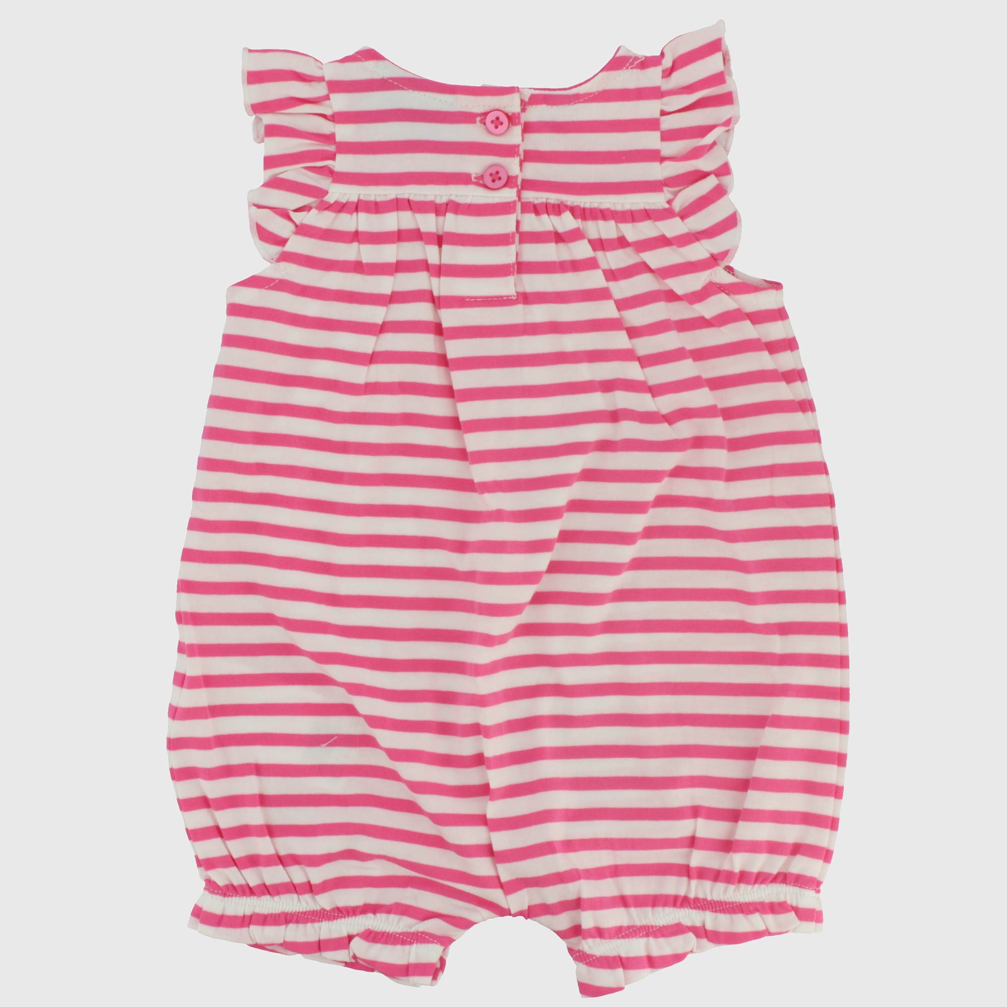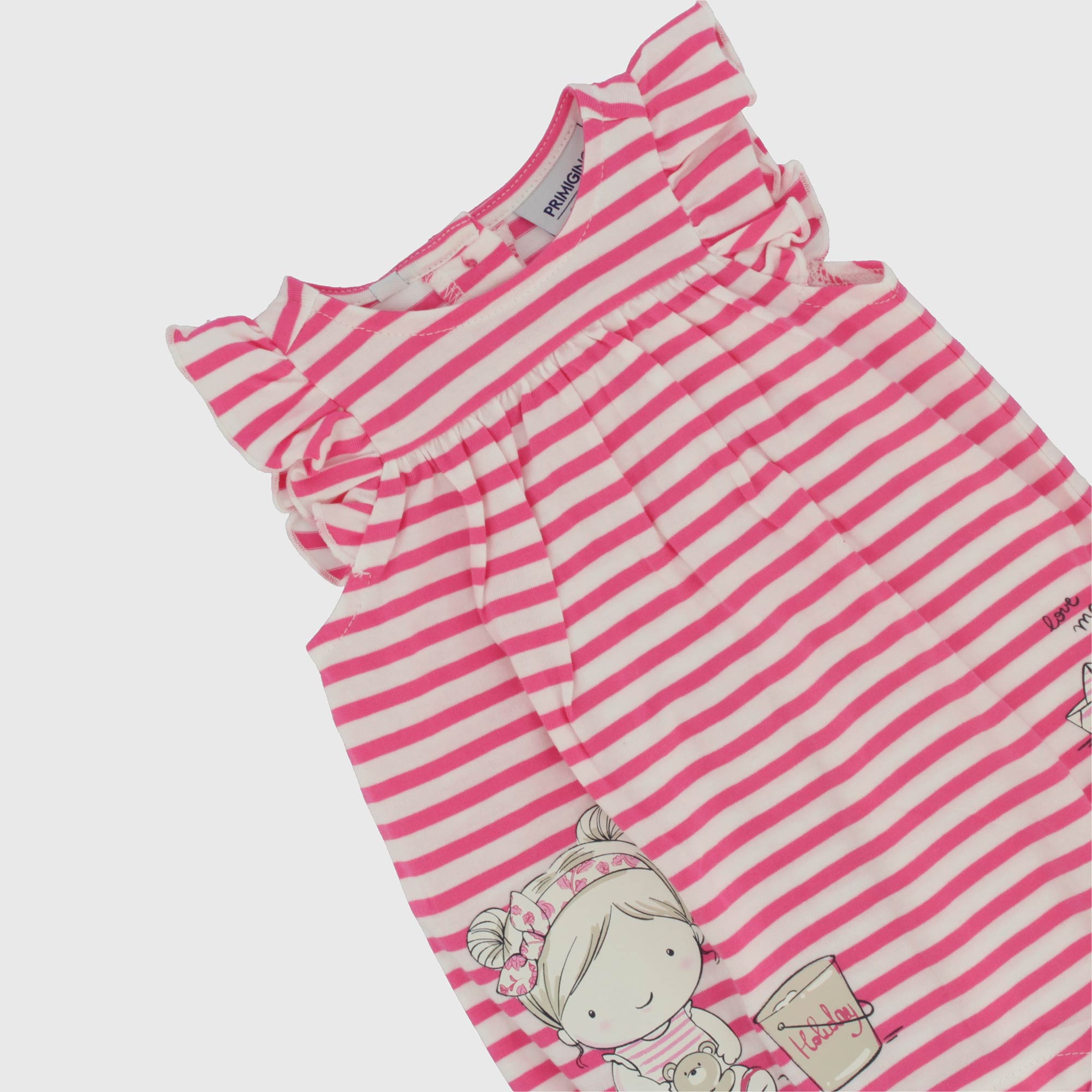 Anzug aus Jersey mit Garn gefaerbte Streifen, Rundhals, ohne Aermel. Verschluss hinten und Schritt mit Knoepfe. Rueschen auf der Schulter und Druck vorne.