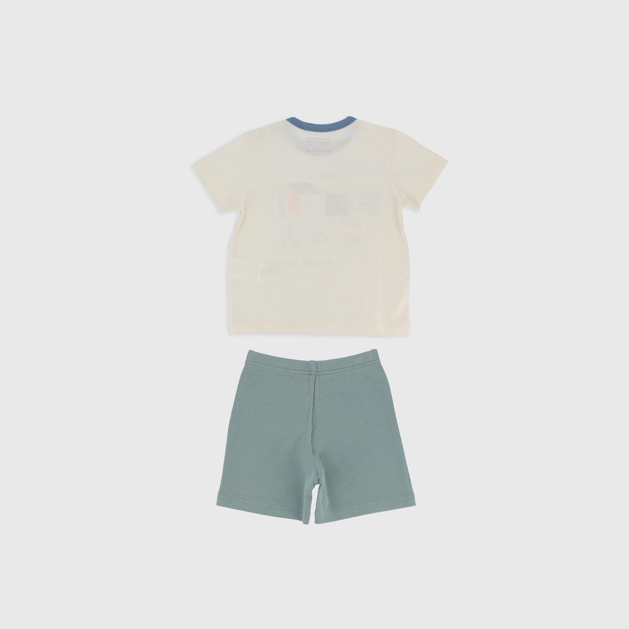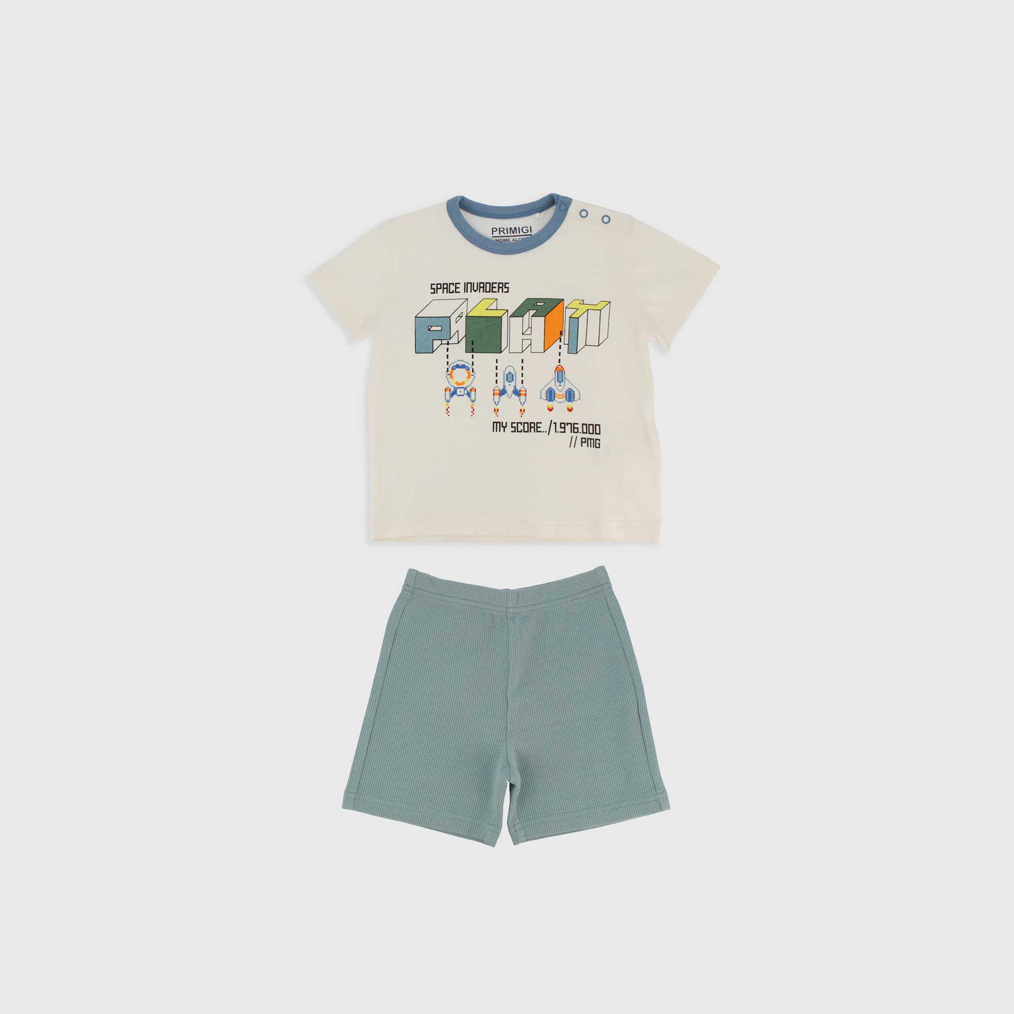 Set Pyjama aus jersey. T-Shirt Rundhals mit kurzen Aermeln, Verschluss mit automatische Knoepfe auf der Schulter. Druck vorne. Bermuda, Wabeneffekt mit elastische Taille.