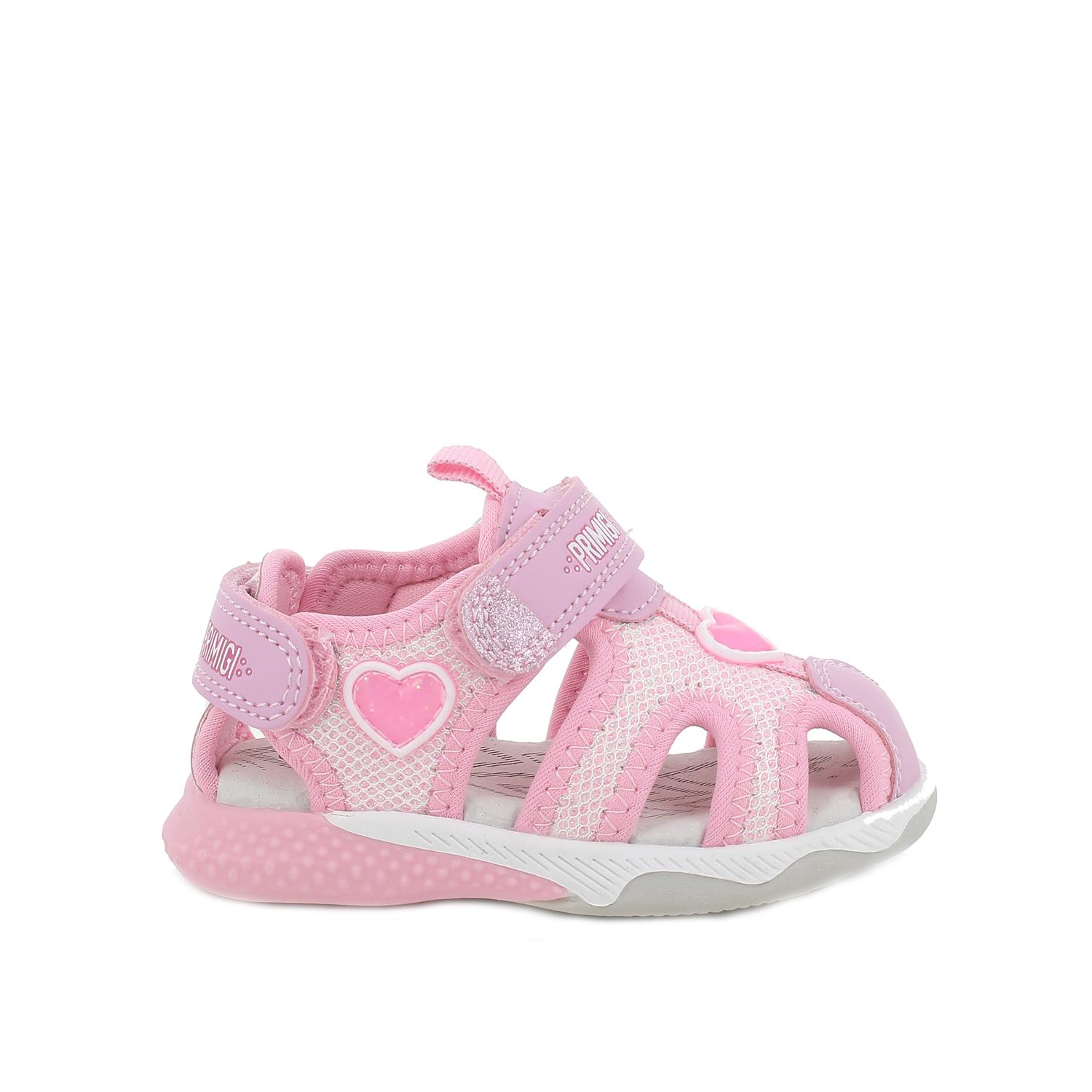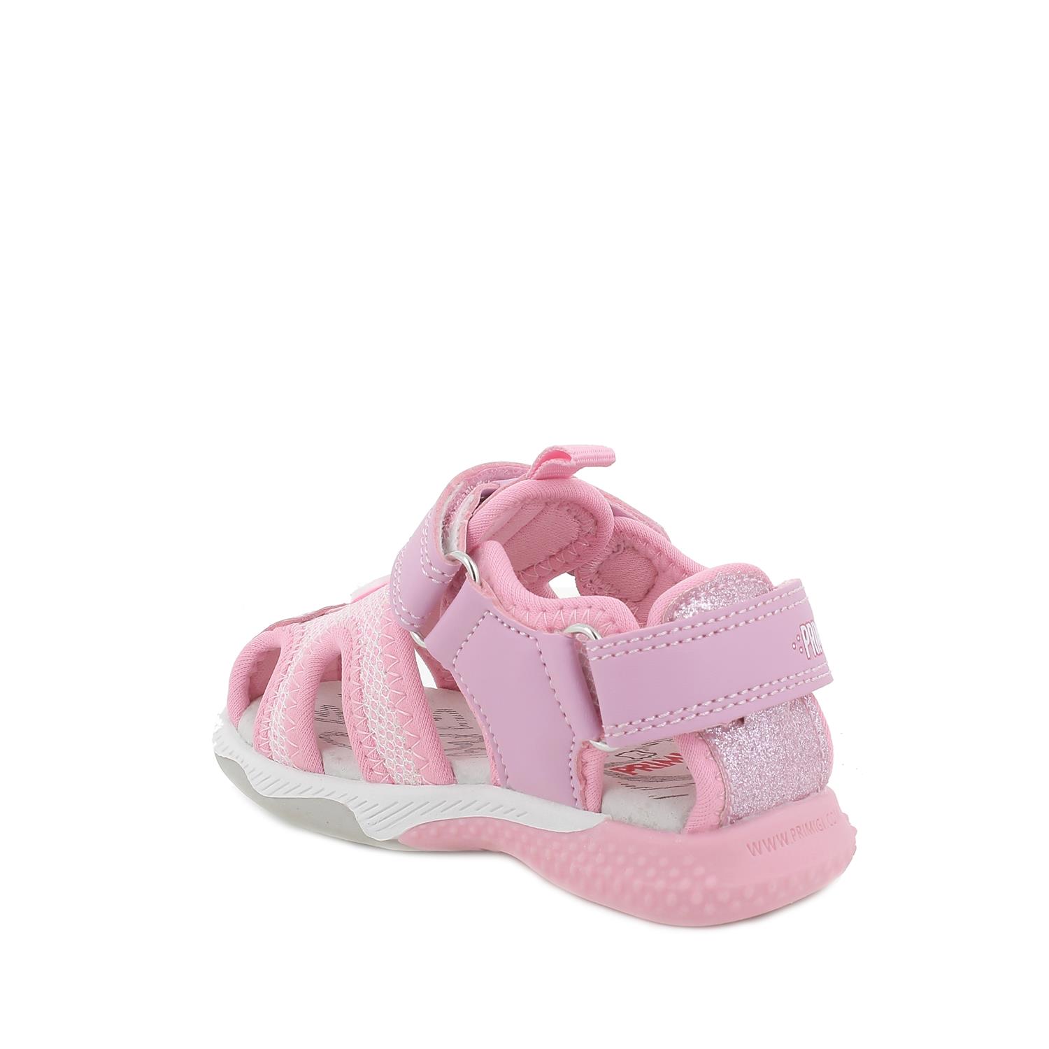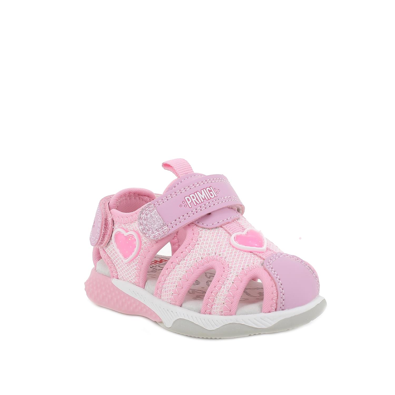Sandalen für die ersten Schritte aus Stoff, die sich ohne Einschränkungen an die Form des Fußes anpassen. Dank der doppelten Riemen lassen sie sich leicht anziehen. Sie haben Gummiverzierungen und Schutzeinsätze an der Spitze. Die strukturierte und widerstandsfähige Sohle isoliert vor Unebenheiten des Bodens. Die Innensohle ist aus Leder.