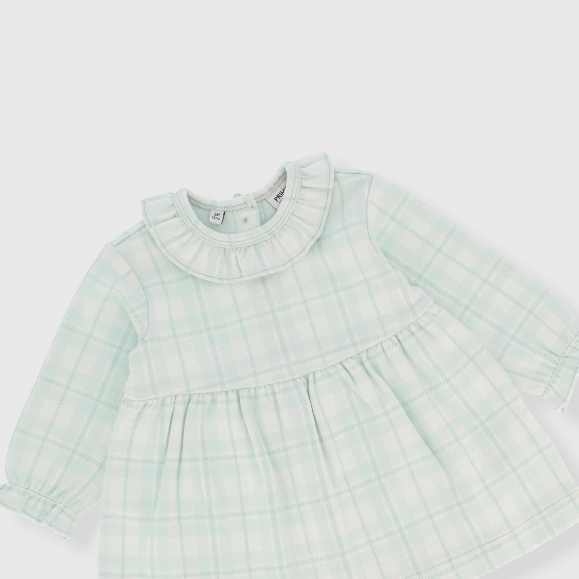 Kleid aus kariertem Stoff mit Rundhalsausschnitt und applizierten Rüschen. Lange Ärmel mit Raffungen und Rüschen. Knopfverschluss auf der Rückseite.