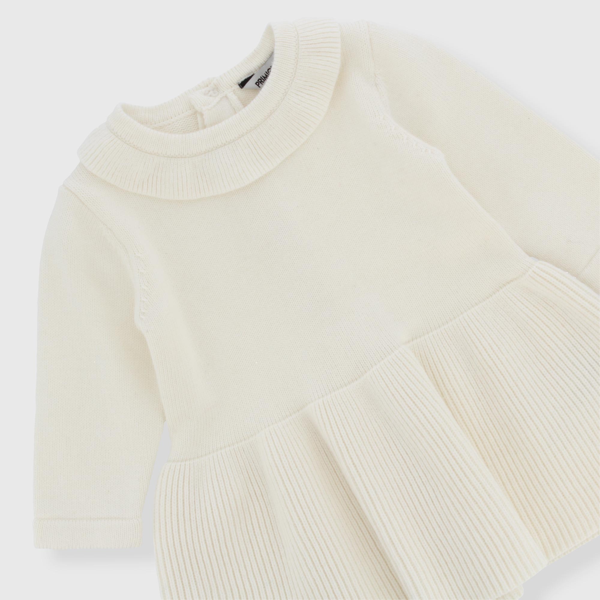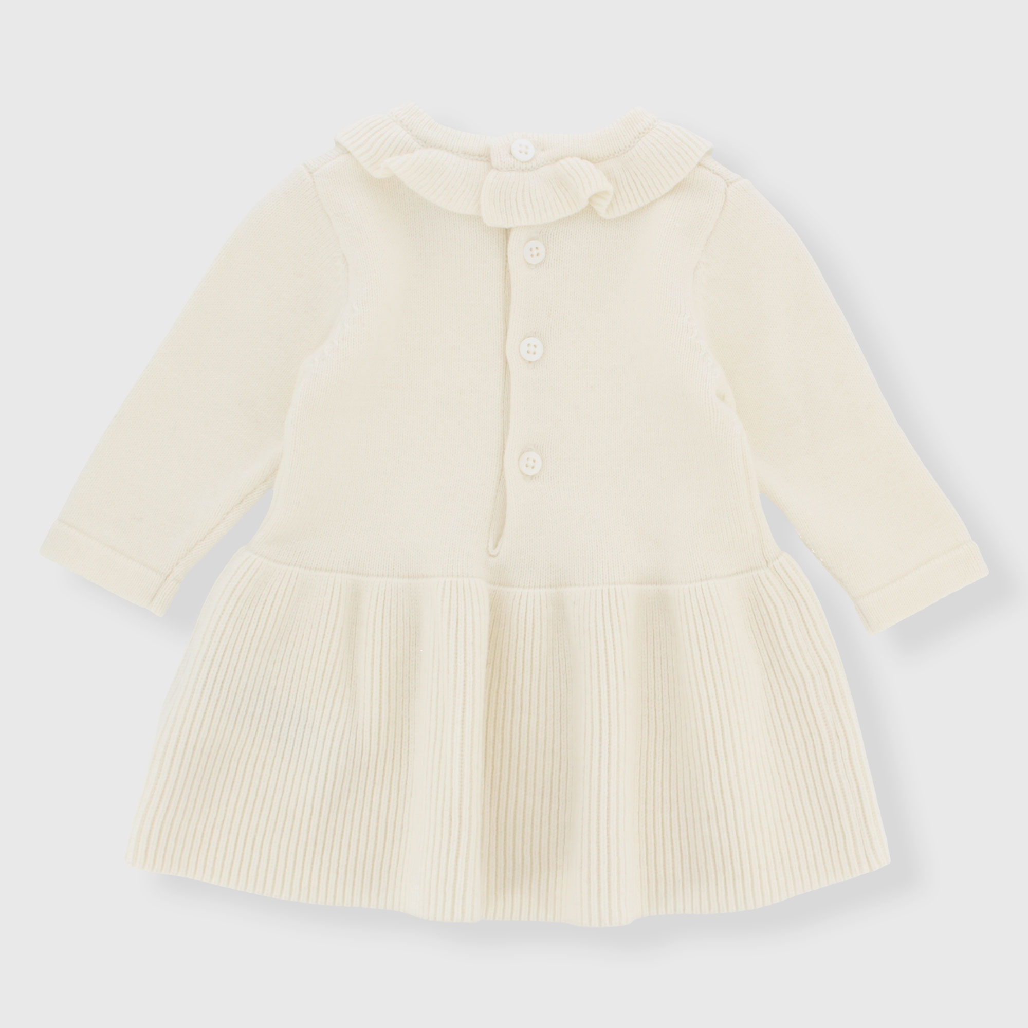 Weiches Strickkleid mit Rundhalsausschnitt und langen Ärmeln. Rüschen am Ausschnitt. Knopfverschluss auf der Rückseite.