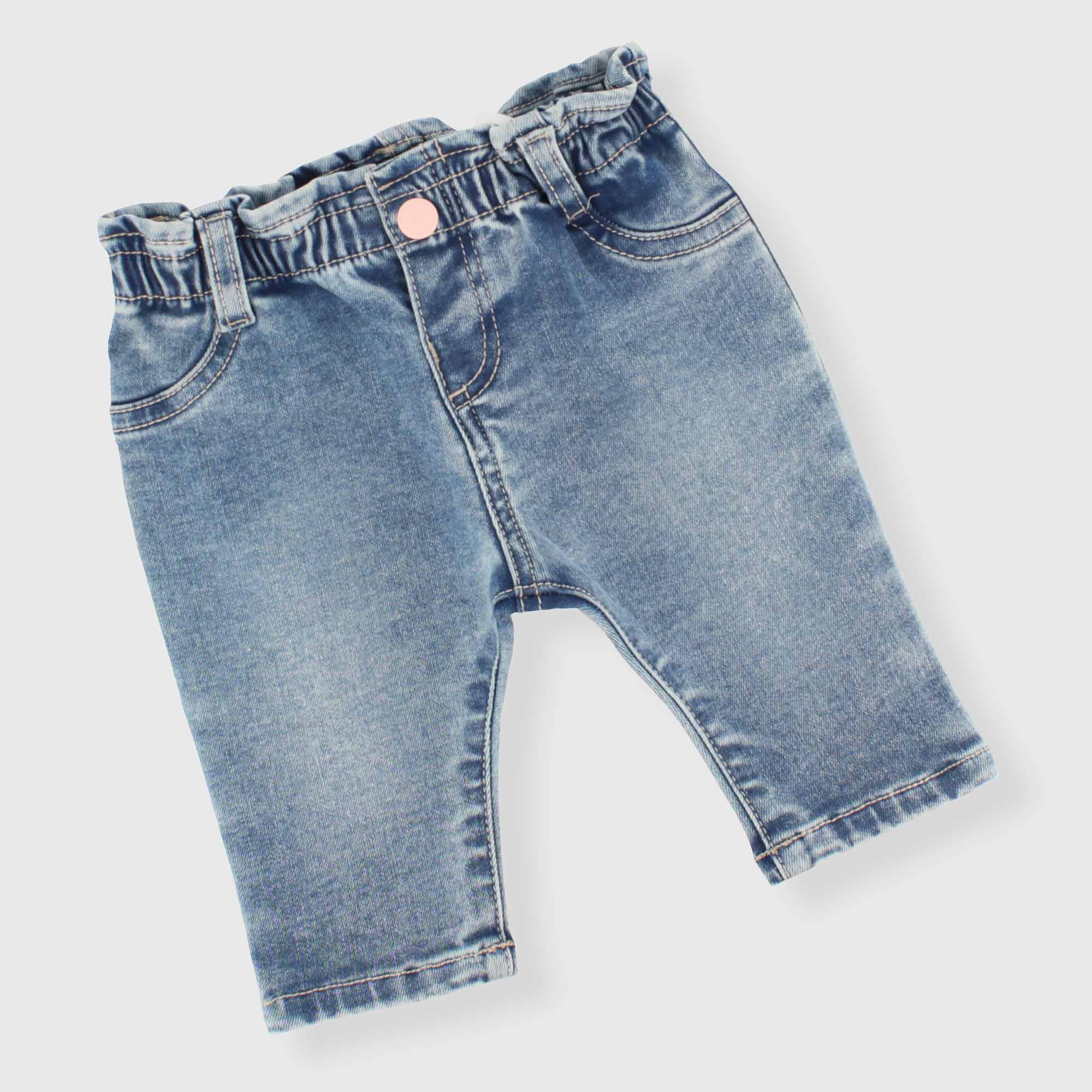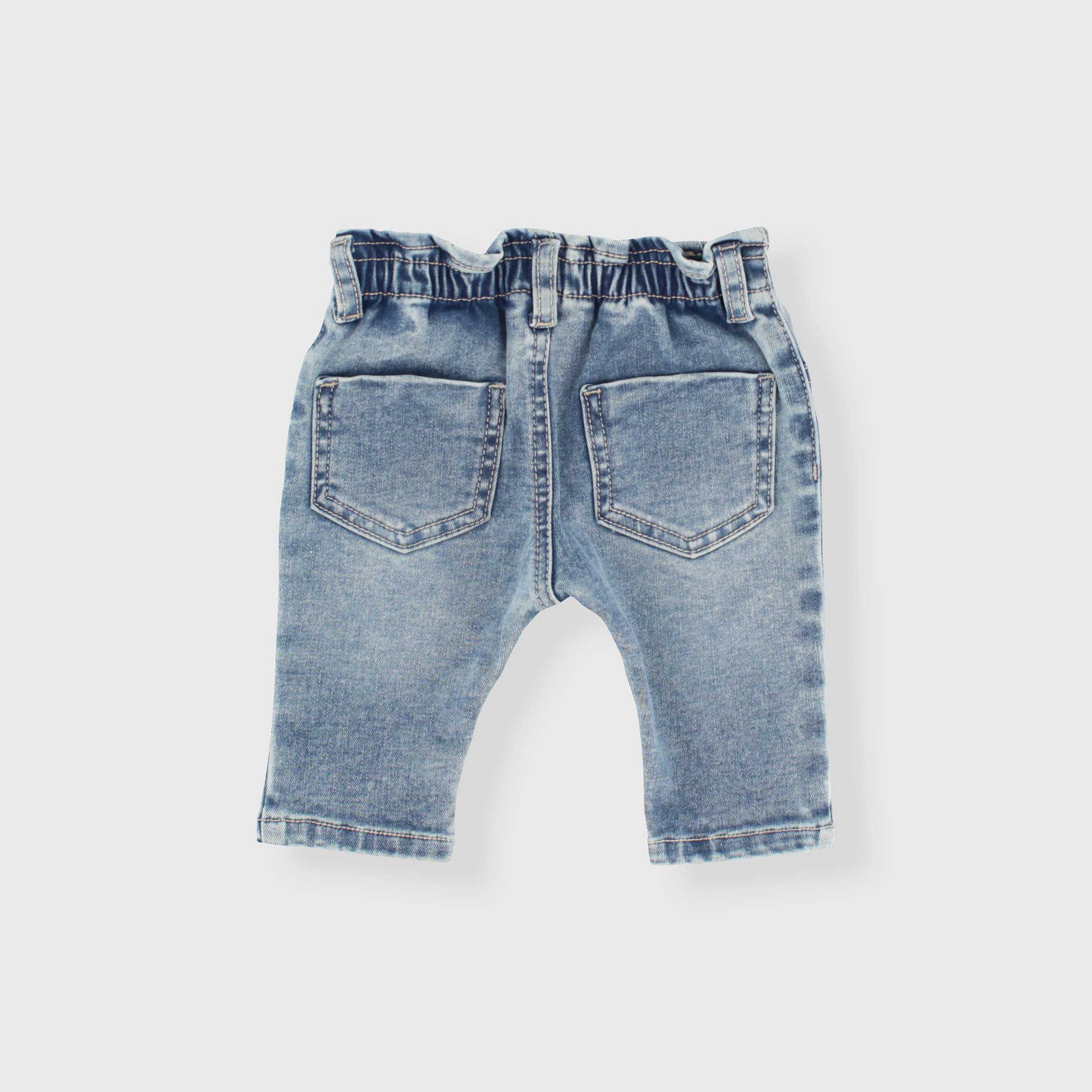 Jeanshose mit elastischem Bund und Knopf vorne. Fake-Taschen vorne und aufgesetzte Taschen hinten. Saum mit Umschlag.