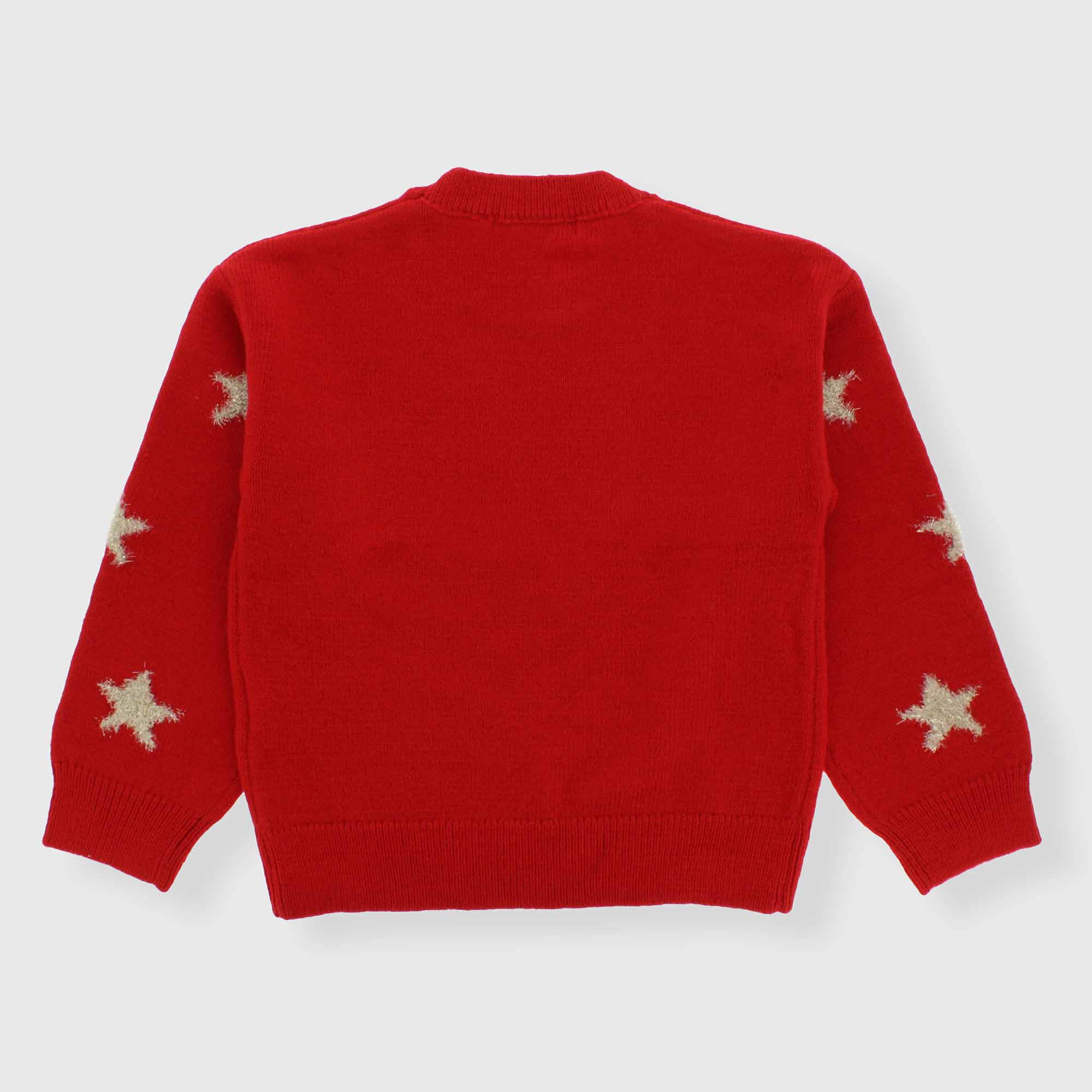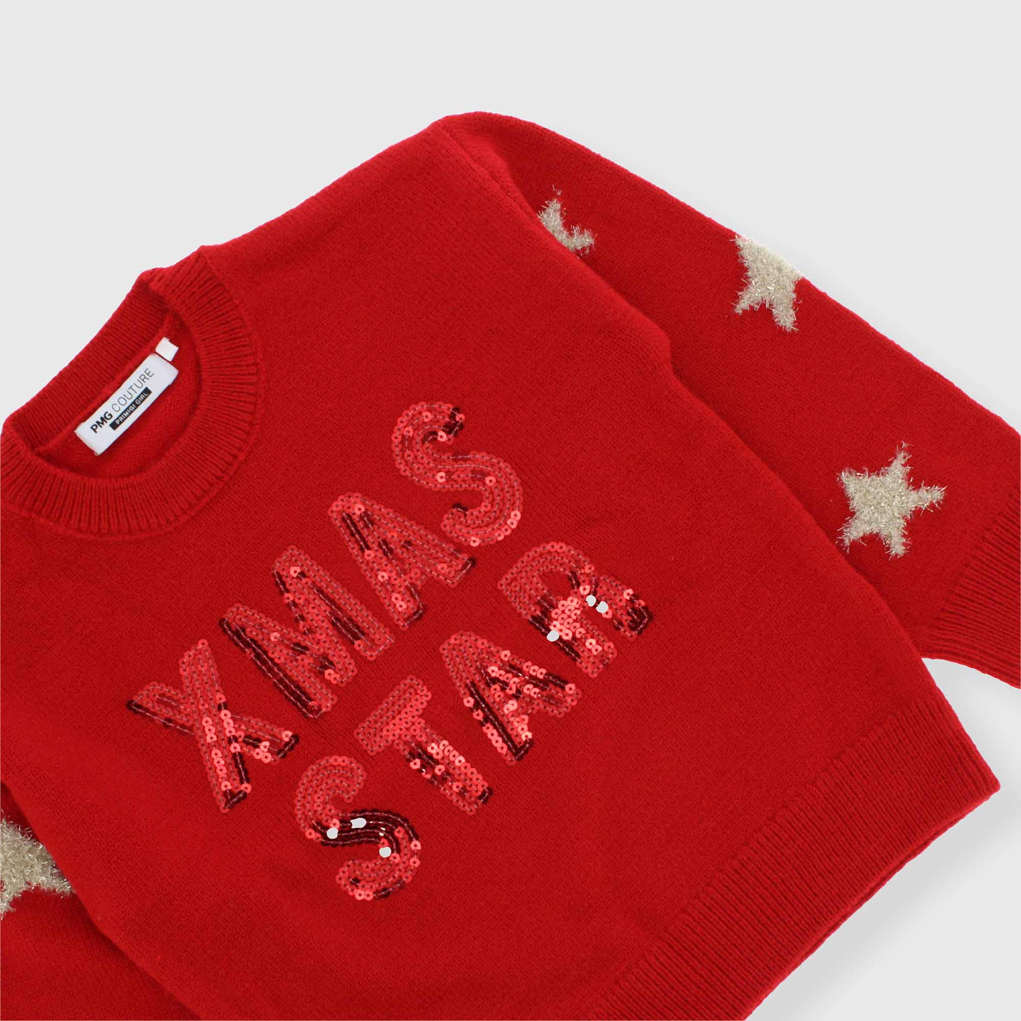 Weicher Strickpullover, Rundhalsausschnitt, lange Ärmel. Weihnachtsmotiv mit Paillettendetails auf der Vorderseite. Jacquard-Sterne an den Ärmeln.