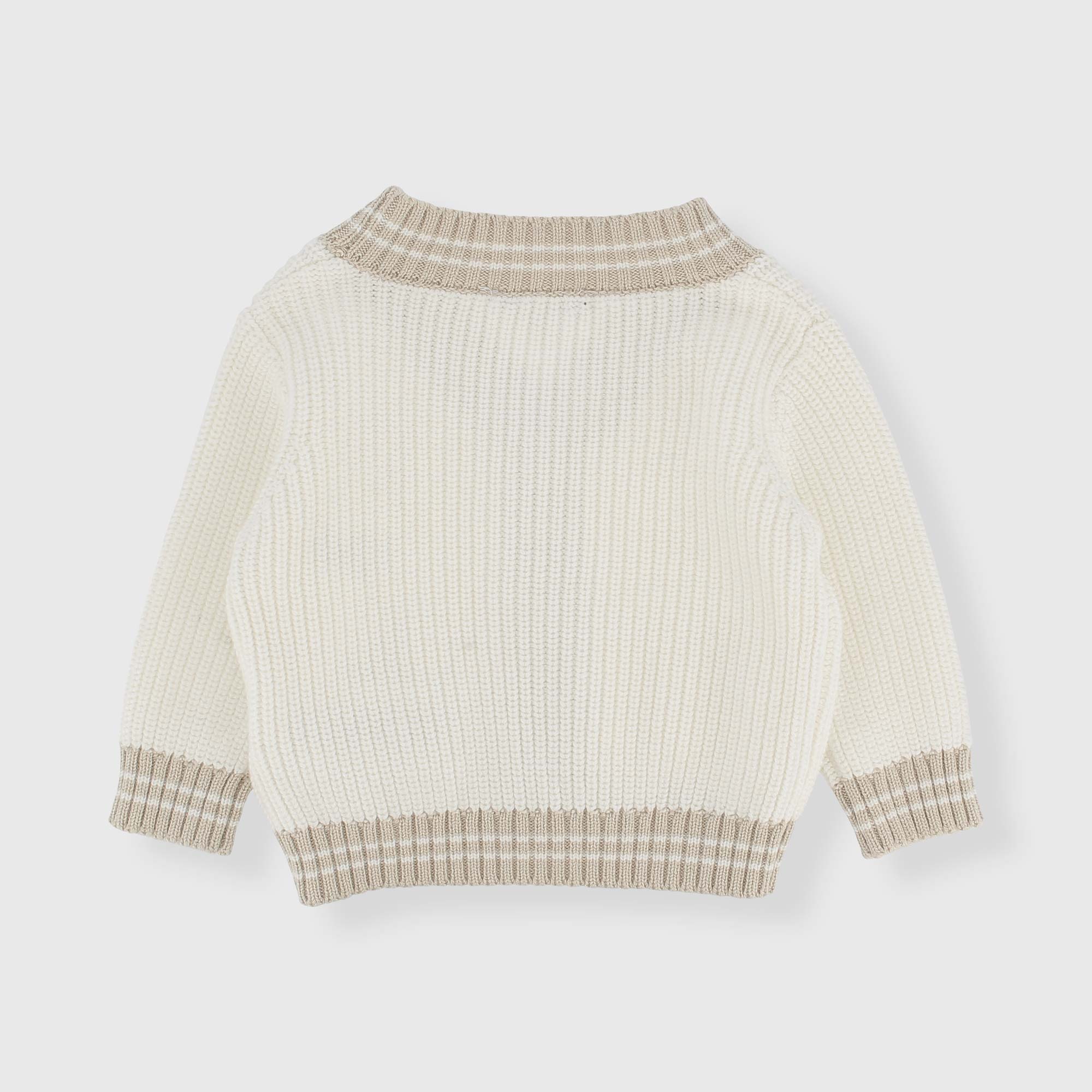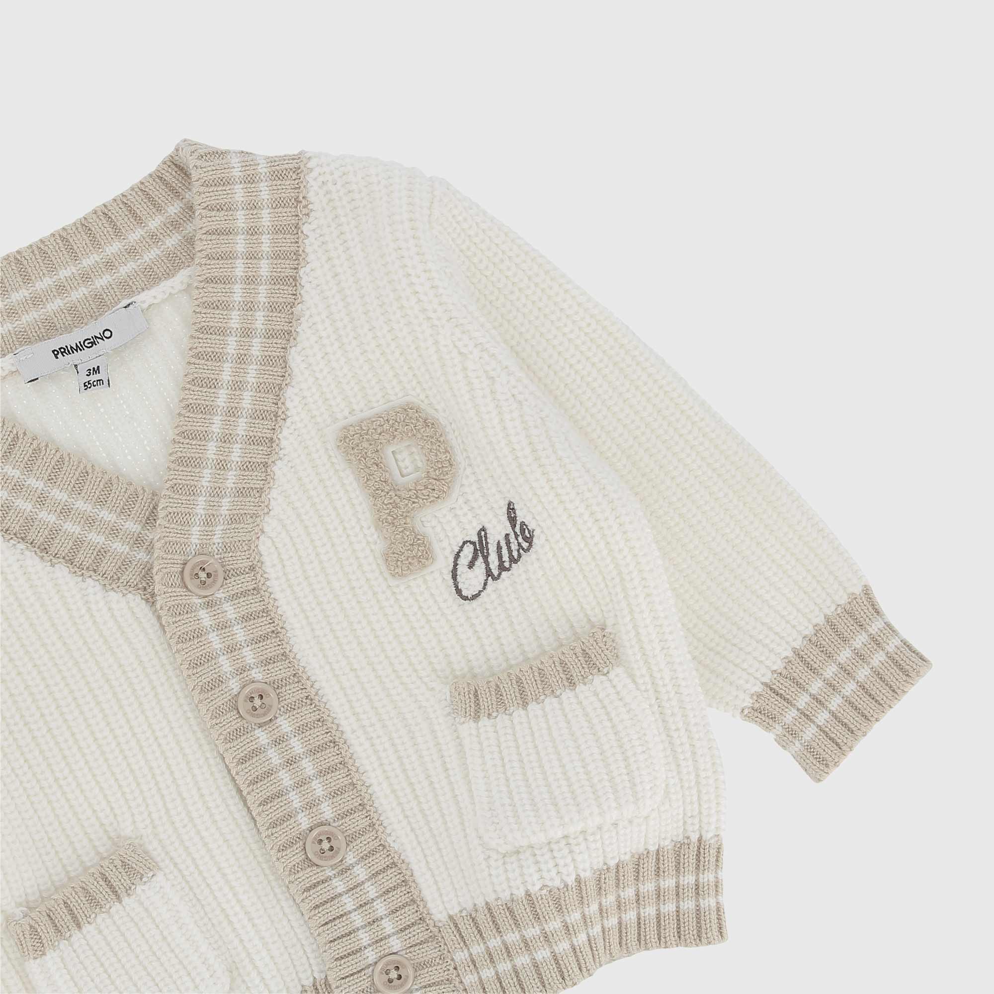 Weicher Rippstrick-Cardigan, V-Ausschnitt, lange Ärmel. Knopfverschluss vorne. Aufgesetzte Vordertaschen und Schwammstich-Stickerei auf der Brust.