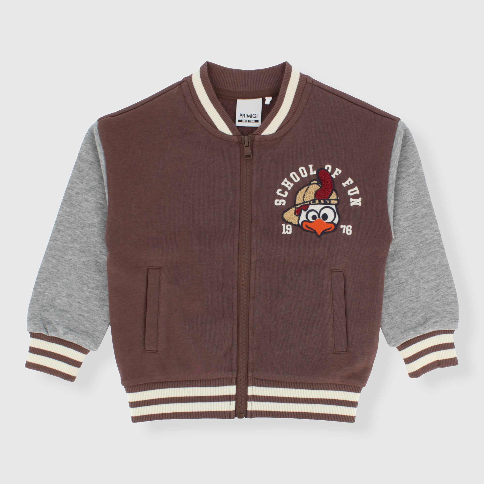 Offenes Sweatshirt im College-Stil mit langen Ärmeln. Gestreifte Rippenprofile. Reißverschluss vorne, Patch mit Schwammeffekt und Stickerei auf der Vorderseite. Leistentaschen.