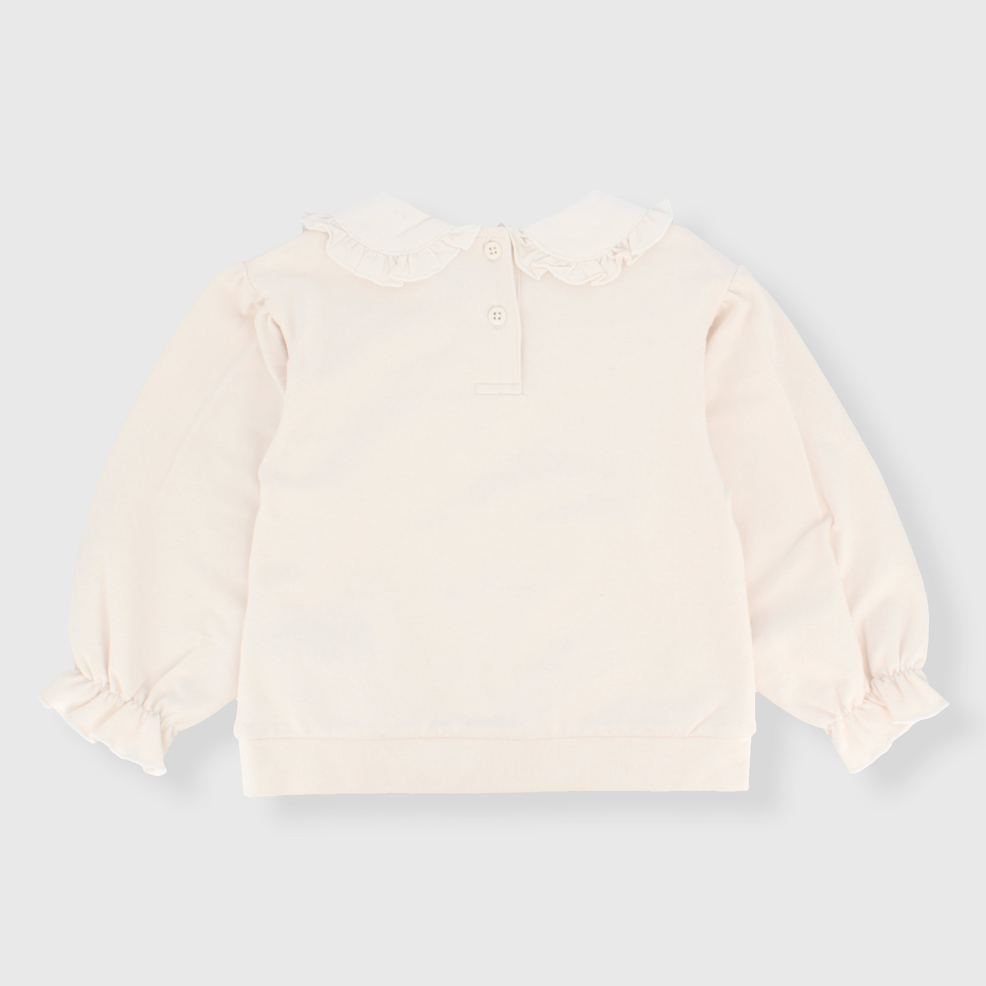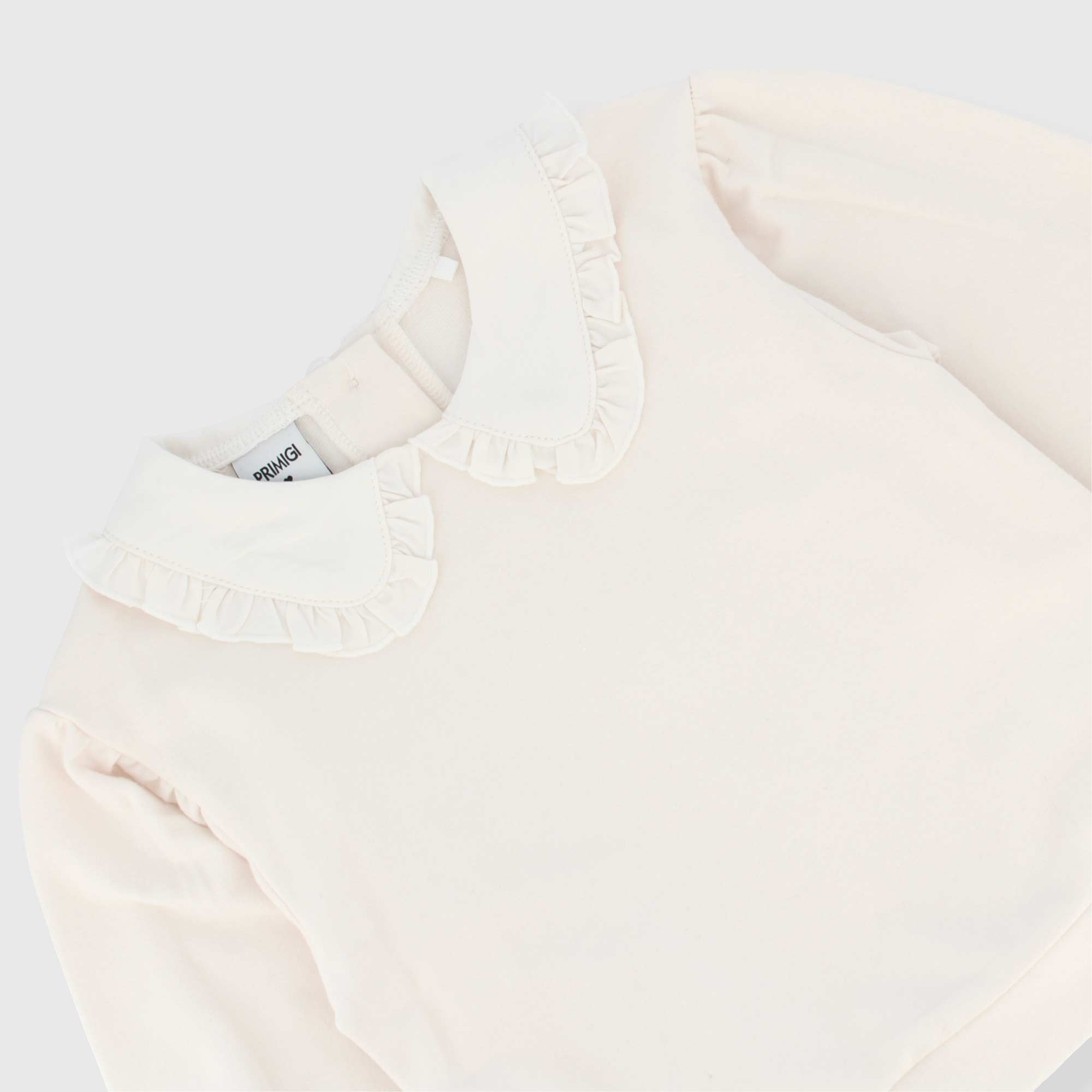 Sweatshirt mit breitem Kragen, langen Ärmeln. Knopfverschluss auf der Rückseite. Geraffte Bündchen mit Gummizug.
