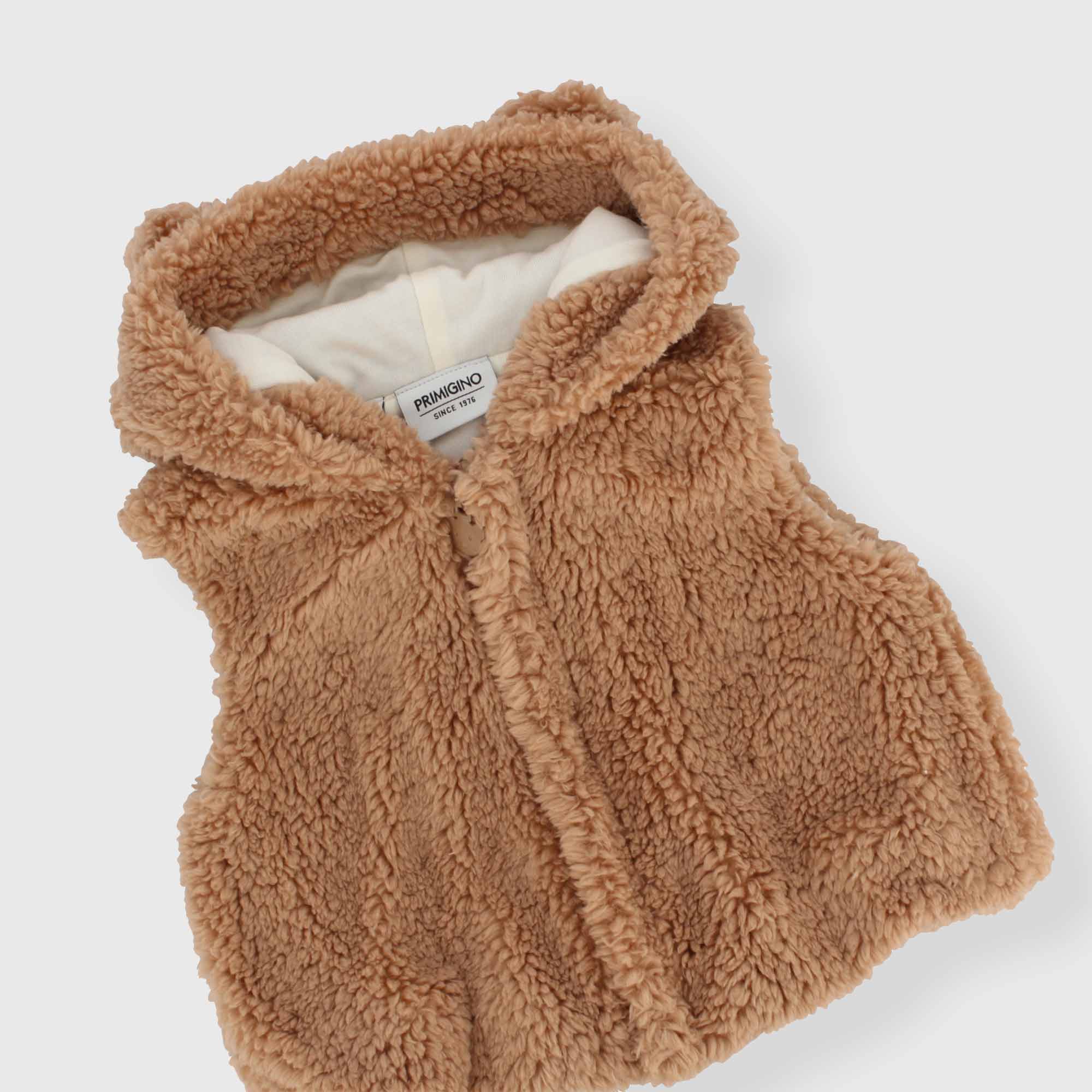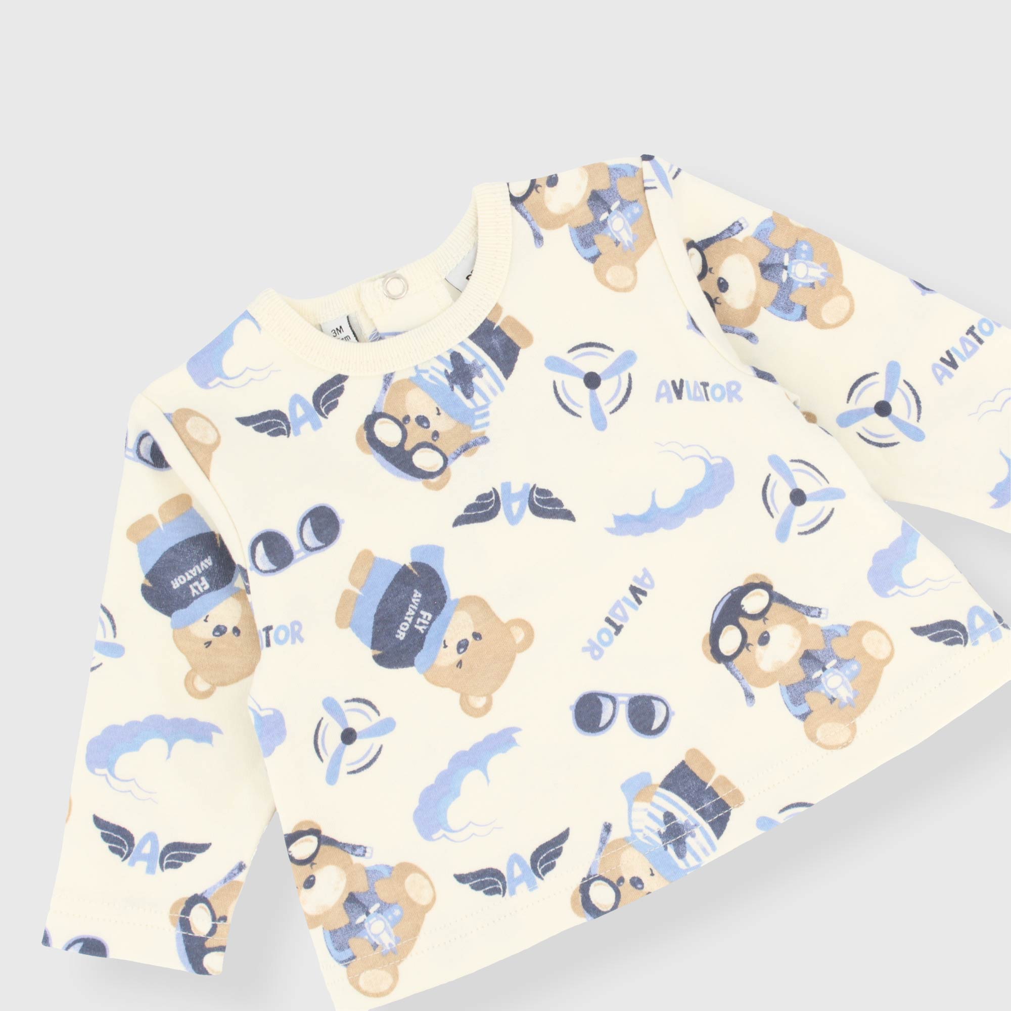 Dreiteiliges Set. Weste mit Kapuze und Ohren aus Fleece. Reißverschluss vorne und Jerseyfutter. Jersey-T-Shirt mit Rundhalsausschnitt und langen Ärmeln. Druckknopfverschluss an der Schulter. Allover-Druck mit Fliegermotiv. Fleece-Hose mit elastischem Bund. Große aufgesetzte Seitentaschen mit aufgesetztem Patch.