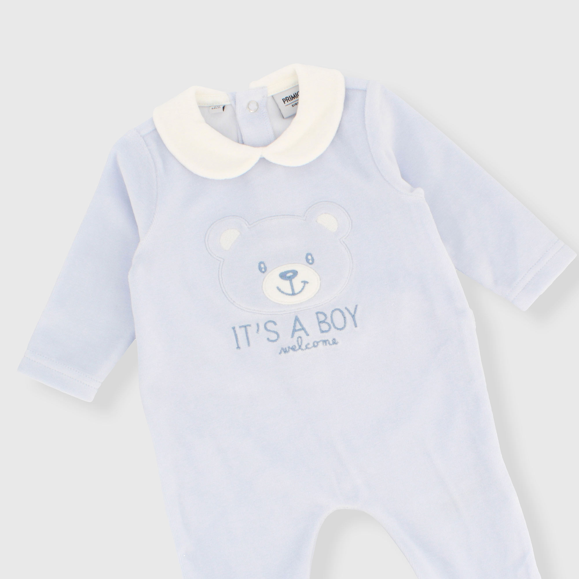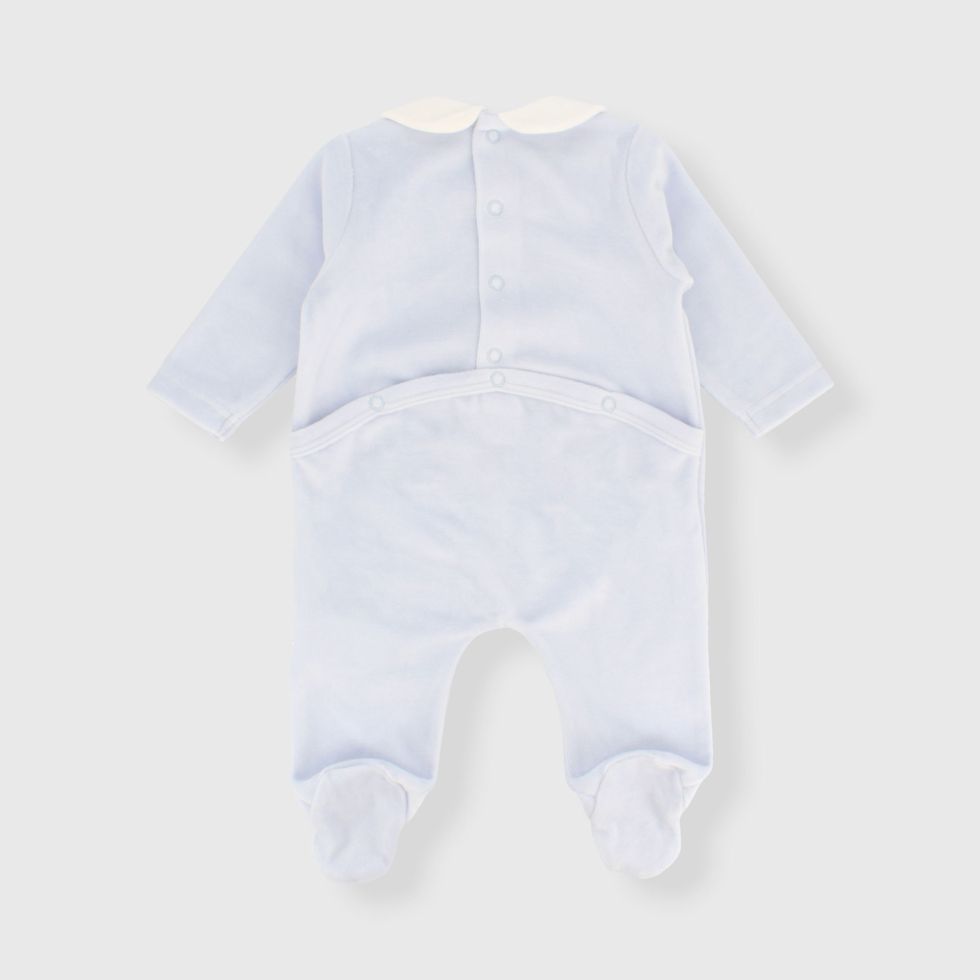 Chenille-Strampler mit Bubikragen und langen Ärmeln. Verschluss mit automatischen Knöpfen auf der Rückseite. Auf der Vorderseite ist ein Teddybär aufgestickt.