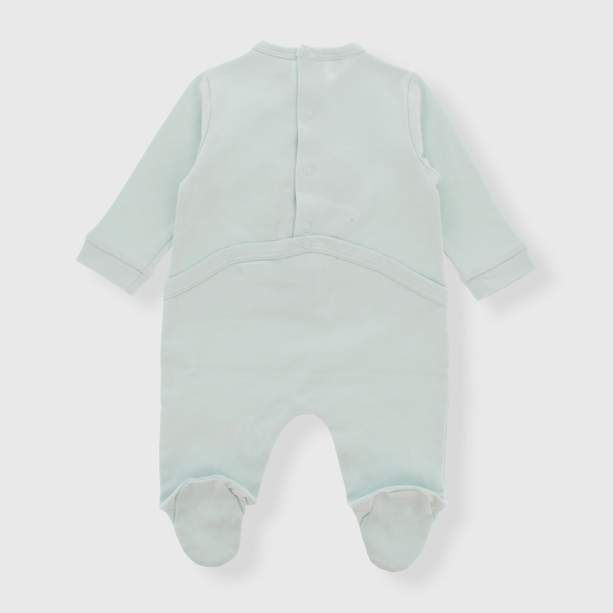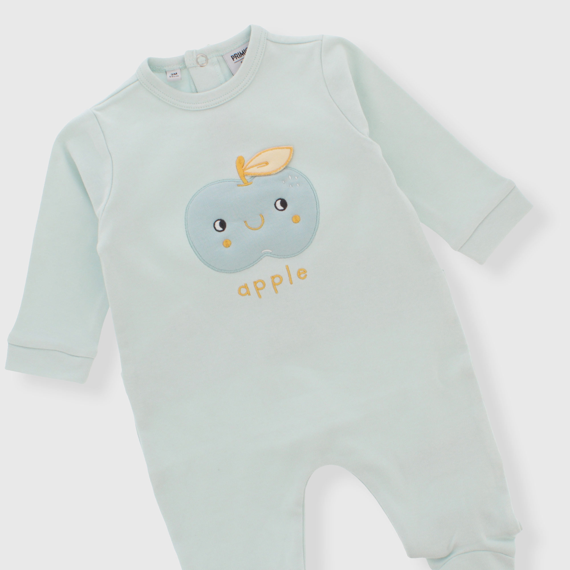 Interlock-Playsuit, Rundhalsausschnitt, lange Ärmel. Verschluss mit automatischen Knöpfen auf der Rückseite. Applikation und Apfeldruck auf der Vorderseite.
