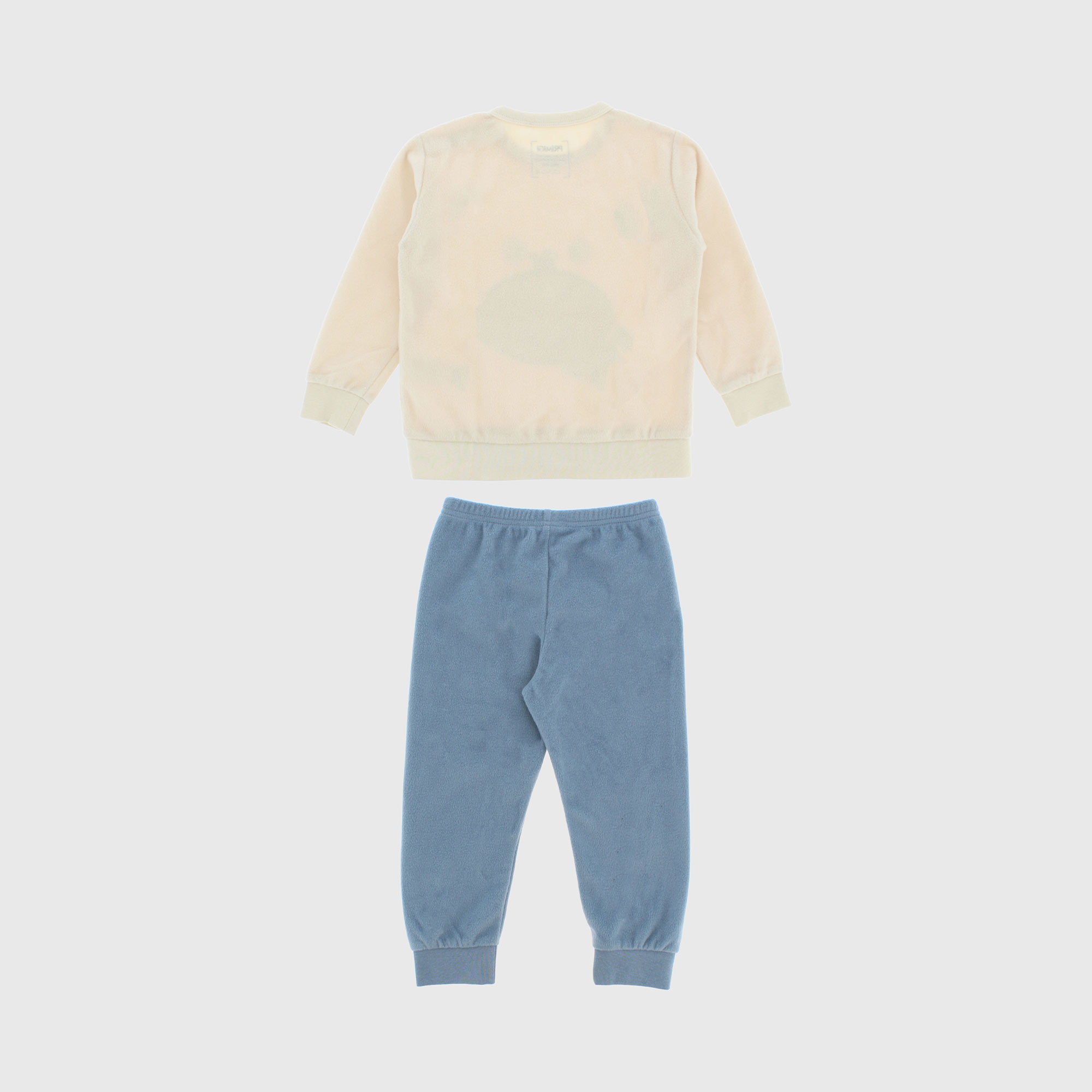 Fleece-Pyjama-Set. Pullover mit Rundhalsausschnitt und langen Ärmeln. Druckknopfverschluss an der Schulter. Druck mit Applikation auf der Vorderseite. Hose mit elastischem Bund. Gerippter Boden.