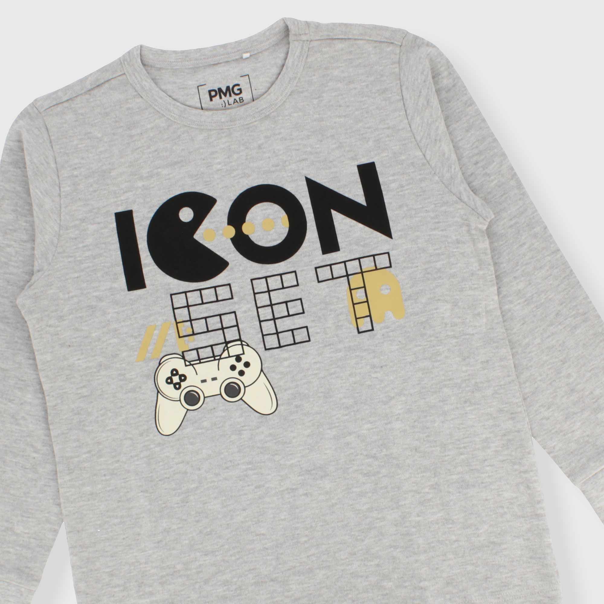 Warmes Pyjama-Set aus Baumwolle. Langärmliger Pullover mit Rundhalsausschnitt. Druck auf der Vorderseite. Hose mit elastischem Bund und geripptem Saum.