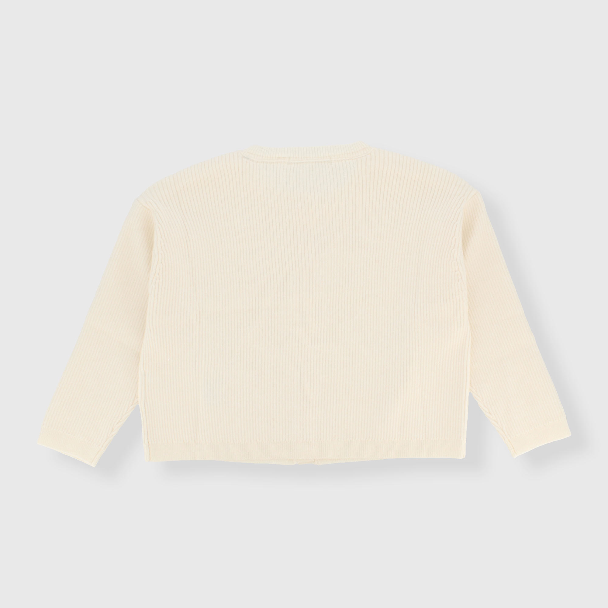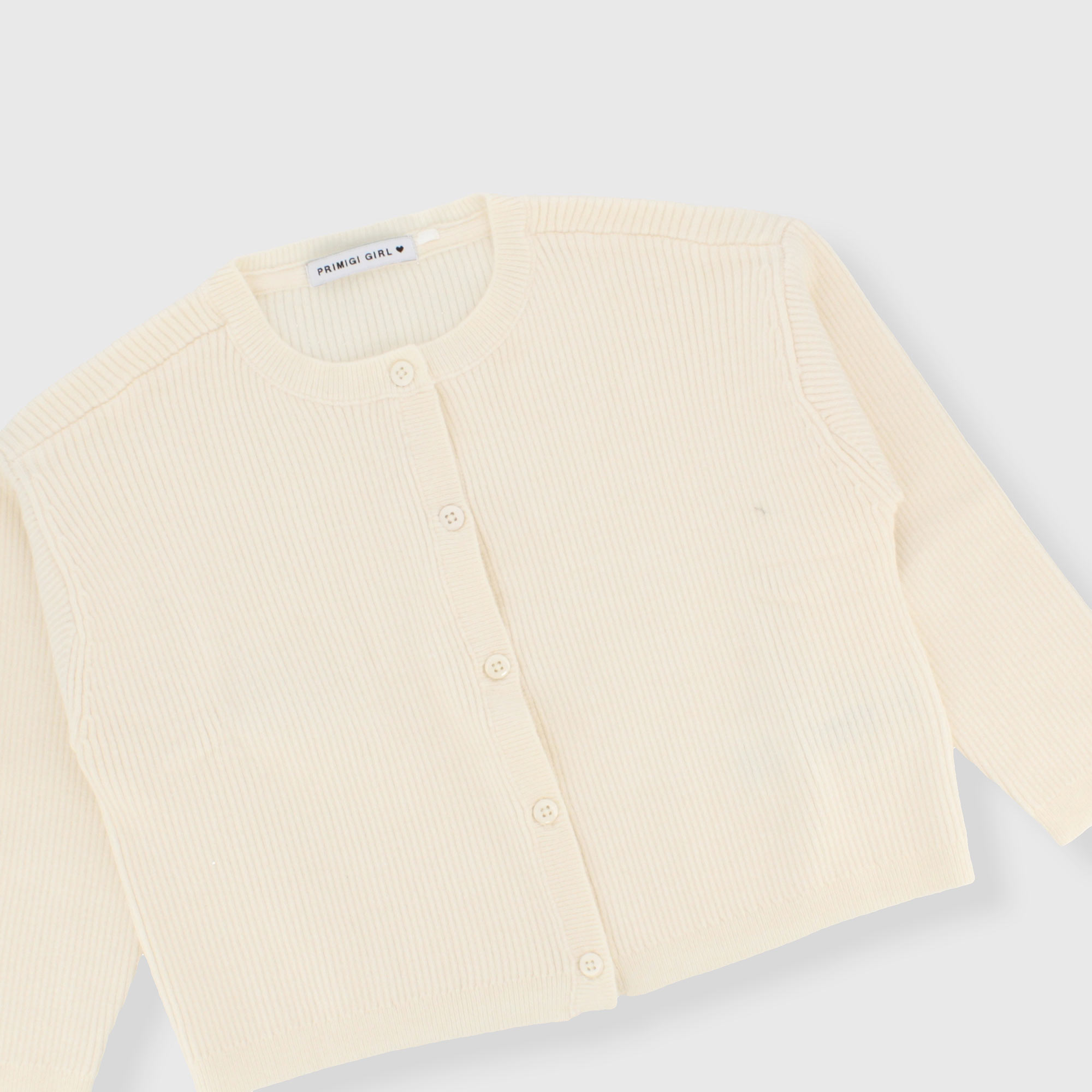Weicher Rippstrick-Cardigan, Rundhalsausschnitt, lange Ärmel. Knopfverschluss vorne.