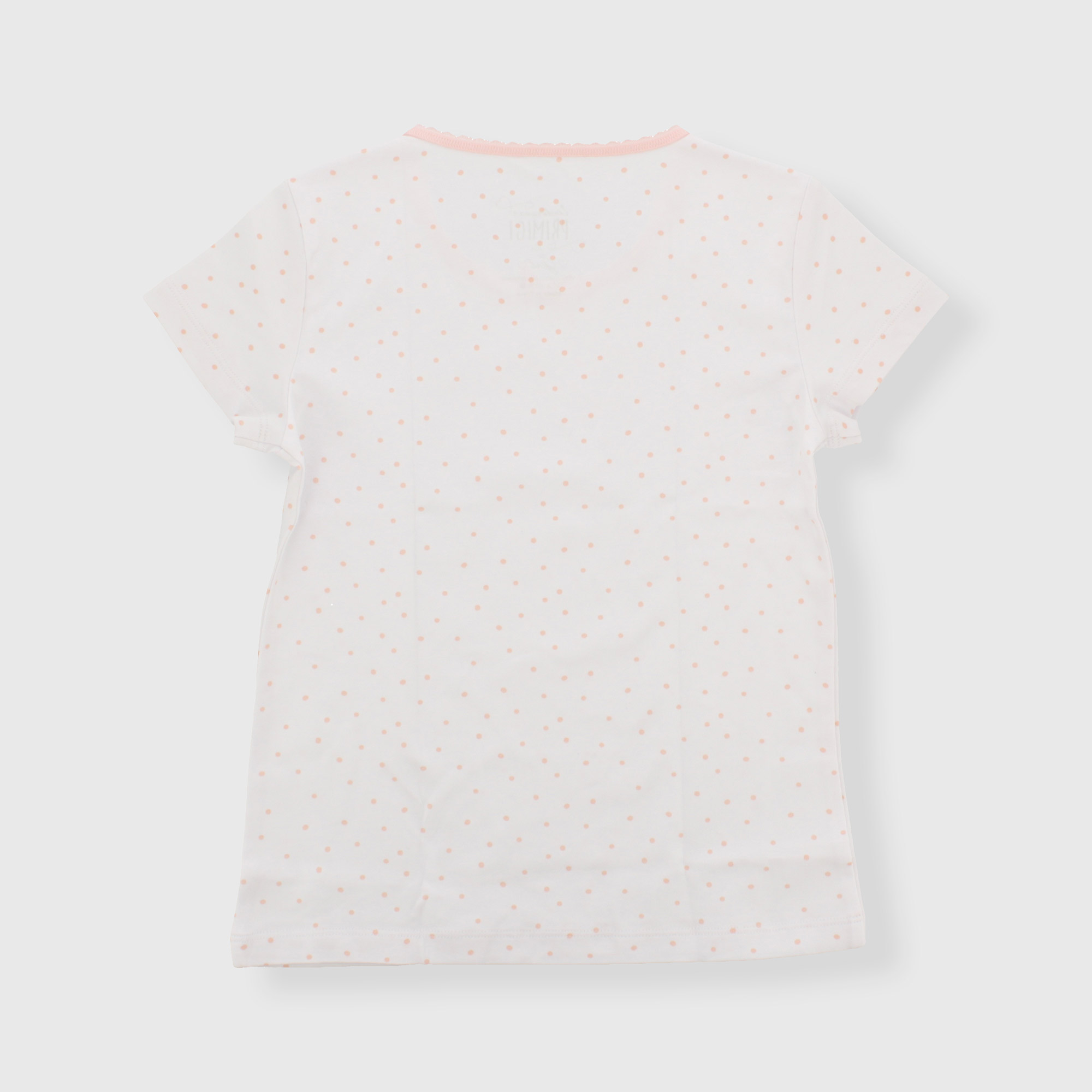 T-Shirt aus Stretch-Baumwolle mit Rundhalsausschnitt und Spitzenabschluss. Kurze Ärmel. Auf der Vorderseite angebrachte Schleife. Allover-Punktmuster.