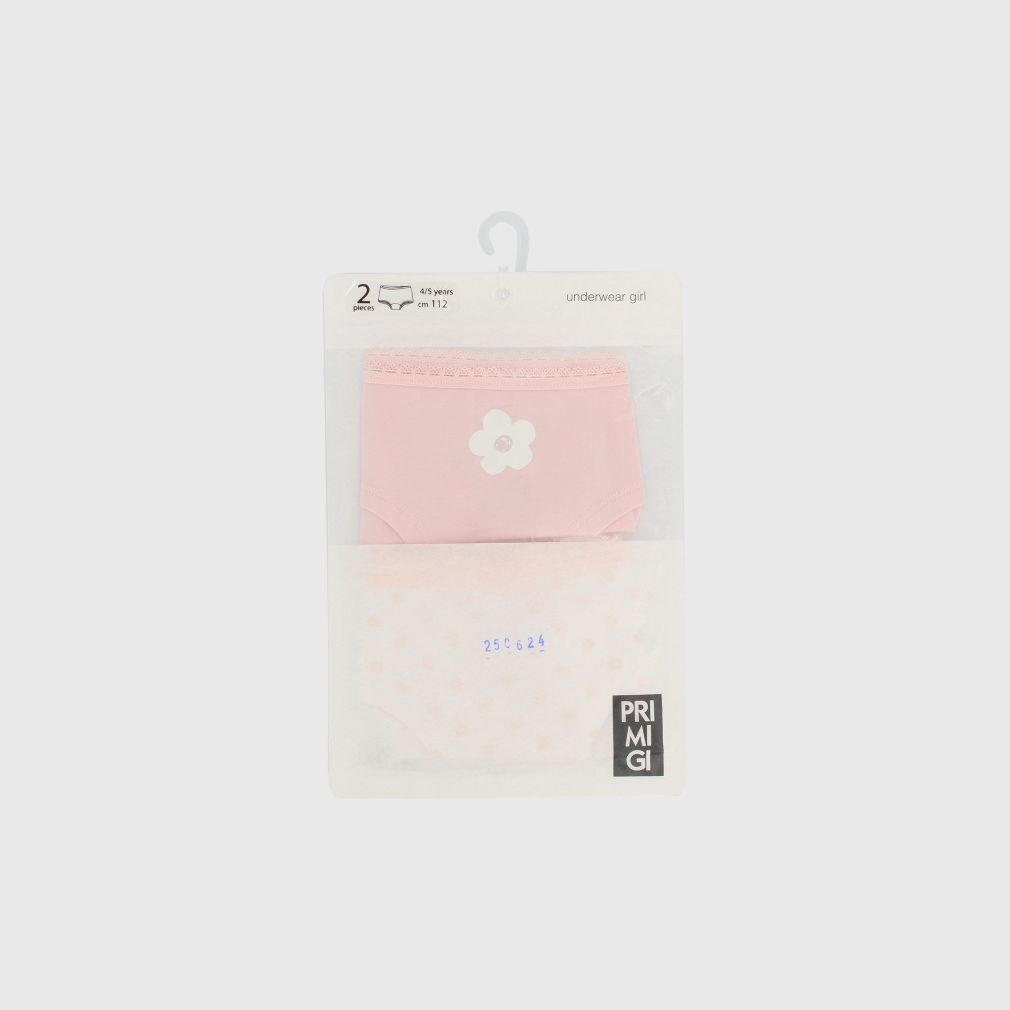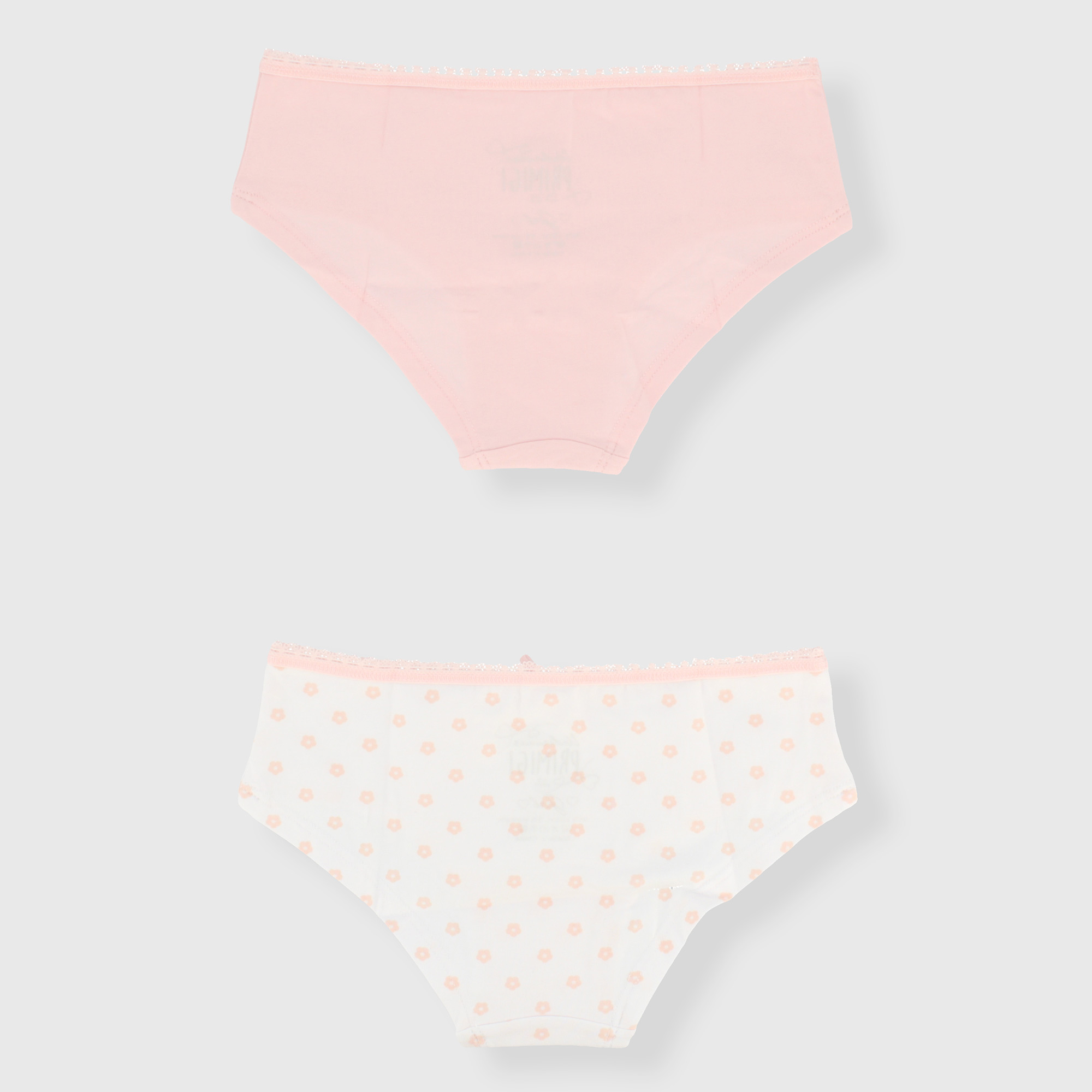 Paket bestehend aus zwei Paar Culottes aus elastischer Baumwolle: ein Paar mit zentralem Aufdruck, ein Paar mit Blumen. Auf der Vorderseite angebrachte Schleife. Elastischer Bund.
