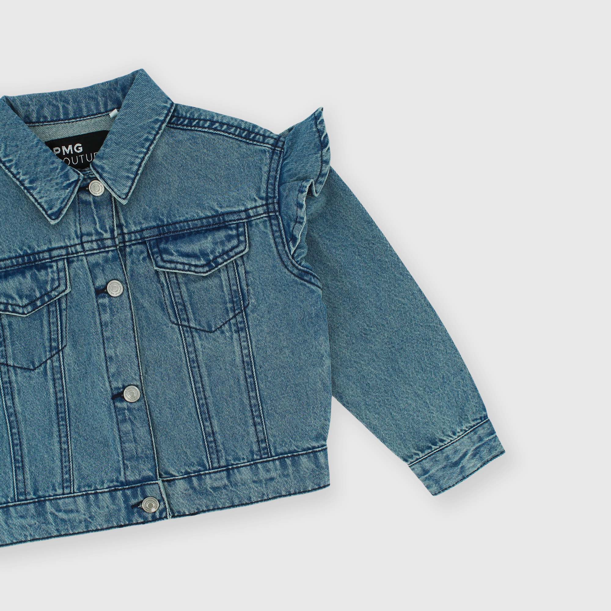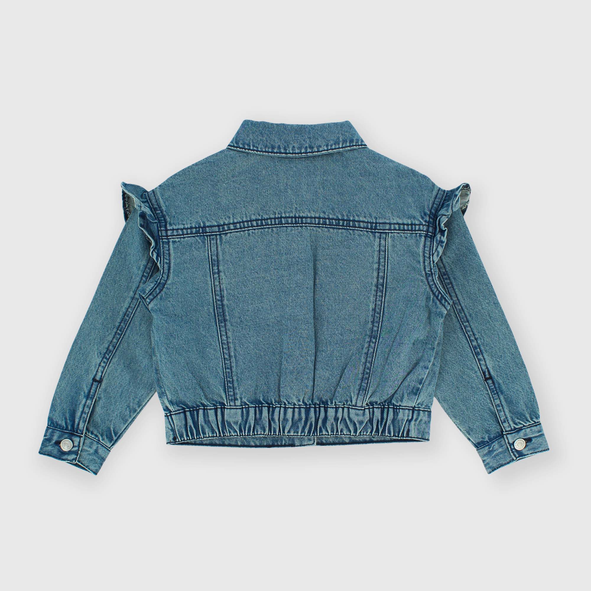 Bunte Jeansjacke mit Kragen, langen Ärmeln. Knopfverschluss vorne. Aufgesetzte Taschen mit Patte auf der Vorderseite. Rüschen an den Schultern. Elastischer Saum auf der Rückseite.
