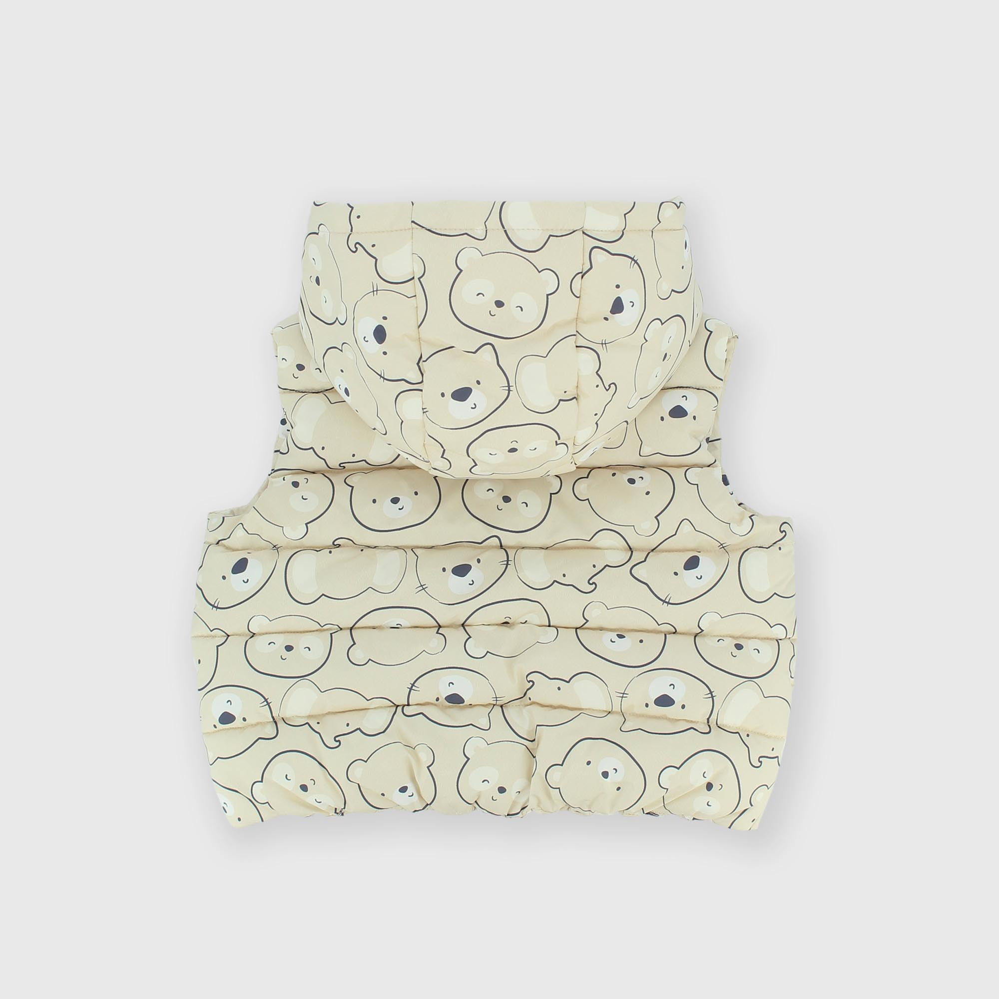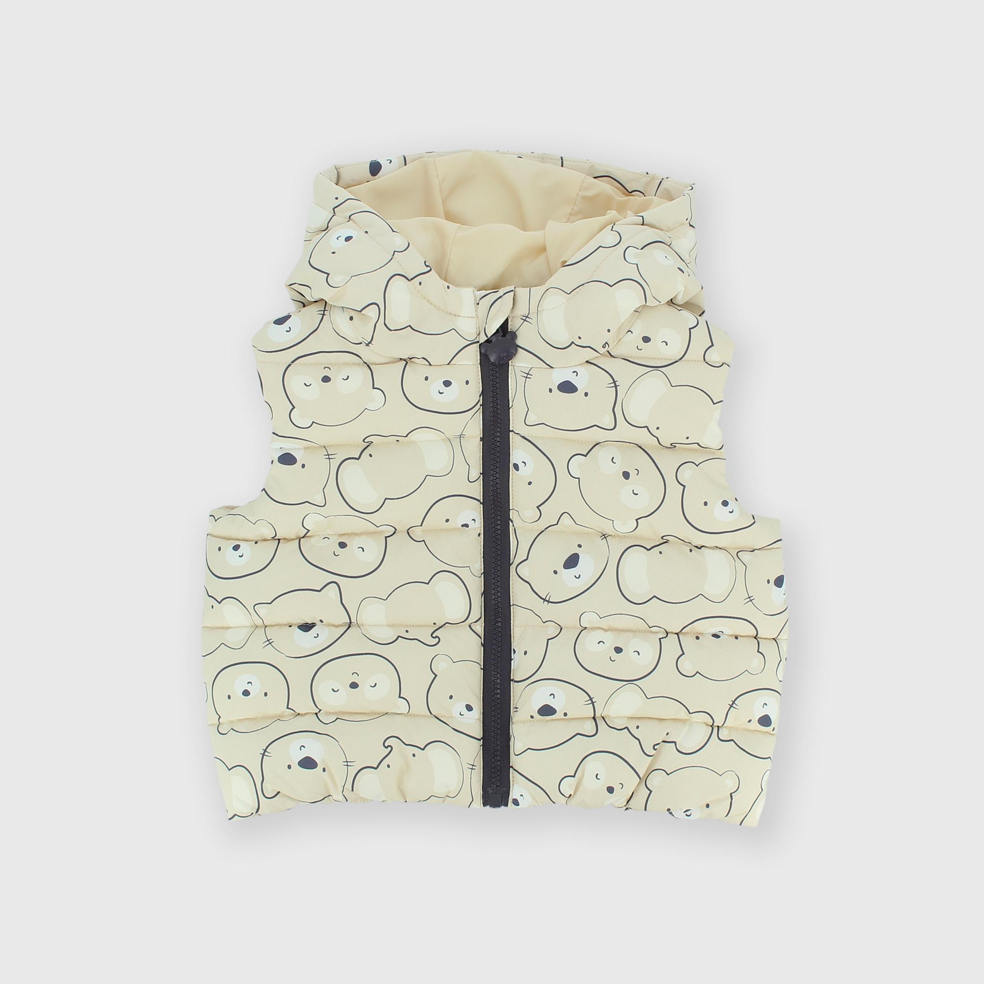 Weste aus bedrucktem Nylon, mit Kapuze. Reißverschluss vorne.