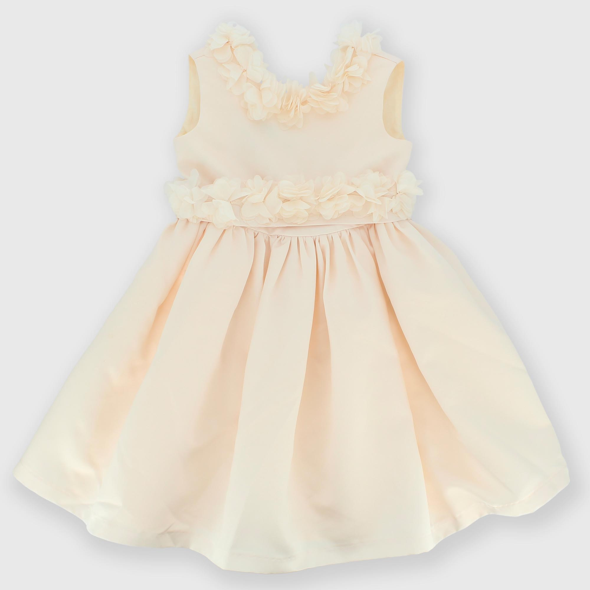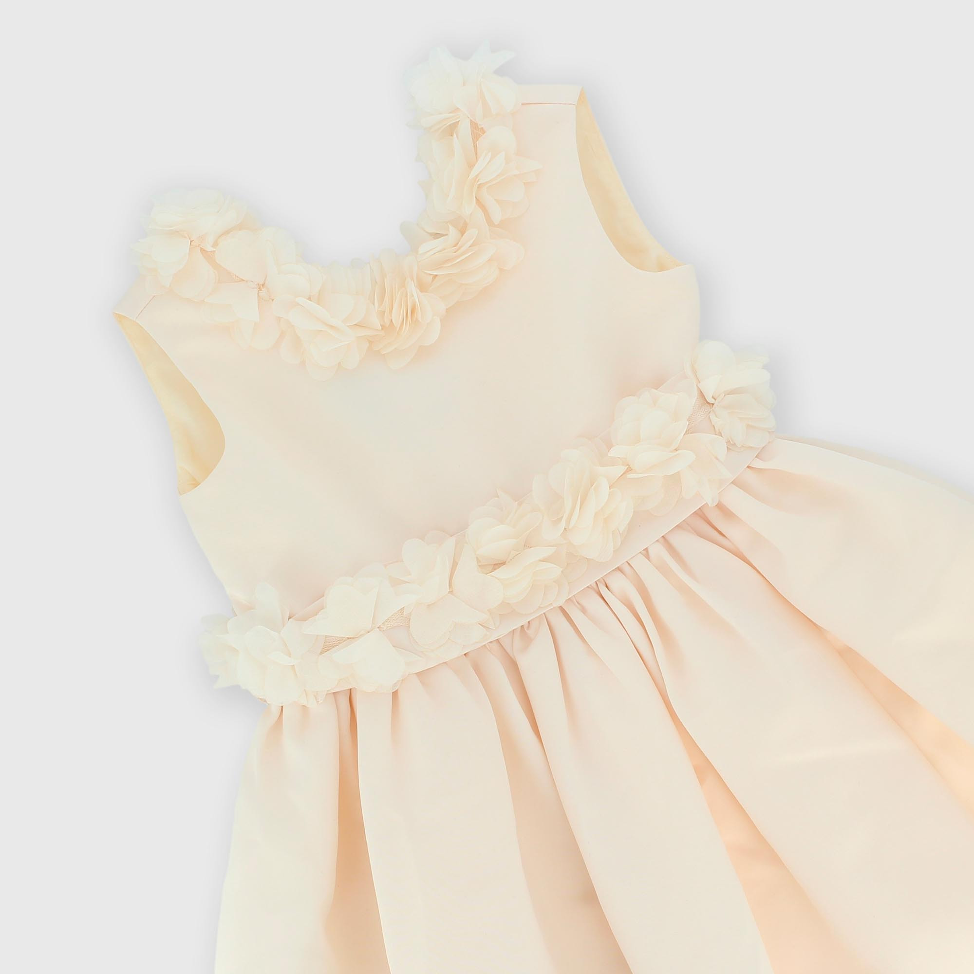 Ärmelloses Satinkleid mit Rundhalsausschnitt. Rückenverschluss mit unsichtbarem Reißverschluss. Passender abnehmbarer Gürtel. Organza-Blütenapplikationen am vorderen Ausschnitt und am V-Ausschnitt am Rücken sowie am Gürtel. Breiter Rock. Auskleidung.