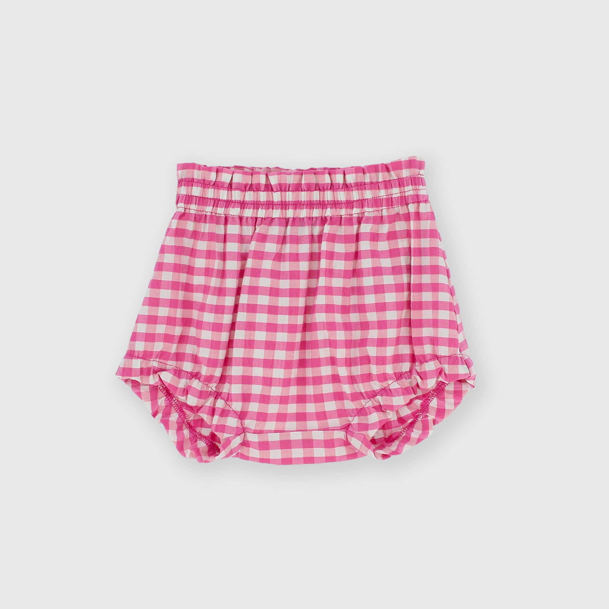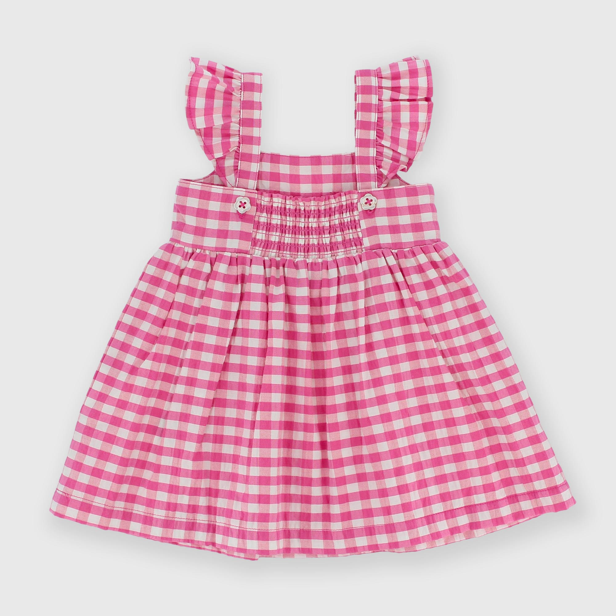 Kariertes Kleid mit quadratischem Ausschnitt. Träger mit Rüschen und Schnürung mit Rückenknöpfen. Elastische Nähte auf der Rückseite. Passendes Höschen mit elastischem Bund.