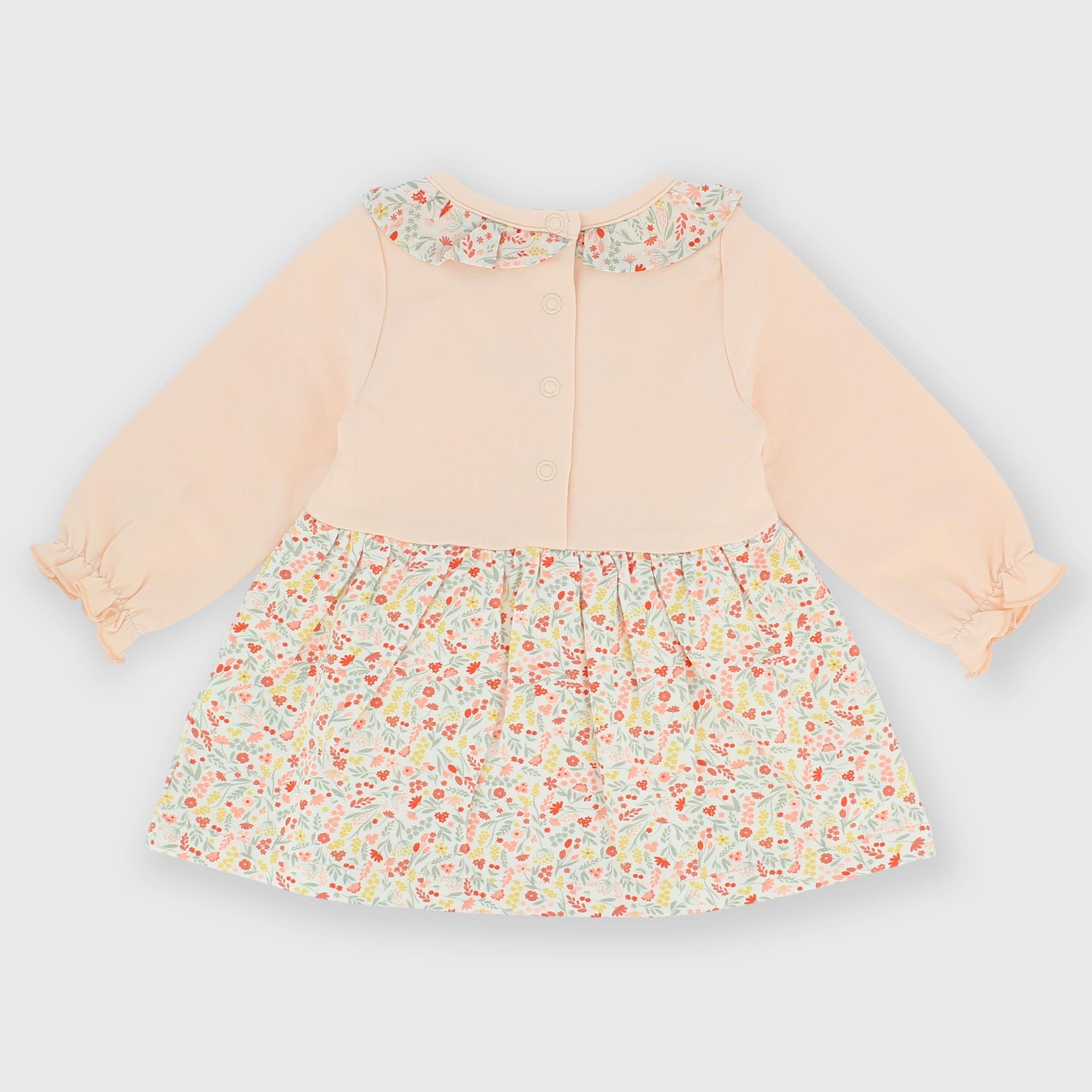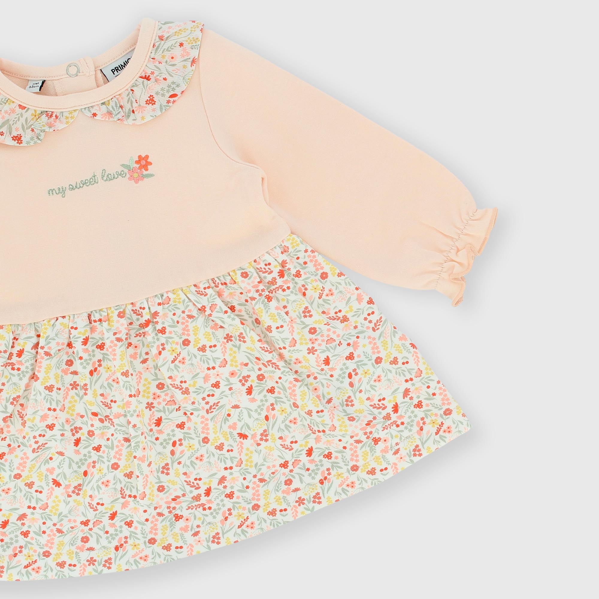 Fleecekleid mit Blumenkragen, lange Ärmel. Rückenverschluss mit Druckknöpfen. Stickerei auf der Vorderseite und Rock mit Allover-Blumenprint. Elastische Bündchen.