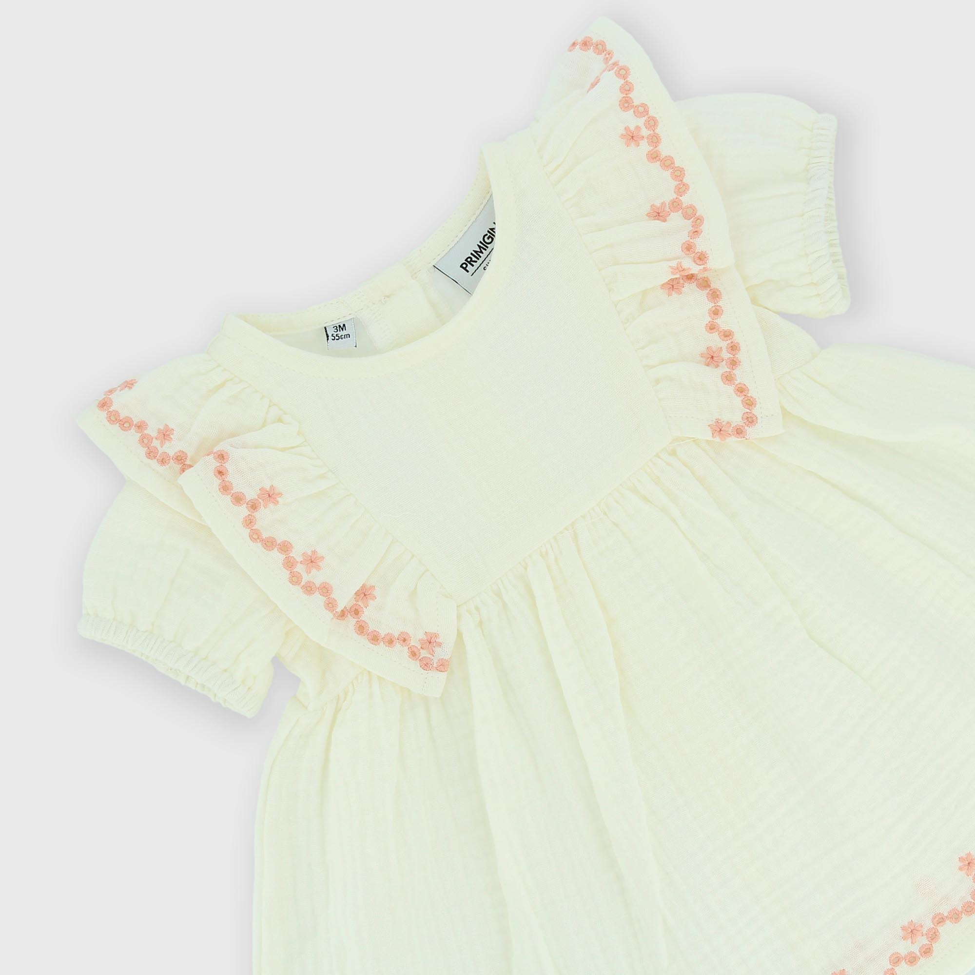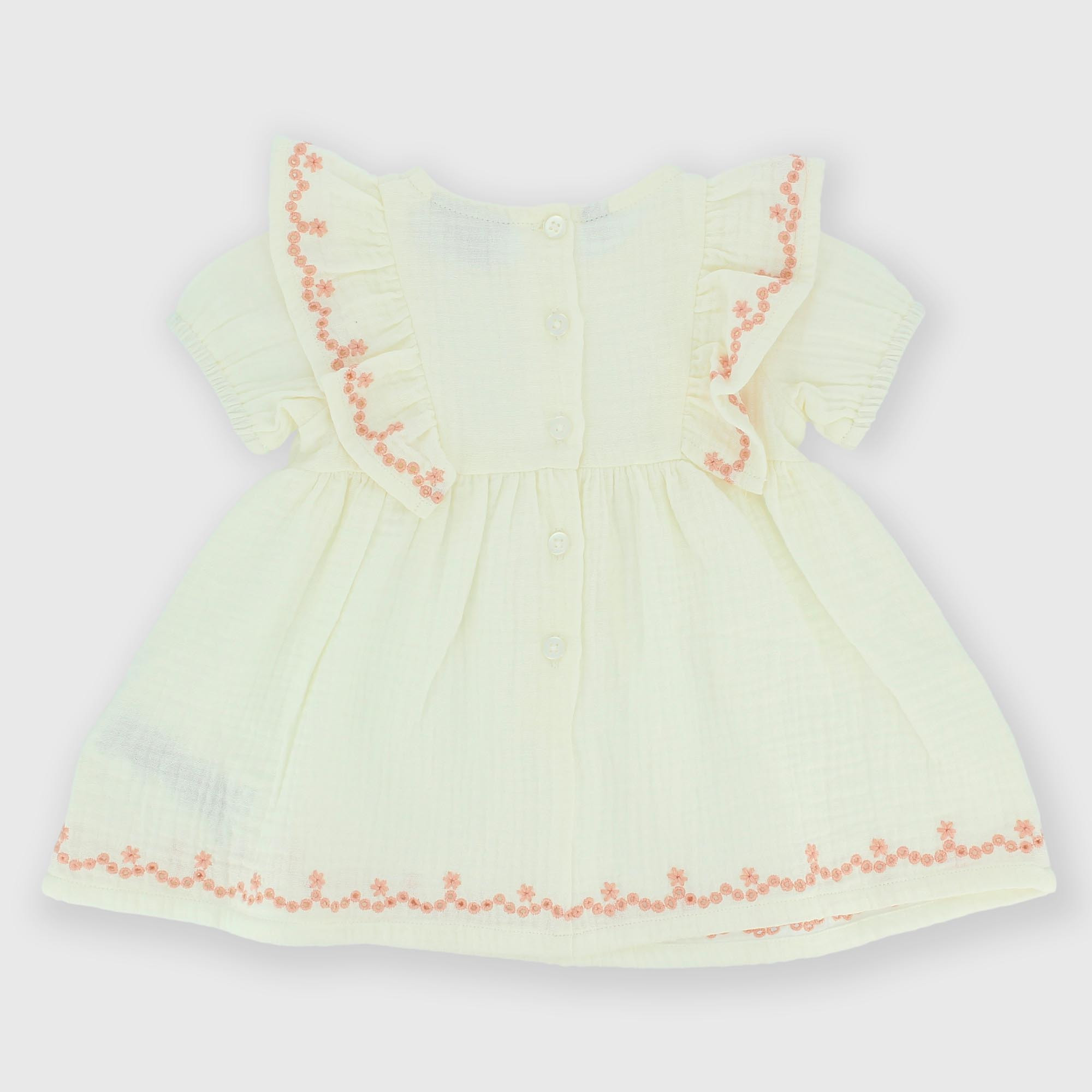 Kleid aus Baumwollgaze, Rundhalsausschnitt, kurze Ärmel. Knopfverschluss auf der Rückseite. Rüschen an den Schultern. Kontrastierende Stickerei.