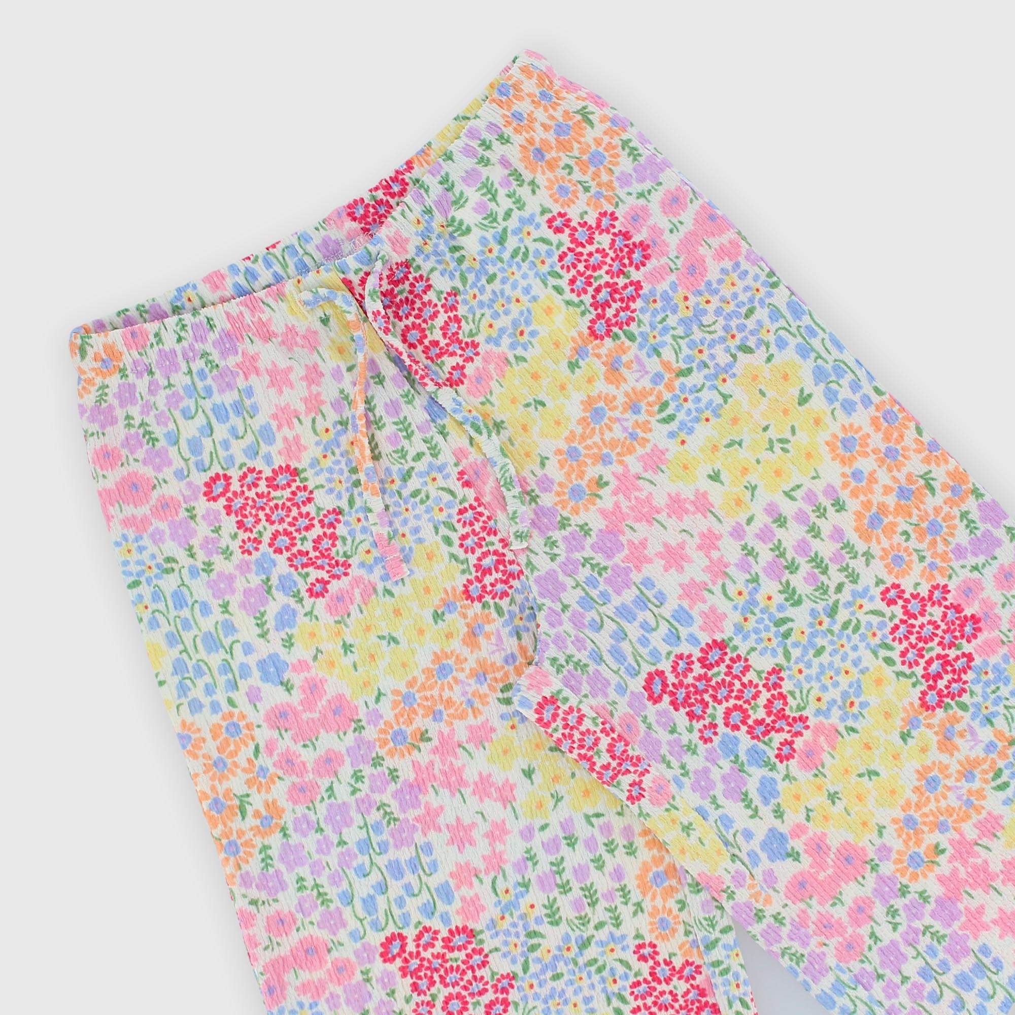 Seersucker-Hose mit weitem Bein mit elastischem Bund und Schnürsenkeln vorne. Allover-Print mit mehrfarbigen Blumen.