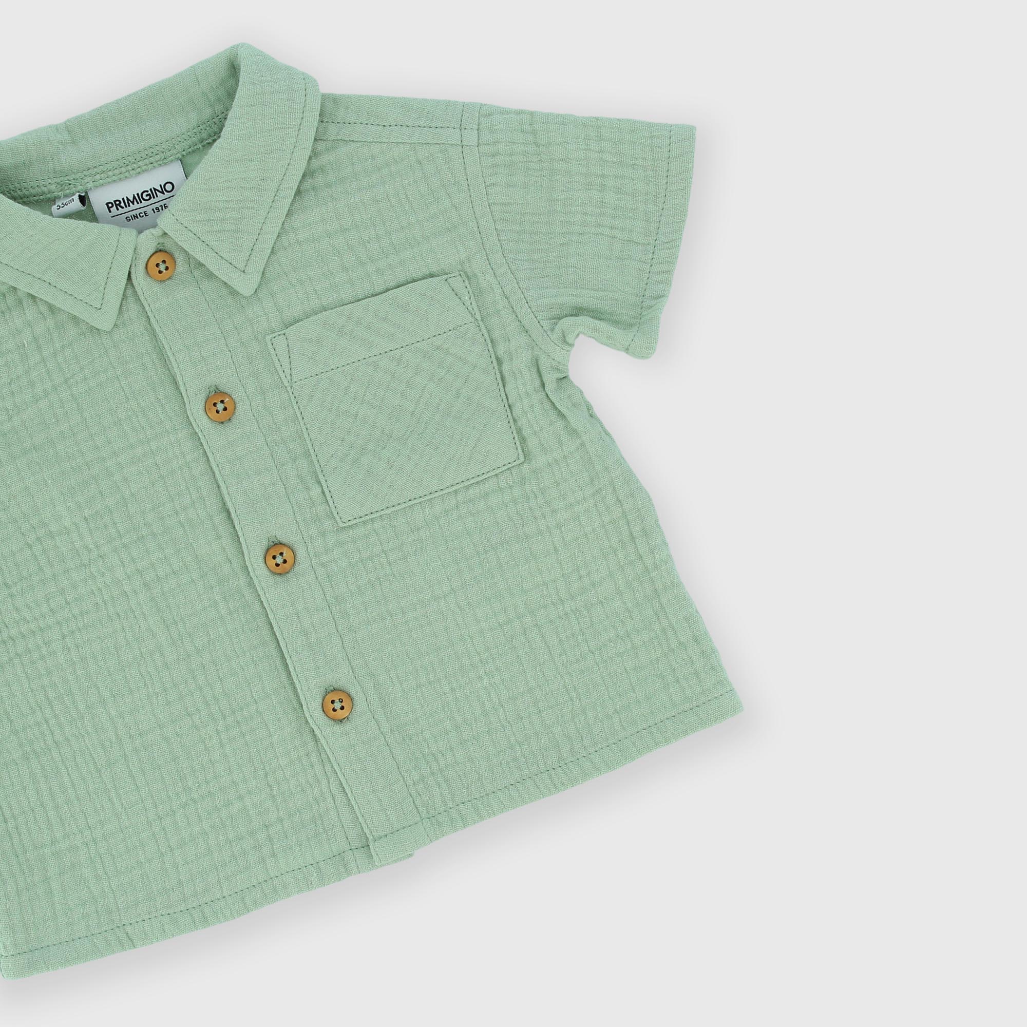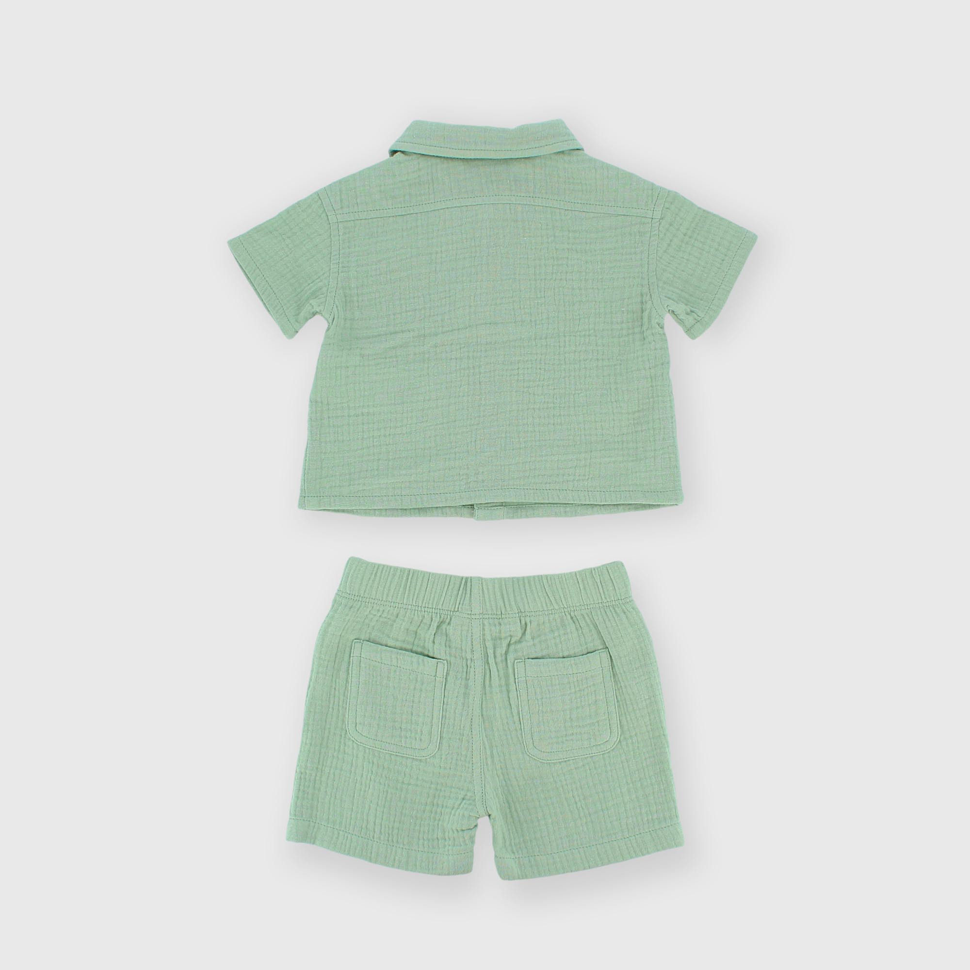 Zweiteiliger Anzug aus Baumwollgaze. Kurzärmelige Bluse. Knopfverschluss und Tasche auf der Vorderseite. Shorts mit elastischem Bund und Schnürsenkeln vorne. Aufgesetzte Taschen auf der Rückseite.