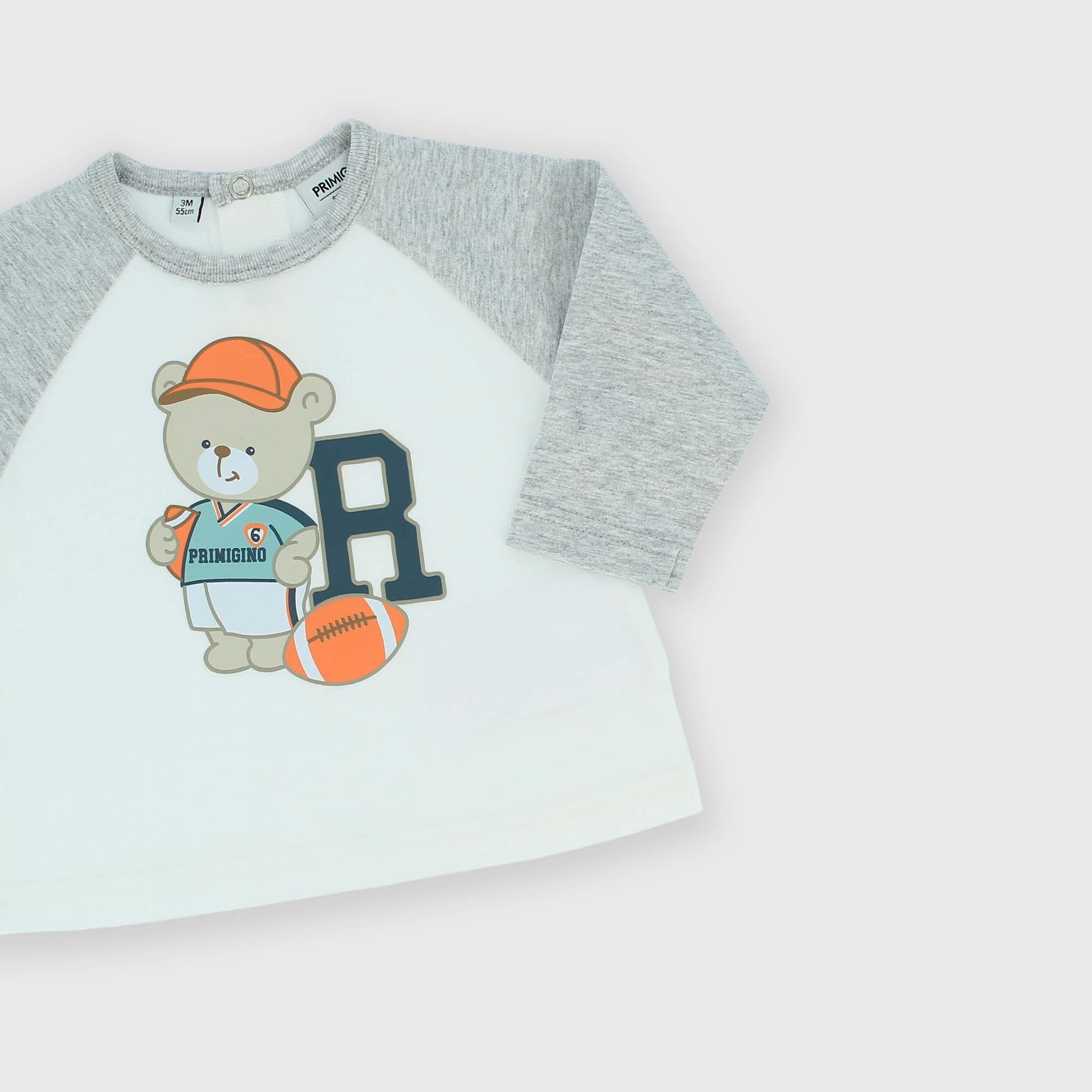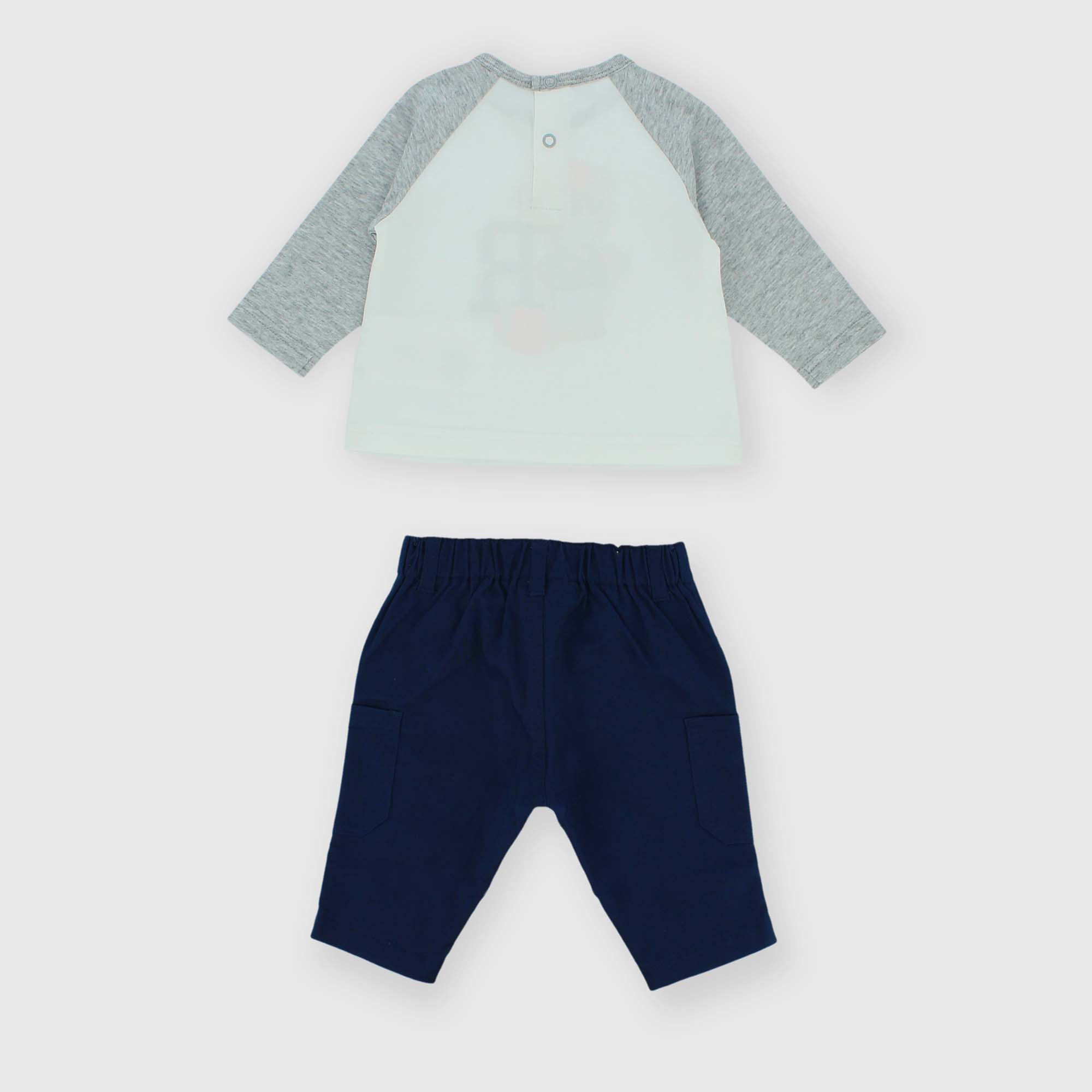 Zweiteiliger Anzug. T-Shirt aus Jersey mit Rundhalsausschnitt und langen Ärmeln. Rückenverschluss mit Druckknöpfen. 3D-Effekt-Drucke auf der Vorderseite. Hose mit elastischem Bund und Gürtelschlaufen. Aufgesetzte Seitentaschen.