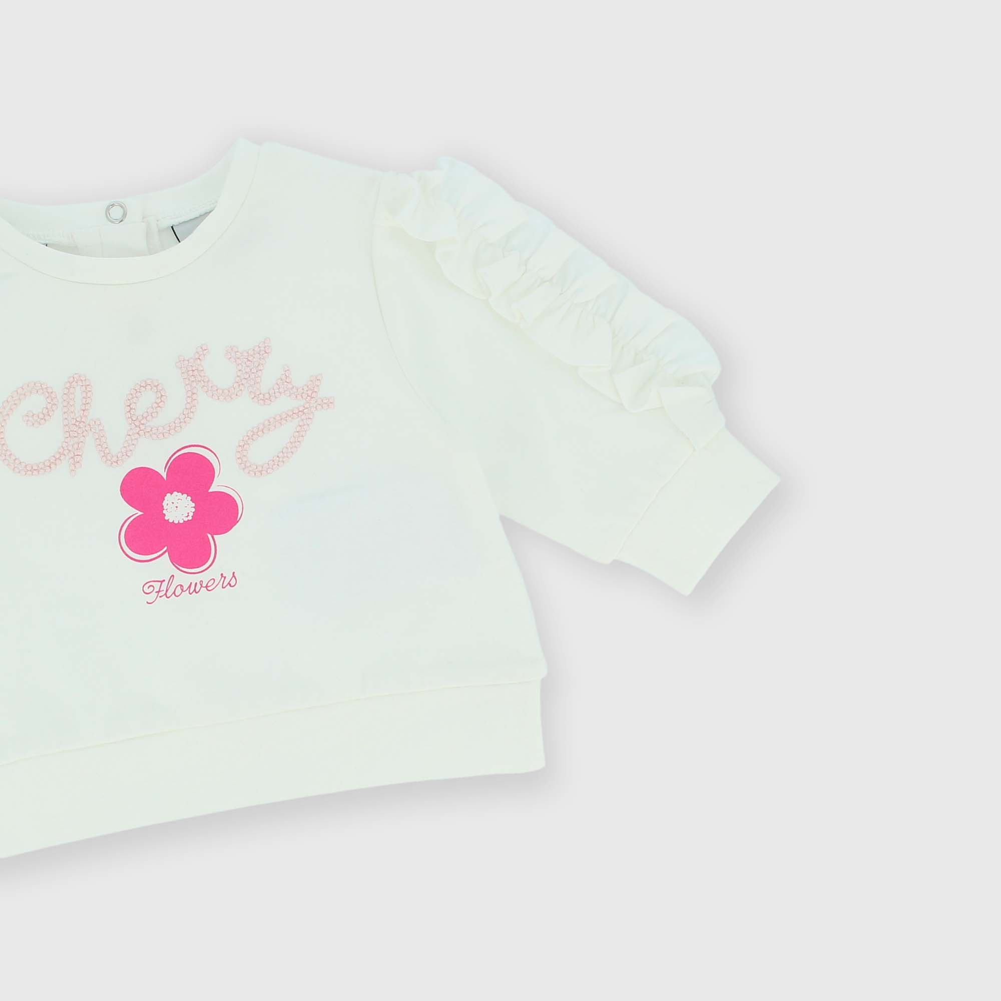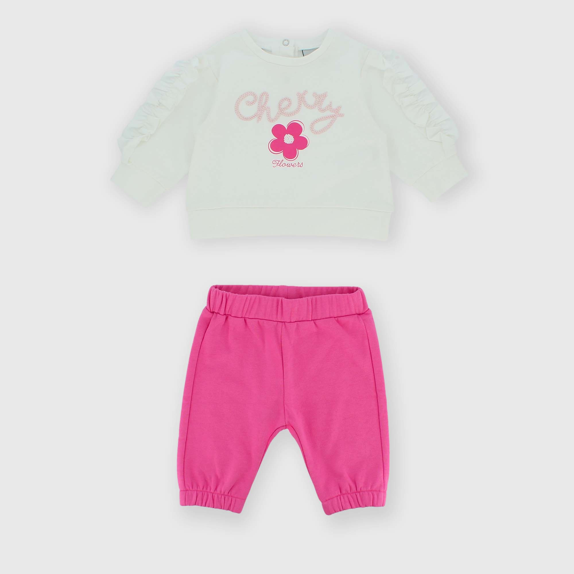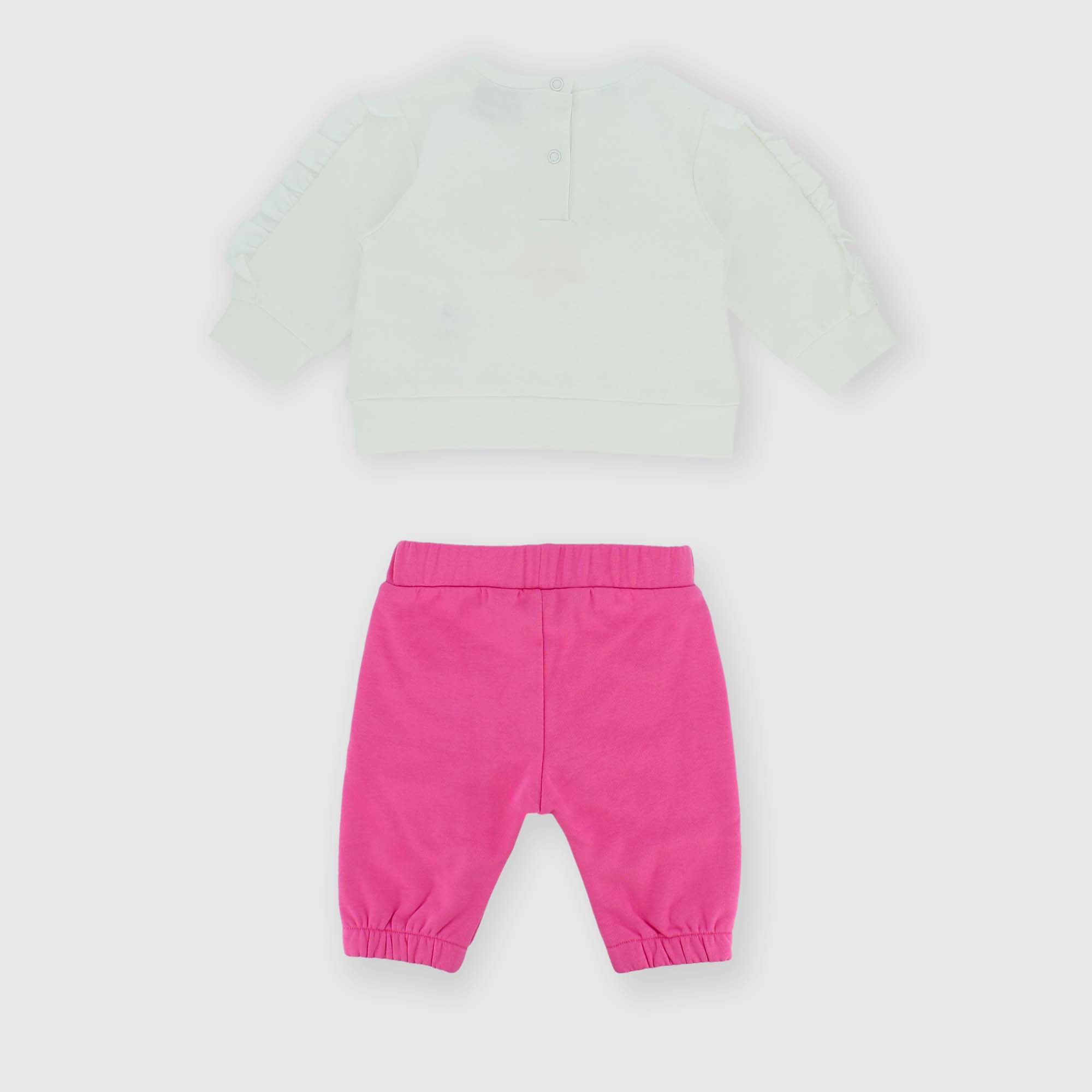Zweiteiliger Fleeceanzug. Sweatshirt mit Rundhalsausschnitt und langen Ärmeln mit aufgesetzten Rüschen. Rückenverschluss mit Druckknöpfen. Drucke und Stickereien auf der Vorderseite. Fleecehose mit elastischem Bund und elastischem Saum.