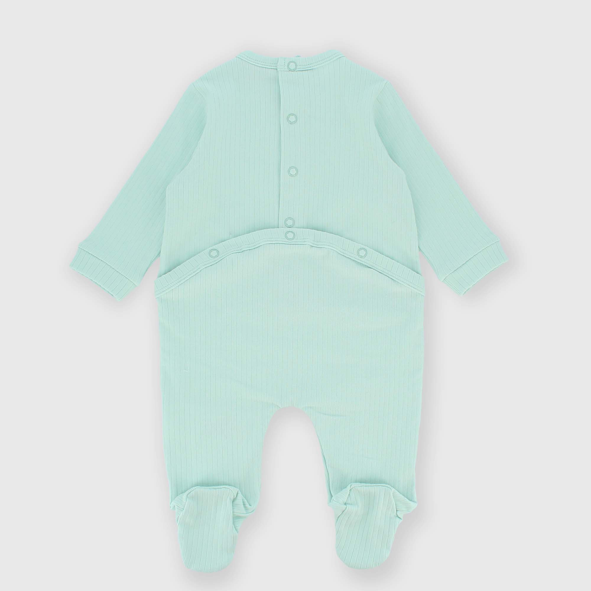 Gerippter Strampler, Rundhalsausschnitt, lange Ärmel. Gefälschte Knöpfe am Ausschnitt. Rückenverschluss mit Druckknöpfen.