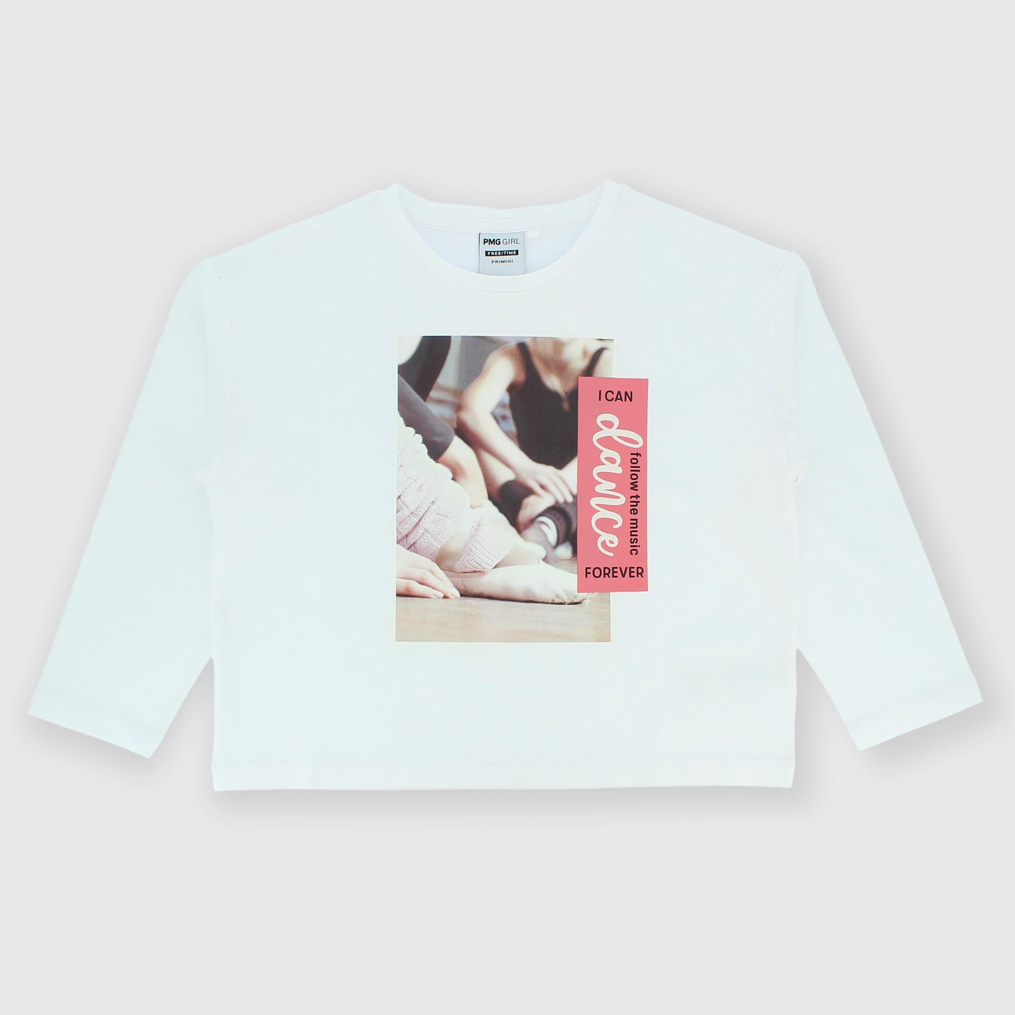 Jersey-T-Shirt, Rundhalsausschnitt, lange Ärmel. Fotodruck auf der Vorderseite.