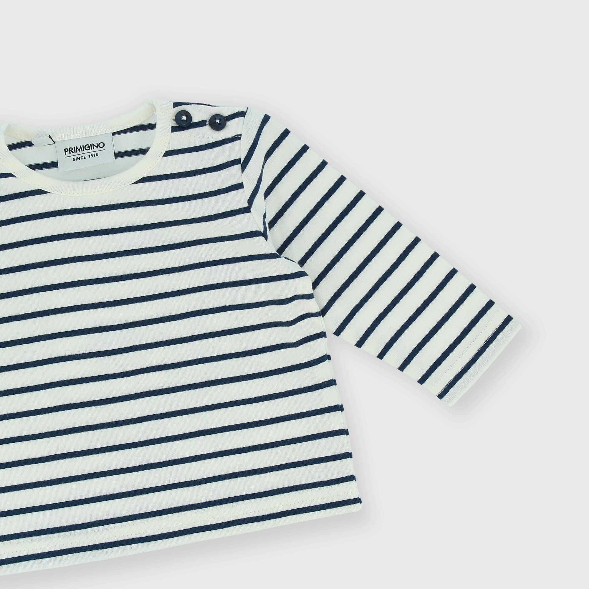 Garngefärbtes gestreiftes T-Shirt aus Jersey, Rundhalsausschnitt, lange Ärmel. Verschluss mit Knöpfen an der Schulter.