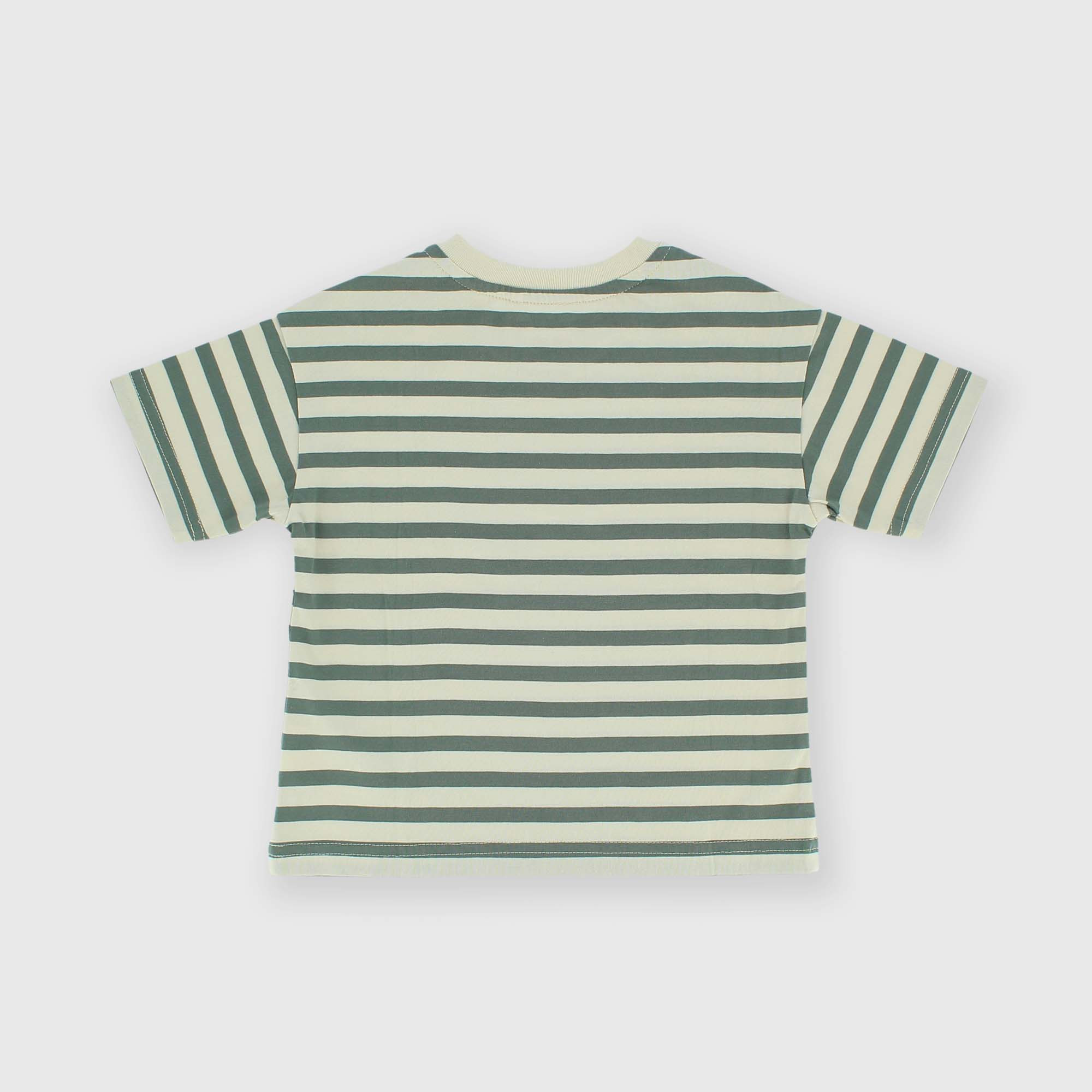 T-Shirt aus garngefärbtem, gestreiftem Jersey, Rundhalsausschnitt, kurze Ärmel. Druckknopfverschluss an der Schulter.