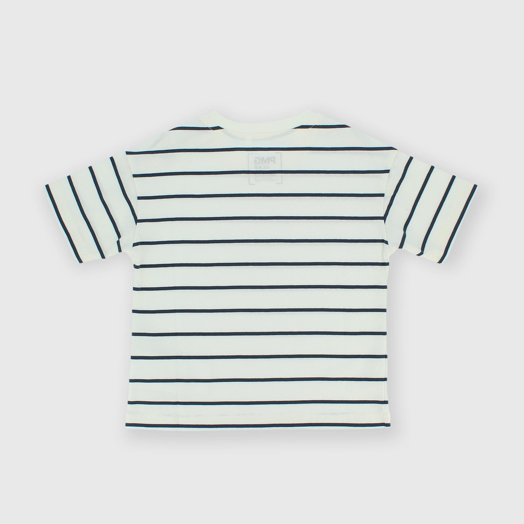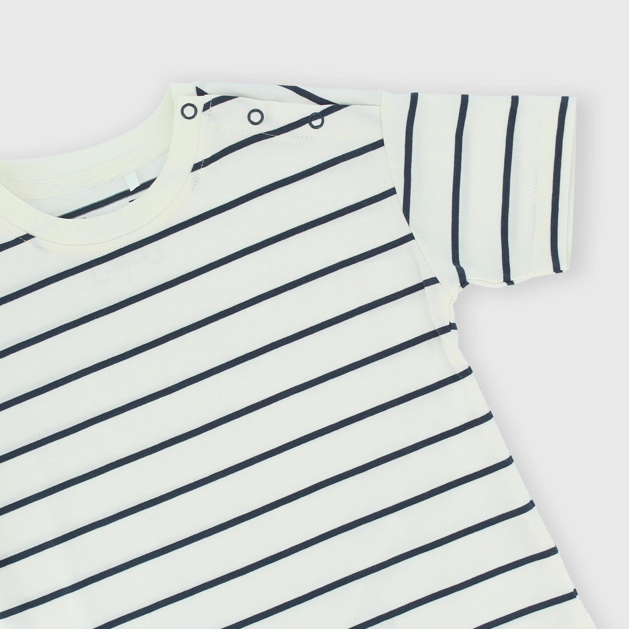 T-Shirt aus garngefärbtem, gestreiftem Jersey, Rundhalsausschnitt, kurze Ärmel. Druckknopfverschluss an der Schulter.