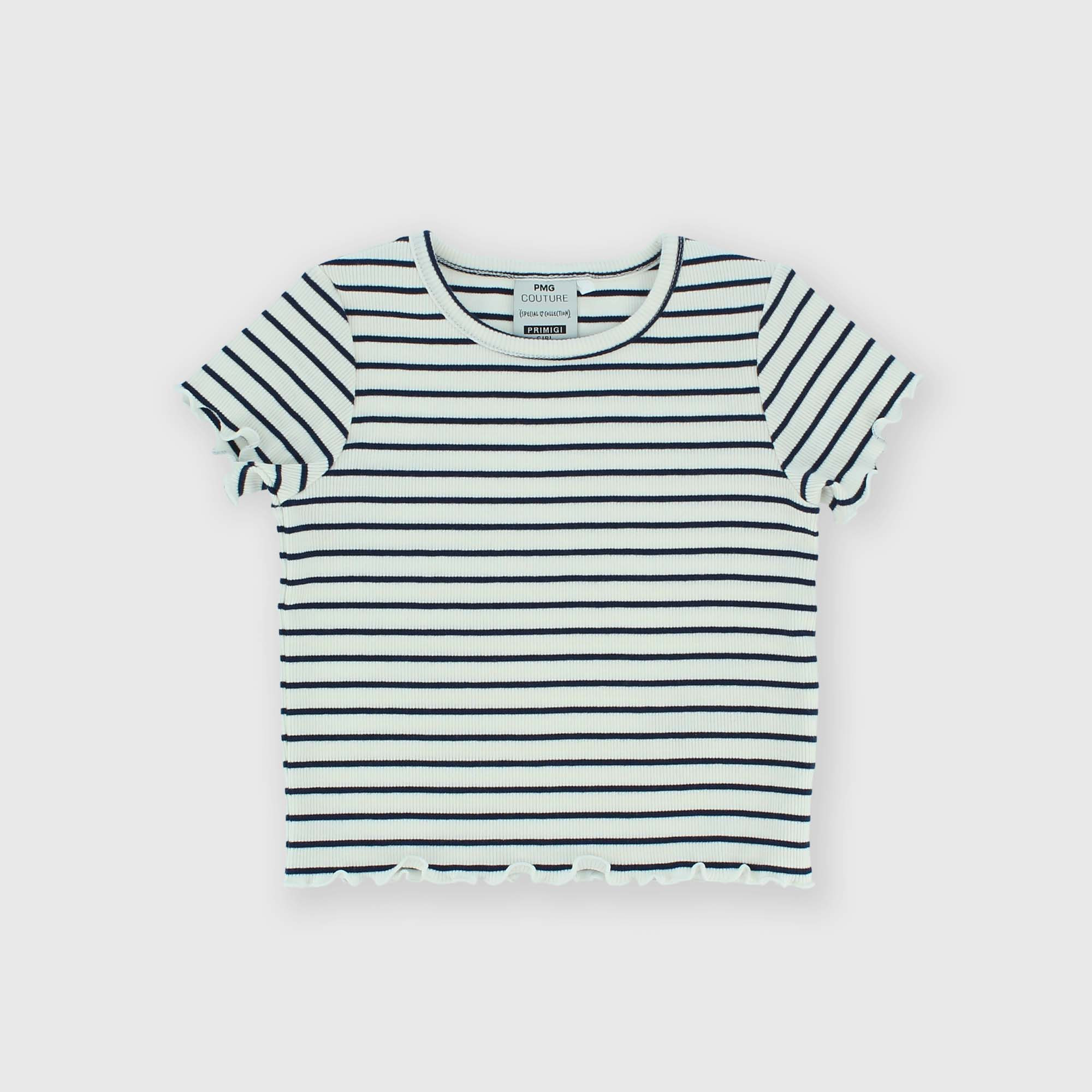 Garngefärbtes, gestreiftes, geripptes T-Shirt, Rundhalsausschnitt, kurze Ärmel. Puppenstich-Finishes.