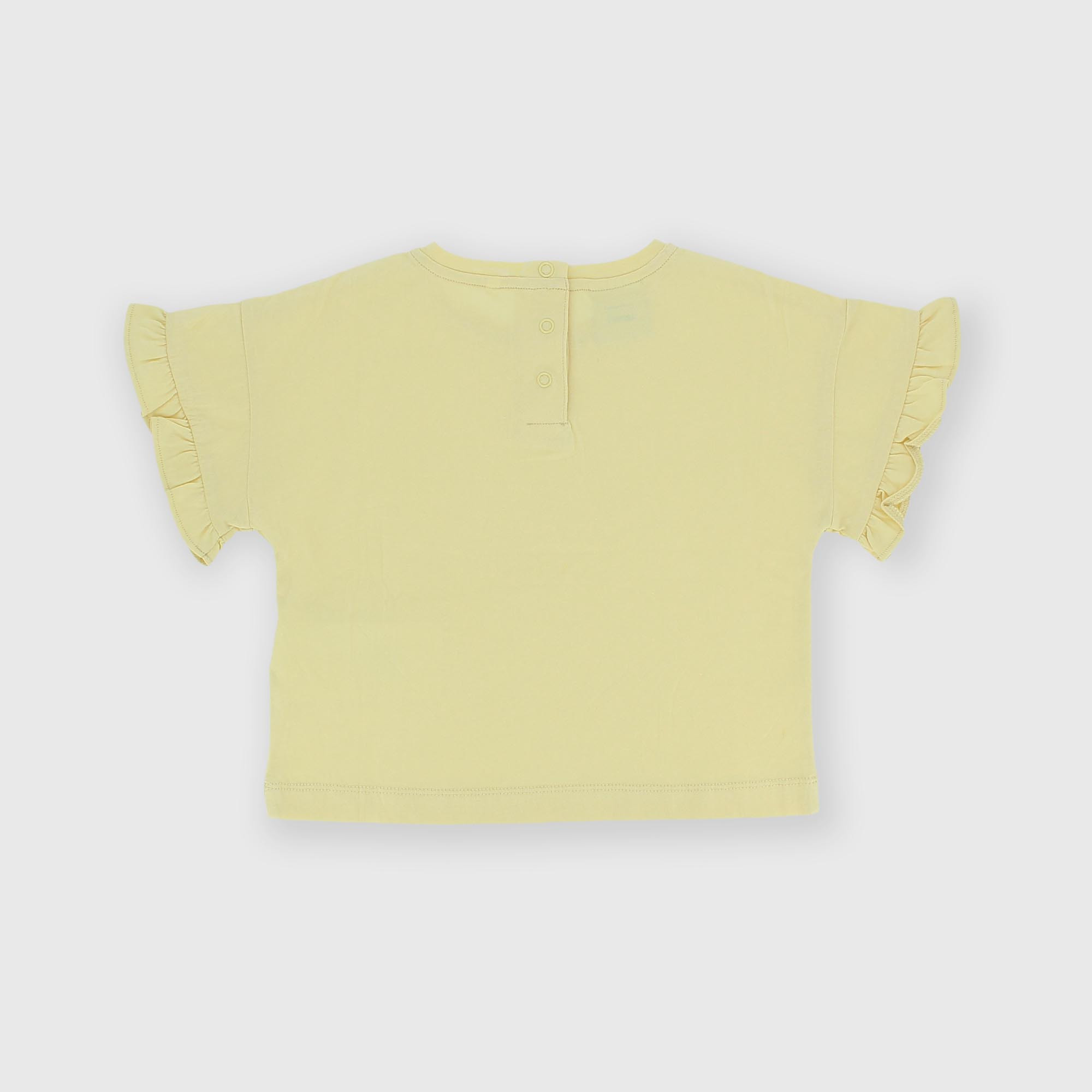 T-Shirt aus Jersey, Rundhalsausschnitt, kurzärmelig mit Rüschen. Druckknopfverschluss auf der Rückseite.