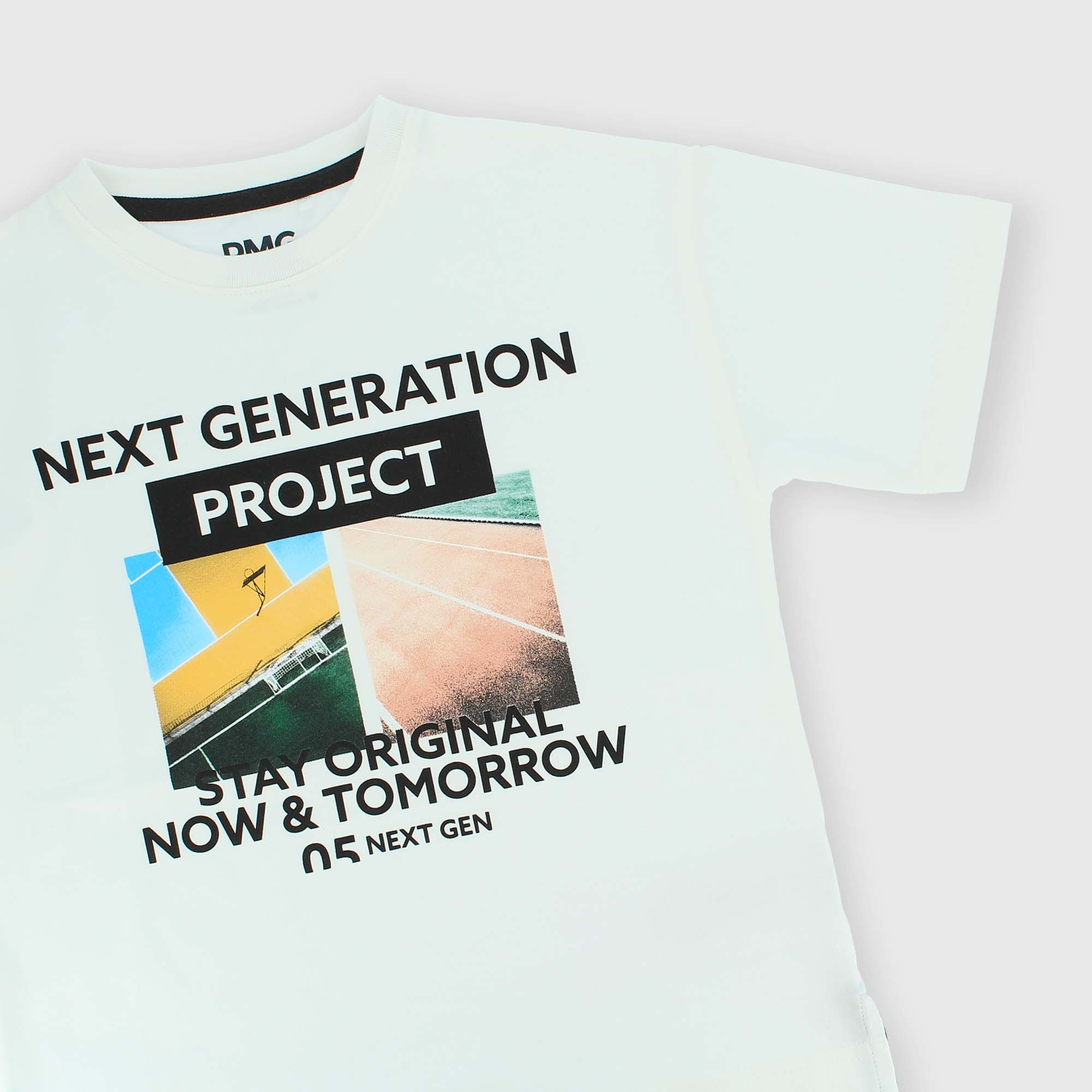 Jersey-T-Shirt, Rundhalsausschnitt, kurze Ärmel. Druck auf der Vorderseite. Seitliche Schlitze an der Unterseite.