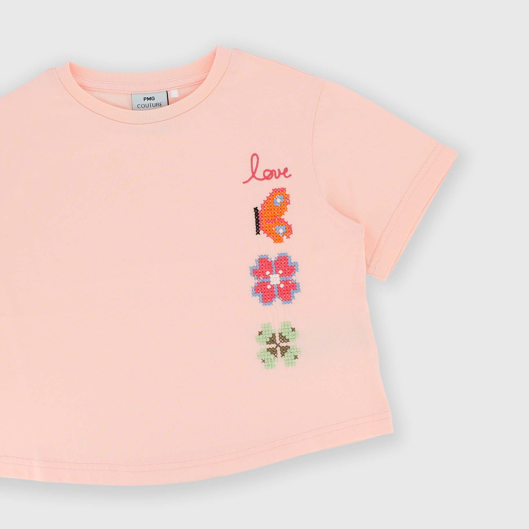 Jersey-T-Shirt, Rundhalsausschnitt, kurze Ärmel. Stickerei auf der Vorderseite.