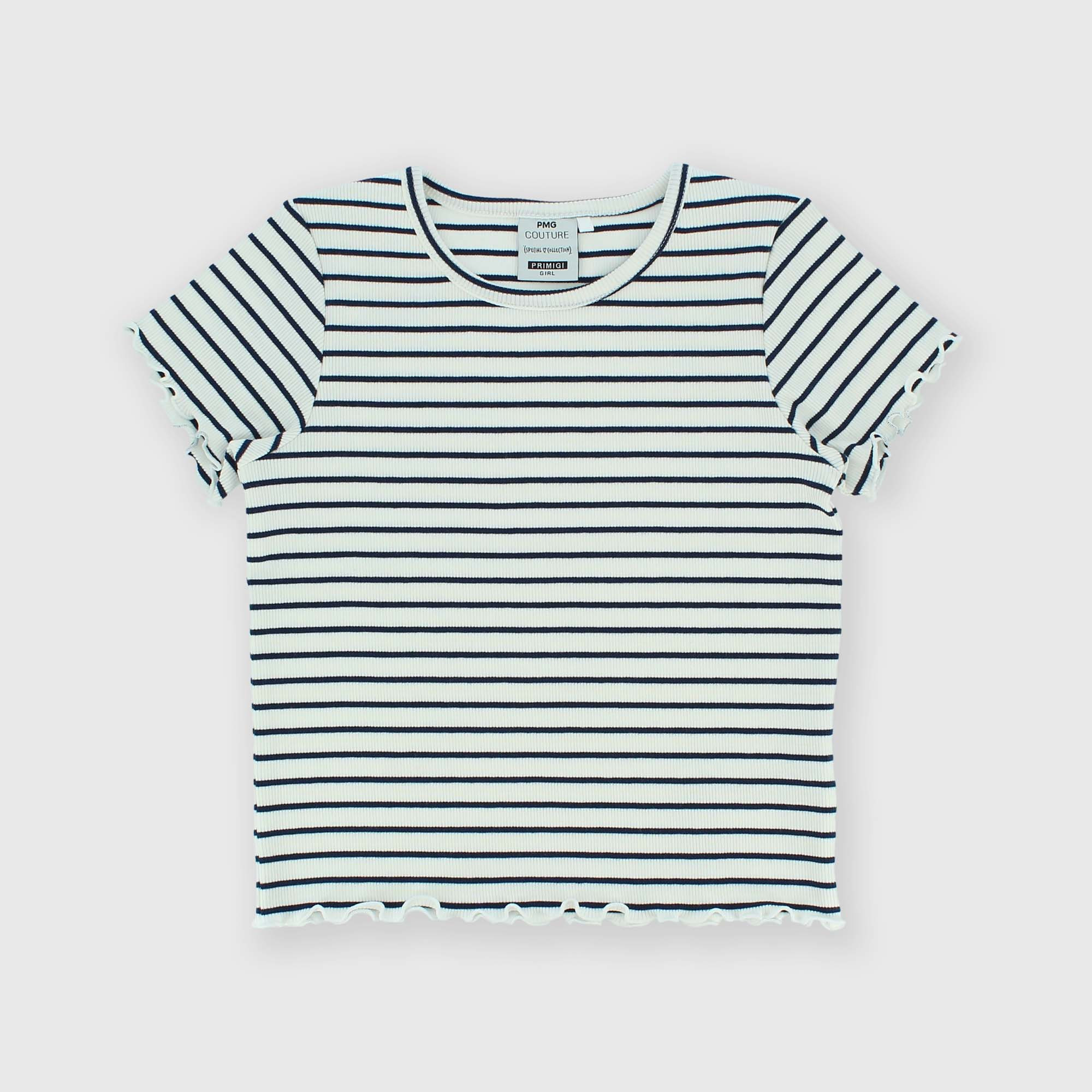 Garngefärbtes, gestreiftes, geripptes T-Shirt, Rundhalsausschnitt, kurze Ärmel. Puppenstich-Finishes.