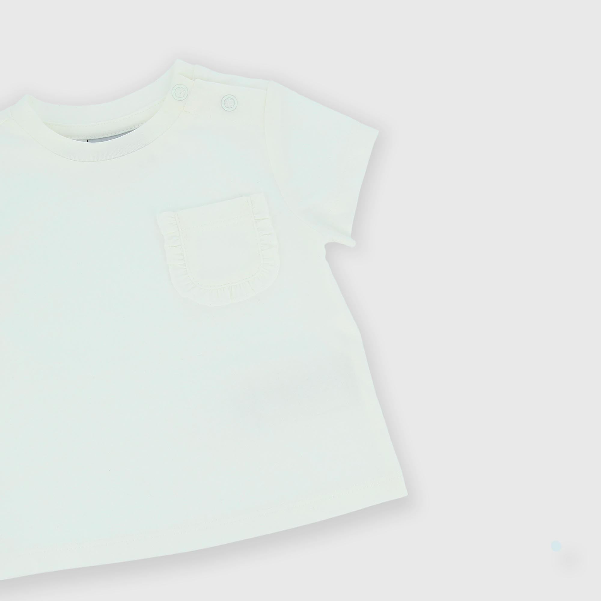 Jersey-T-Shirt, Rundhalsausschnitt, kurze Ärmel. Druckknopfverschluss an der Schulter. Rüschentasche auf der Brust.