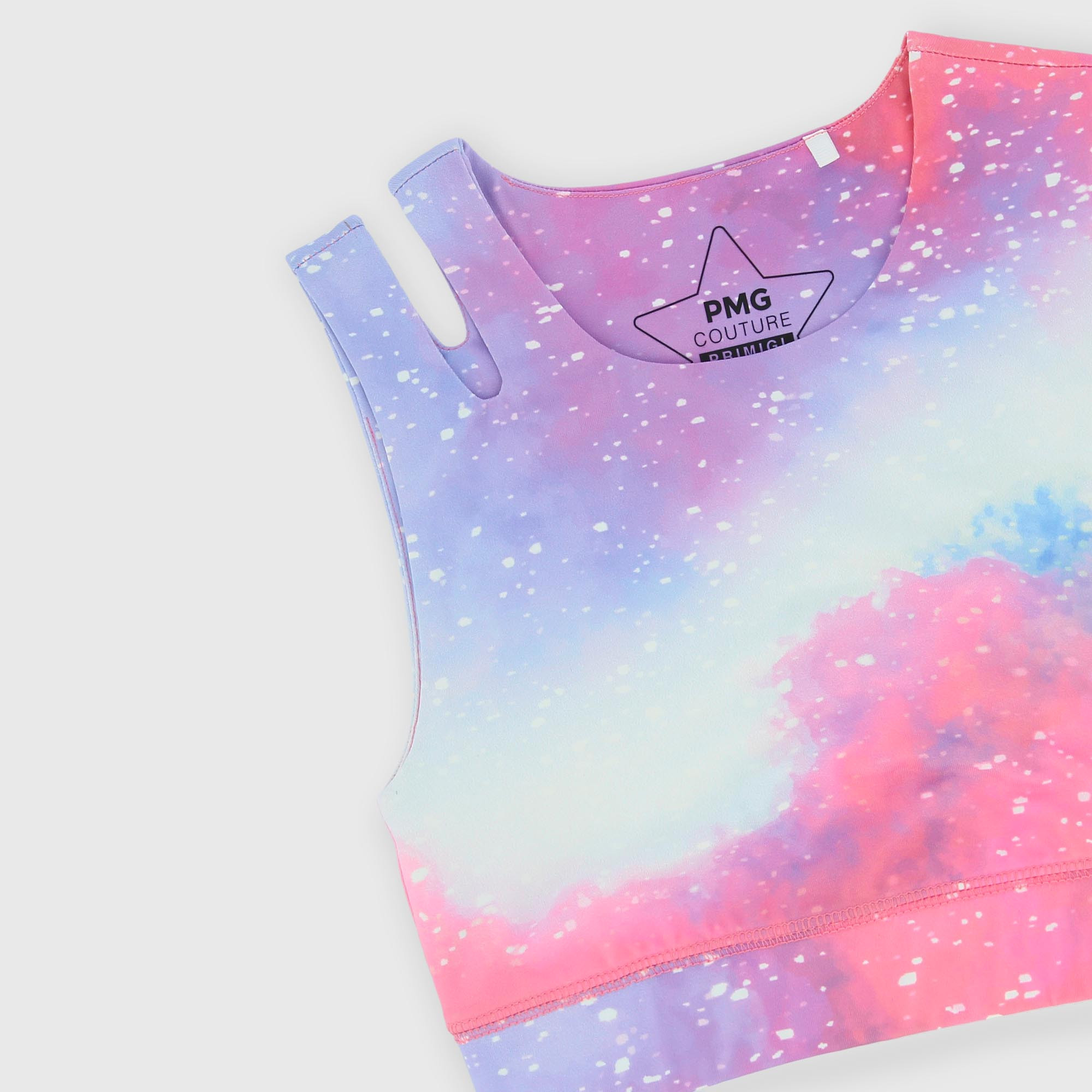 Oberteil aus technischem Gewebe, Rundhalsausschnitt, ärmellos. Allover-Druck. Elastische Unterseite.